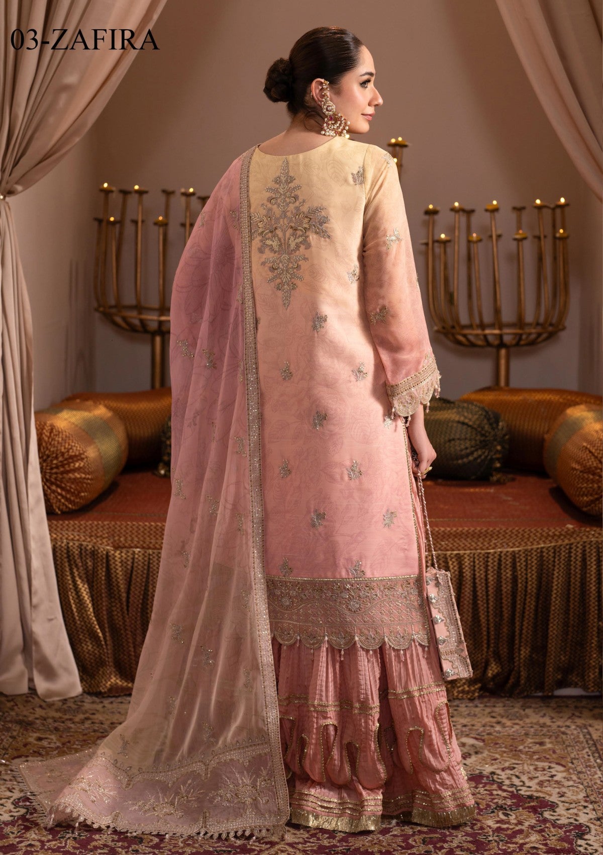 Zafira a stunning shirt rendered in subtle tones of lime yellow and pink featuring embroidery and contrasting threadwork on a soft chiffon fabric. It is elegantly paired with a chiffon dupatta and tonal raw silk trousers. This ensemble is ideal for any occasion this season.