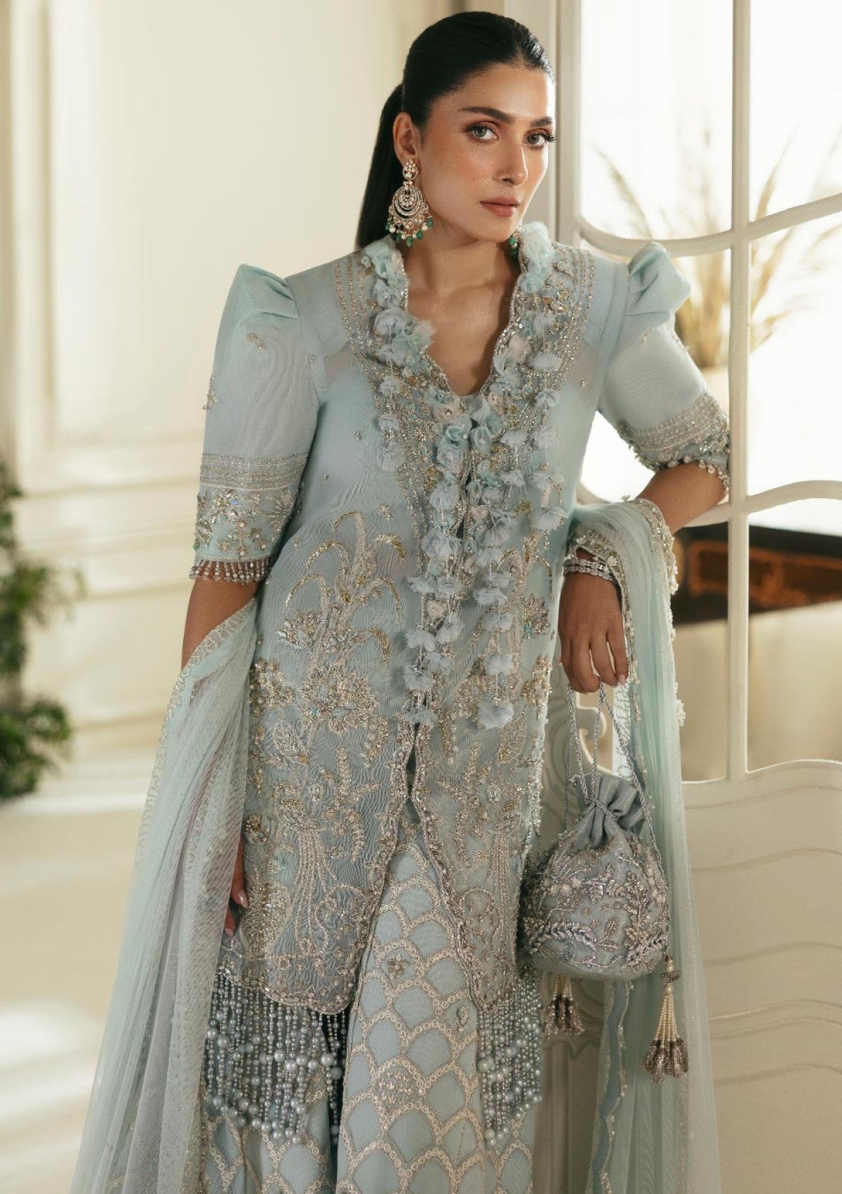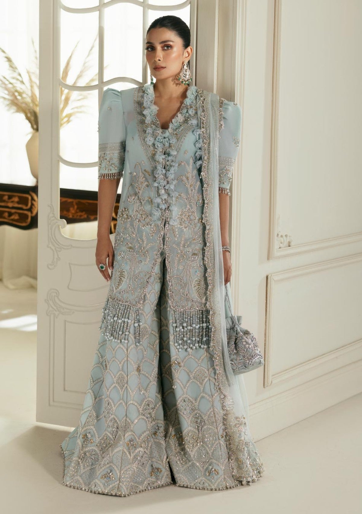 Unveiling 'Ciel de Rêve' (Sky of Dreams) from Élan's wedding festive collection. Soft blue hues whisper serenity, as intricate embroidery unfurls dramatic foliage and motifs. Silver tinsel and sequins shimmer, hand-embellished with luminous silver pearls, Swarovski crystals, delicate beads and metal wire details.