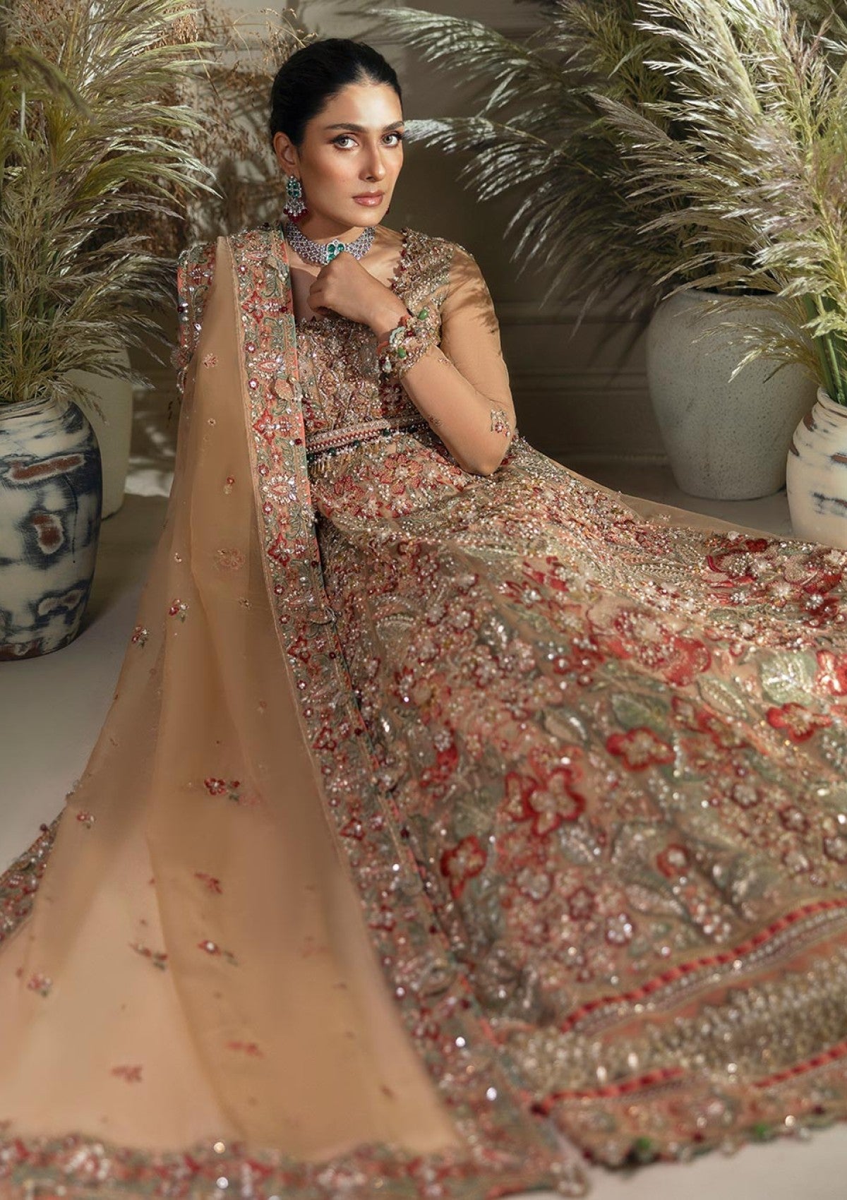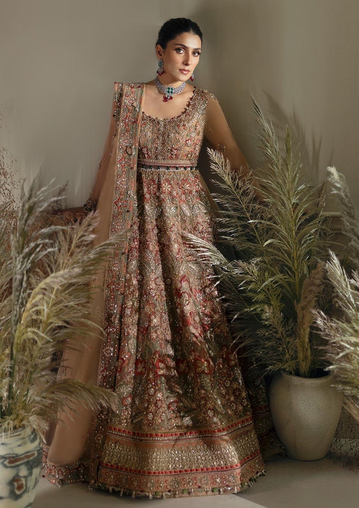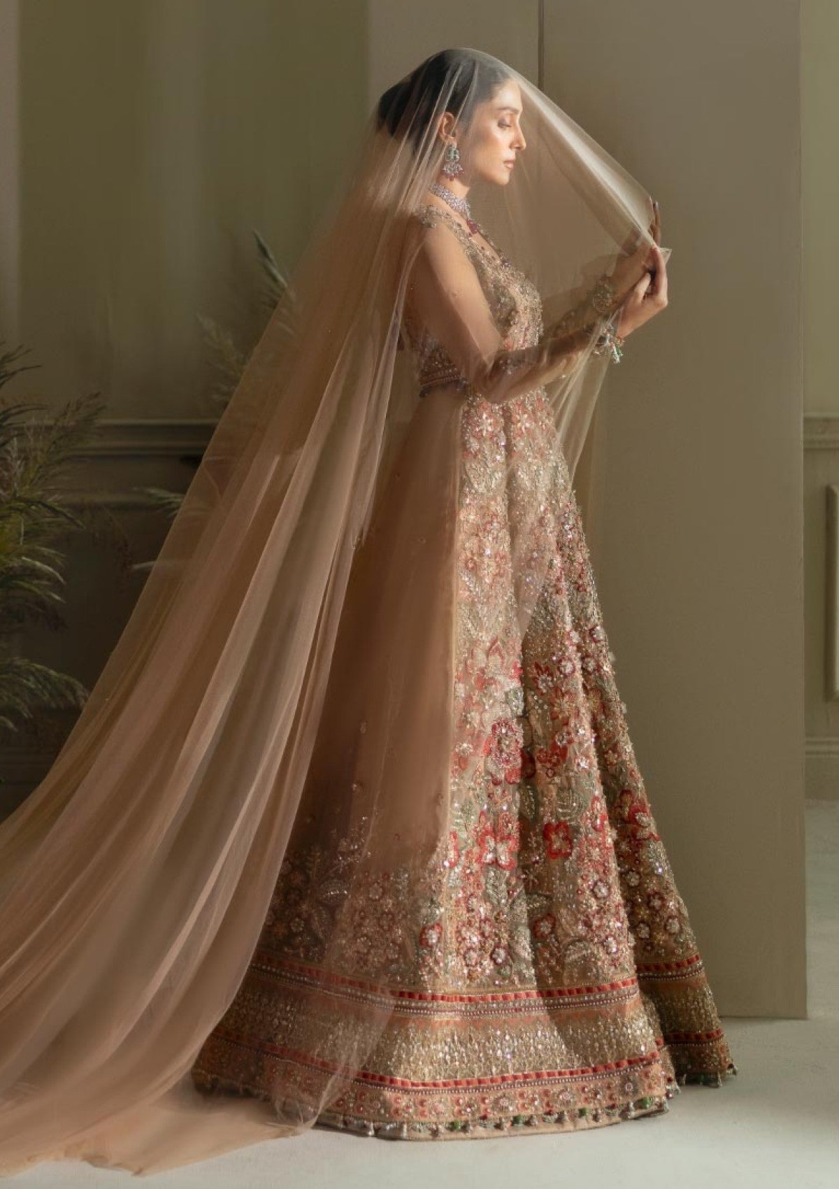 Élan's 'Mystic Champagne'—a breathtaking masterpiece that embodies sun-drenched elegance. Its soft beige and golden hues evoke sunlight dancing on tranquil waters, enveloping the wearer in a radiant glow. Hand-embellished with delicate seed pearls, luminous Swarovski crystals, and shimmering tinsel, every detail whispers luxury.