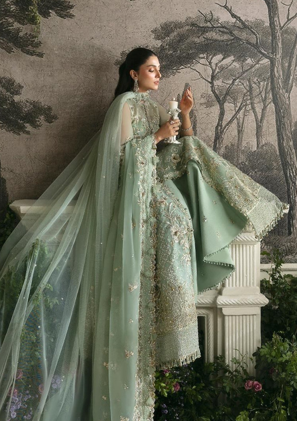 A cascading silhouette flows effortlessly, accompanied by a delicate floral filigree stole. Romance meets refinement in this couture masterpiece from Élan's wedding festive collection.