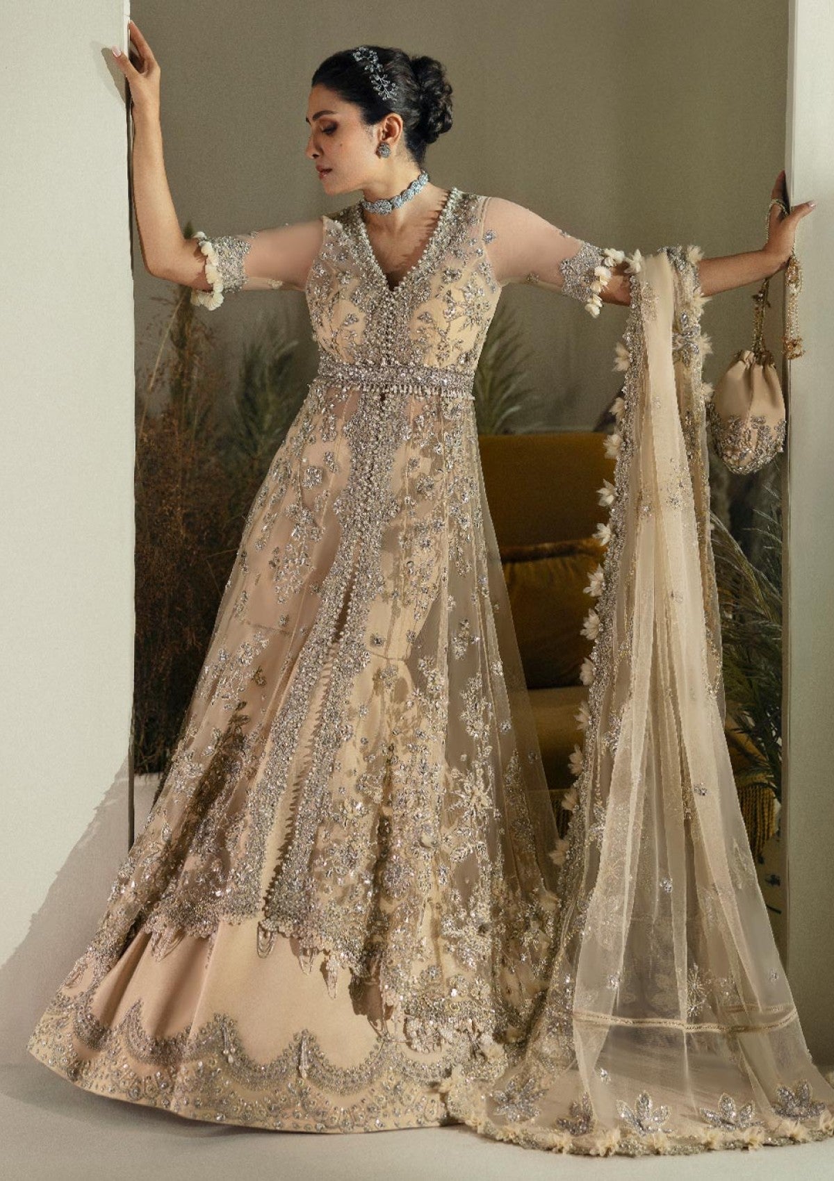 The silhouette cascades gracefully, mirroring the gentle rhythm of serene tides, while an exquisite floral filigree stole drapes elegantly over the shoulders, reminiscent of ethereal petals floating on a calm sea. ‘Pearl of Tranquility’ beautifully marries romance and refinement, capturing the essence of haute couture from Élan's wedding festive collection.