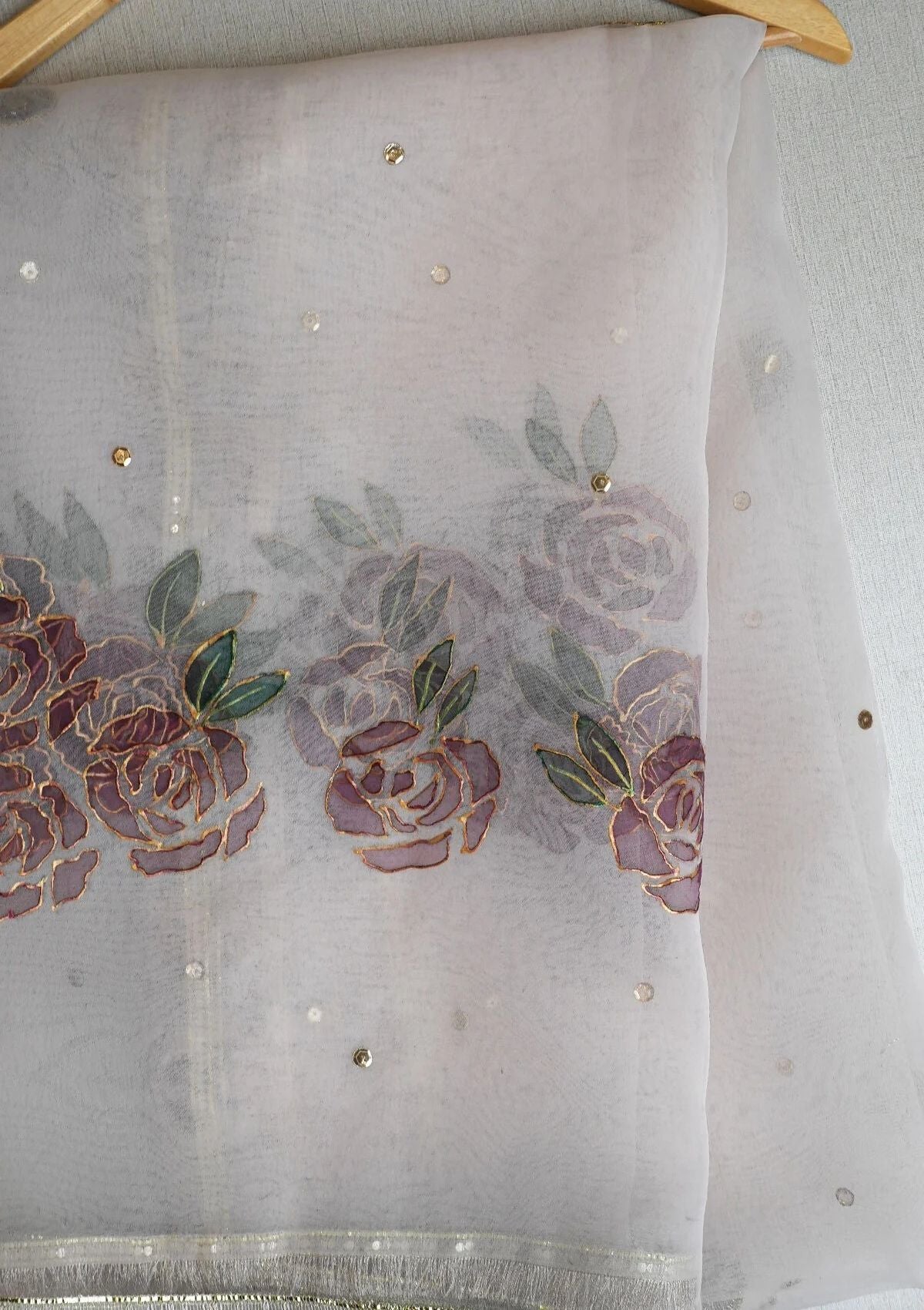 Embellishment on Dupatta: Handpainted flowers and leaves, Kiran Lace, Gotta work, Pearls