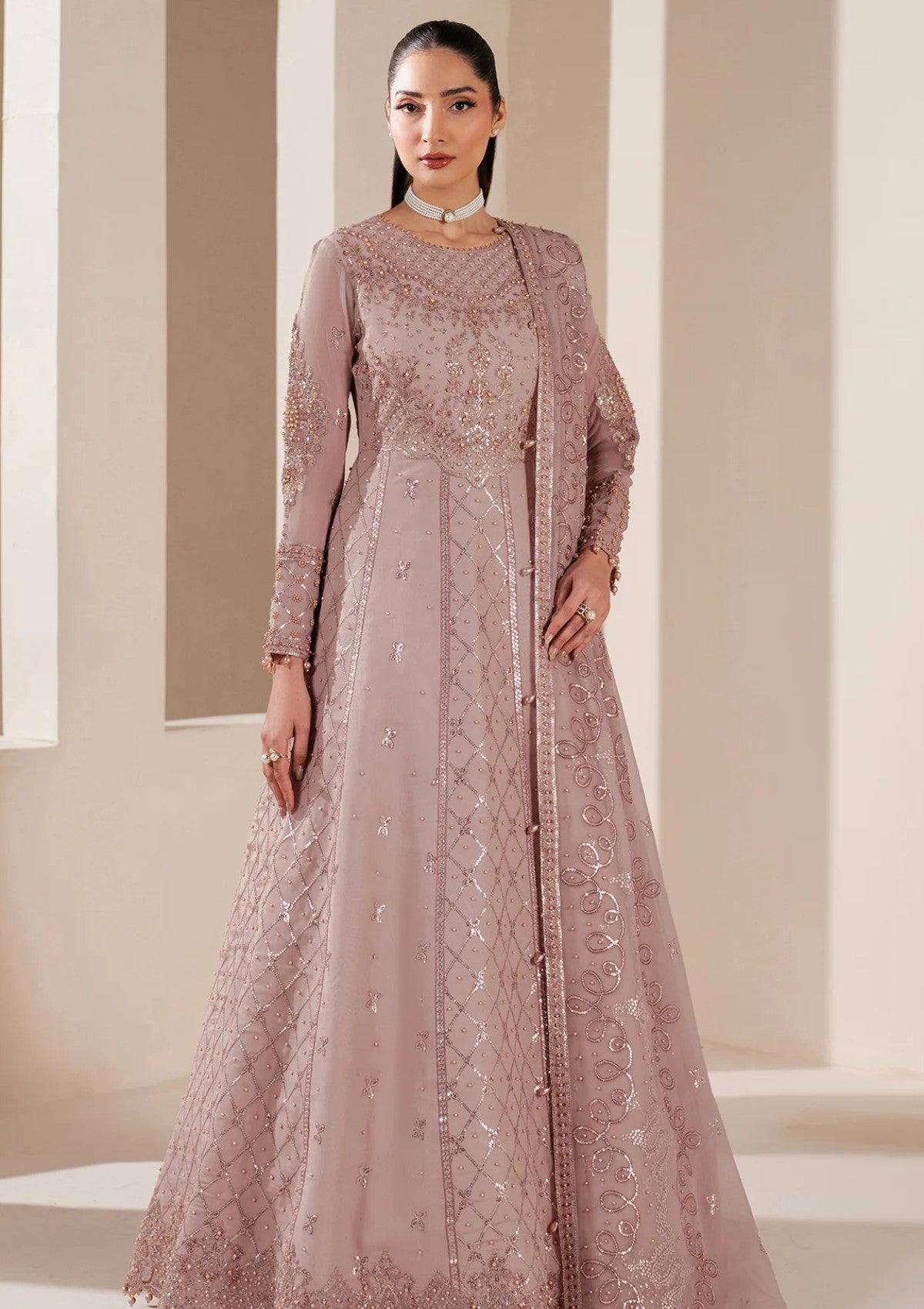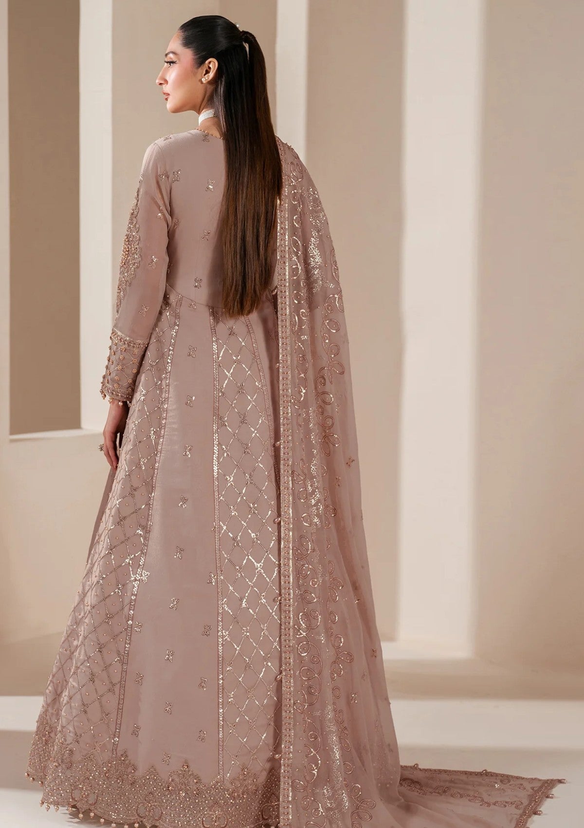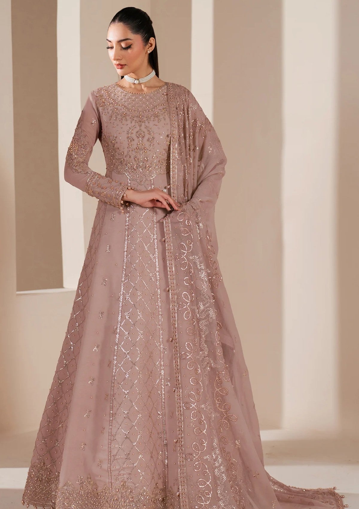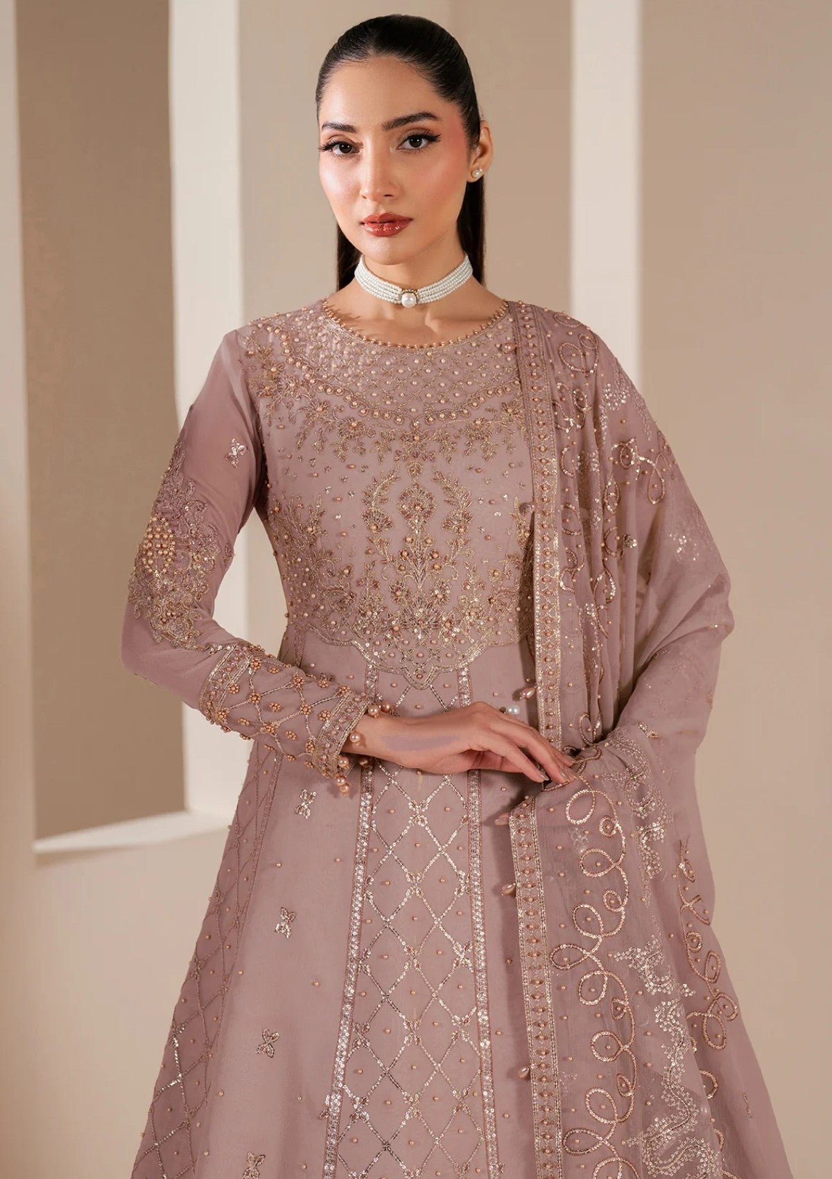 The "Saffron" ensemble in soft pink radiates timeless elegance, adorned with intricate pearl embellishments on a luxurious chiffon base. The meticulously crafted neckline, highlighted with gold embroidery, adds an extra touch of sophistication. Paired with a chiffon dupatta featuring a delicate embroidered border and raw silk trousers, this outfit creates a flawless, formal look.