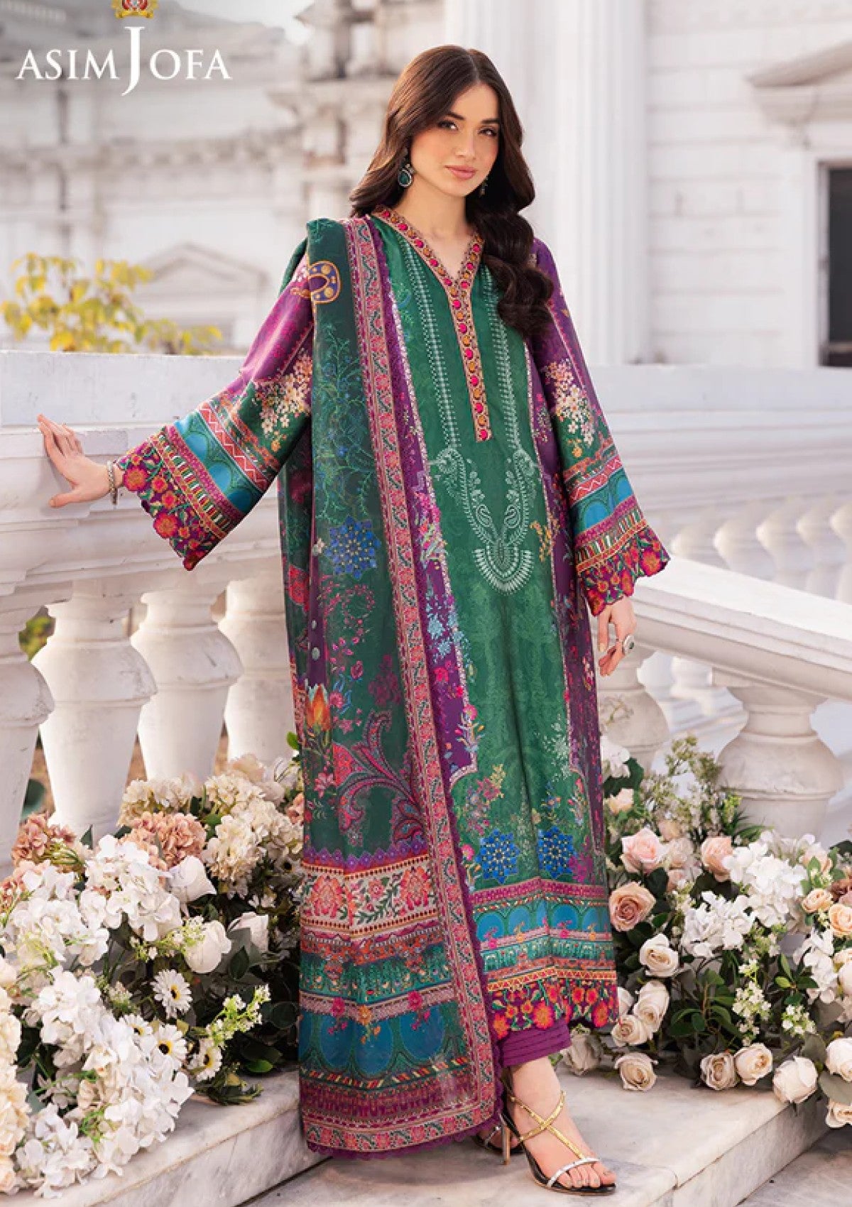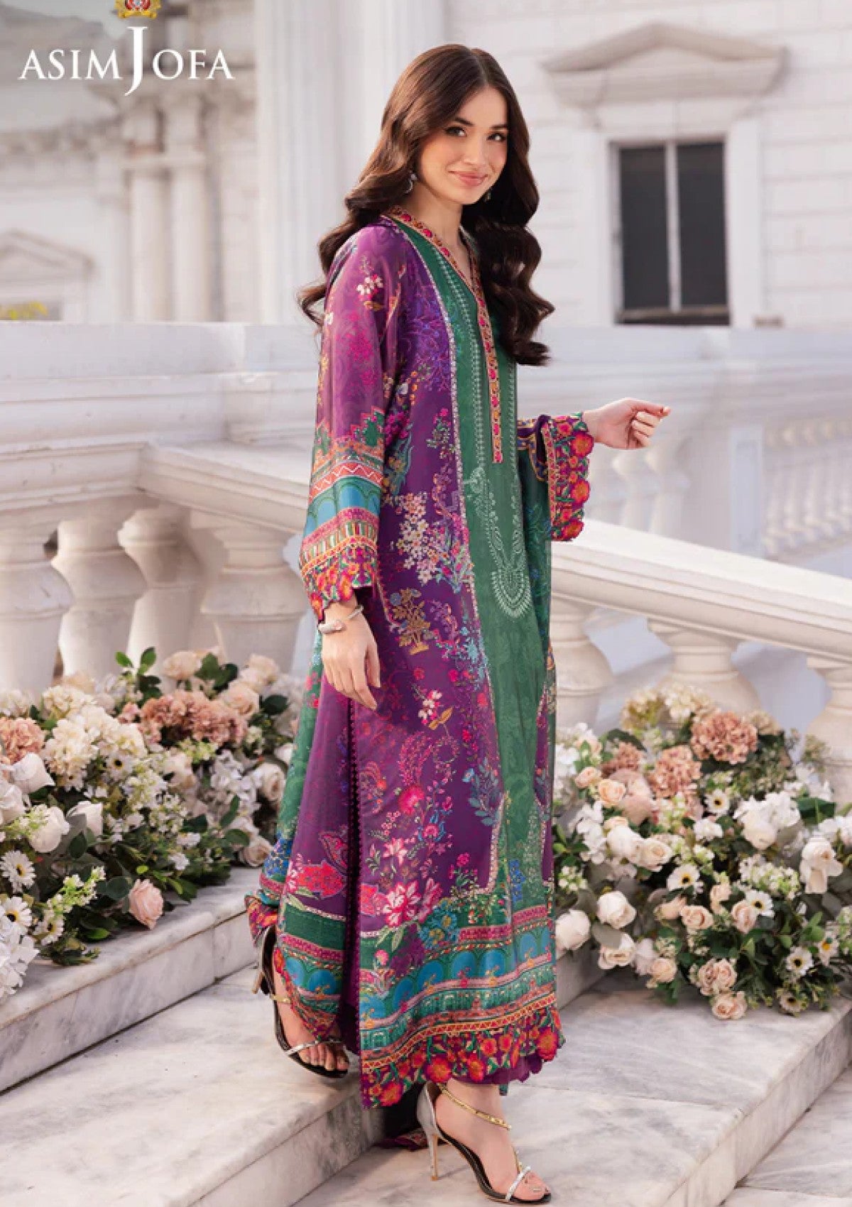 The essence of traditional prints radiates through this striking olive green and magenta ensemble, where unique design bloom like a garden blessed with colors. The digitally printed shirt features a delicately embroidered neckline capturing the heart of floral elegance, while the sleeves and borders, adorned with intricate embroidery, add layers of grandeur. Complemented by a flowing digitally printed silk dupatta that drapes like a poetic breeze, this ensemble effortlessly transitions between formal grace and casual allure, making it a statement of undeniable beauty.