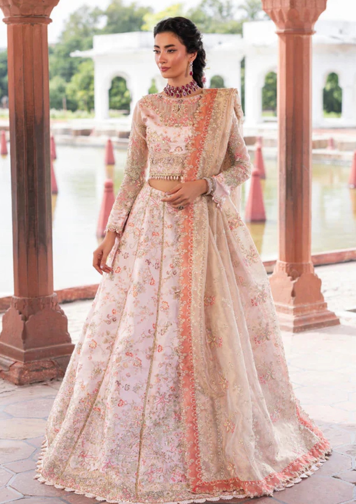Soft, romantic, and exquisitely detailed Silkstone from the Ember Collection is a poetic blend of tradition and modern allure. Dressed in delicate off white, this hand-embellished lehenga choli features intricate craftsmanship across its front body and sleeves, paired with digitally printed and embroidered shamoz silk panels that exude refined elegance. The look is elevated with an embroidered zari dupatta bordered on all four sides and a richly adorned lehenga border, creating a silhouette that shimmers with festive grace.