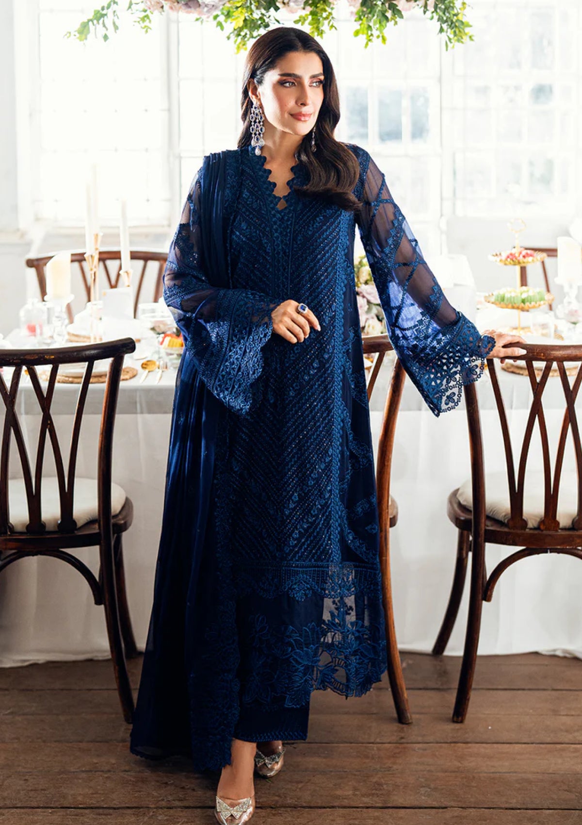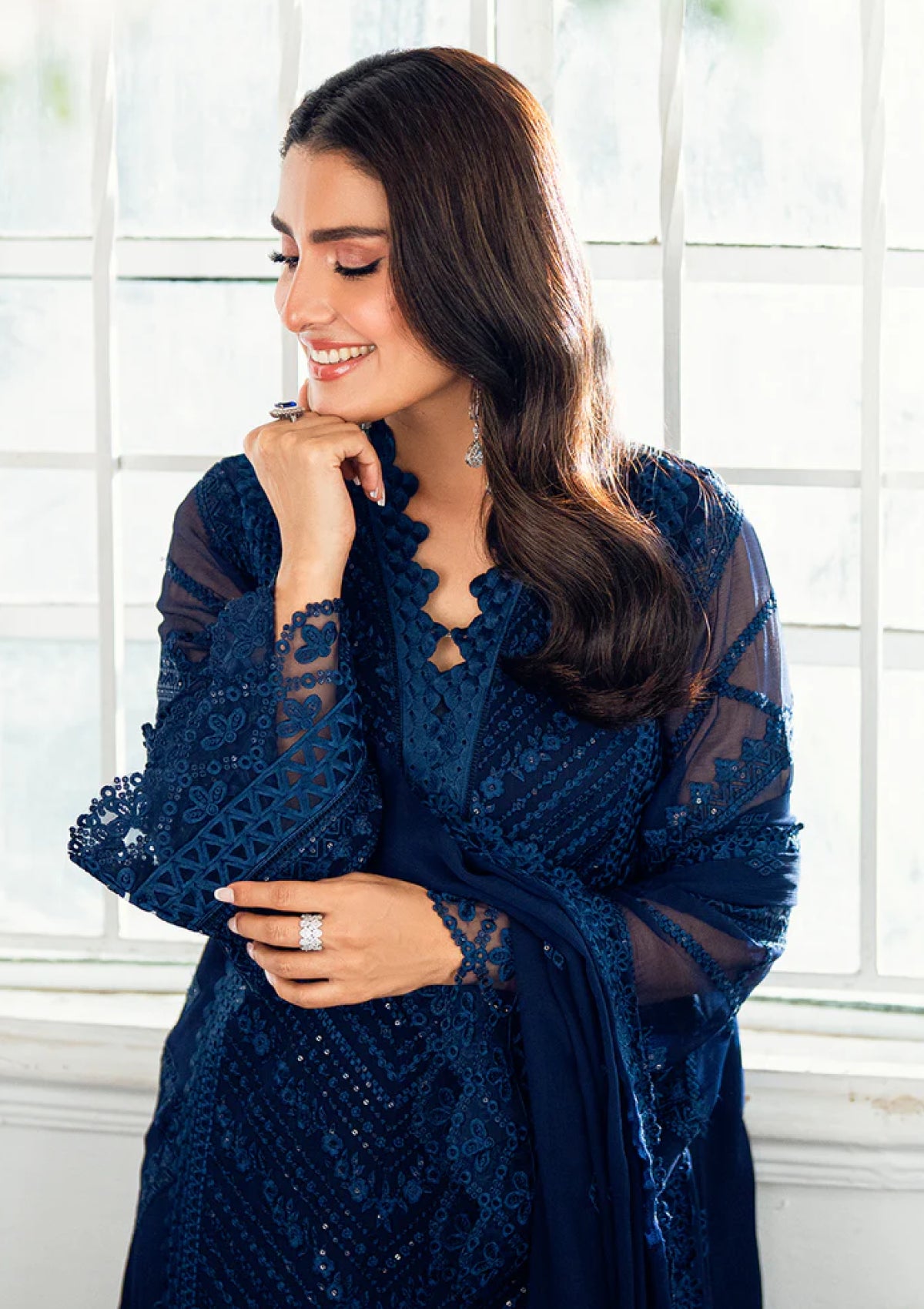 Embrace timeless elegance with Imperial Midnight, a stunning navy blue ensemble crafted from luxurious chiffon. The ethereal beauty of its sequins-embroidered chiffon dupatta adds a luminous touch, making it the perfect choice for a sophisticated festive look. Drape yourself in royalty this season.