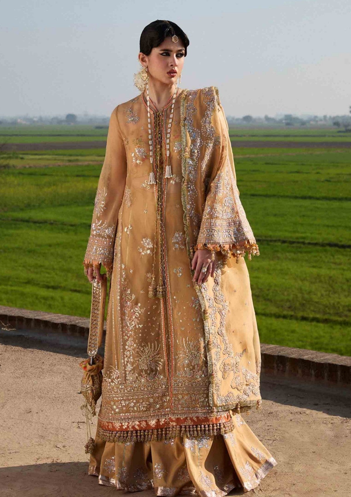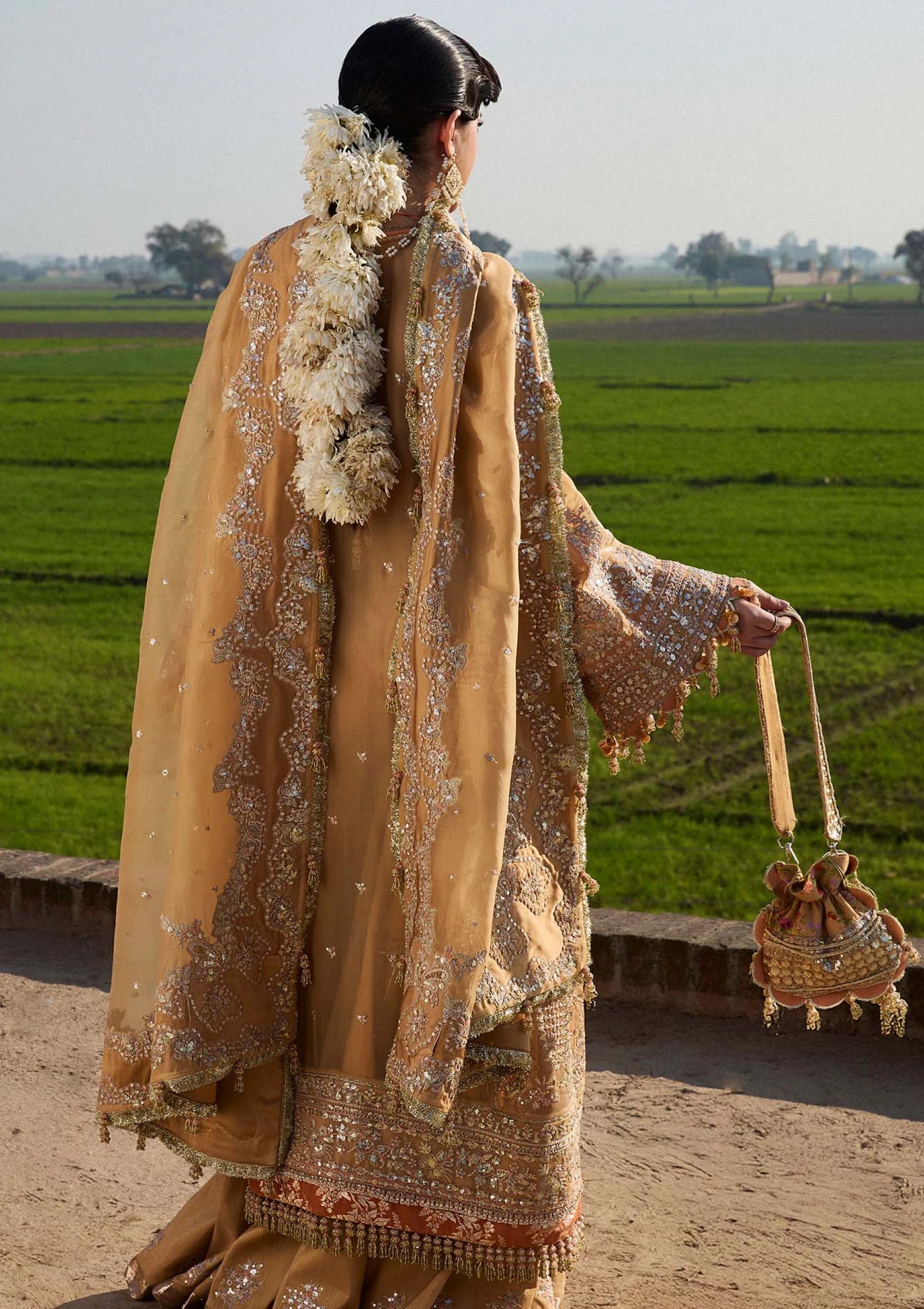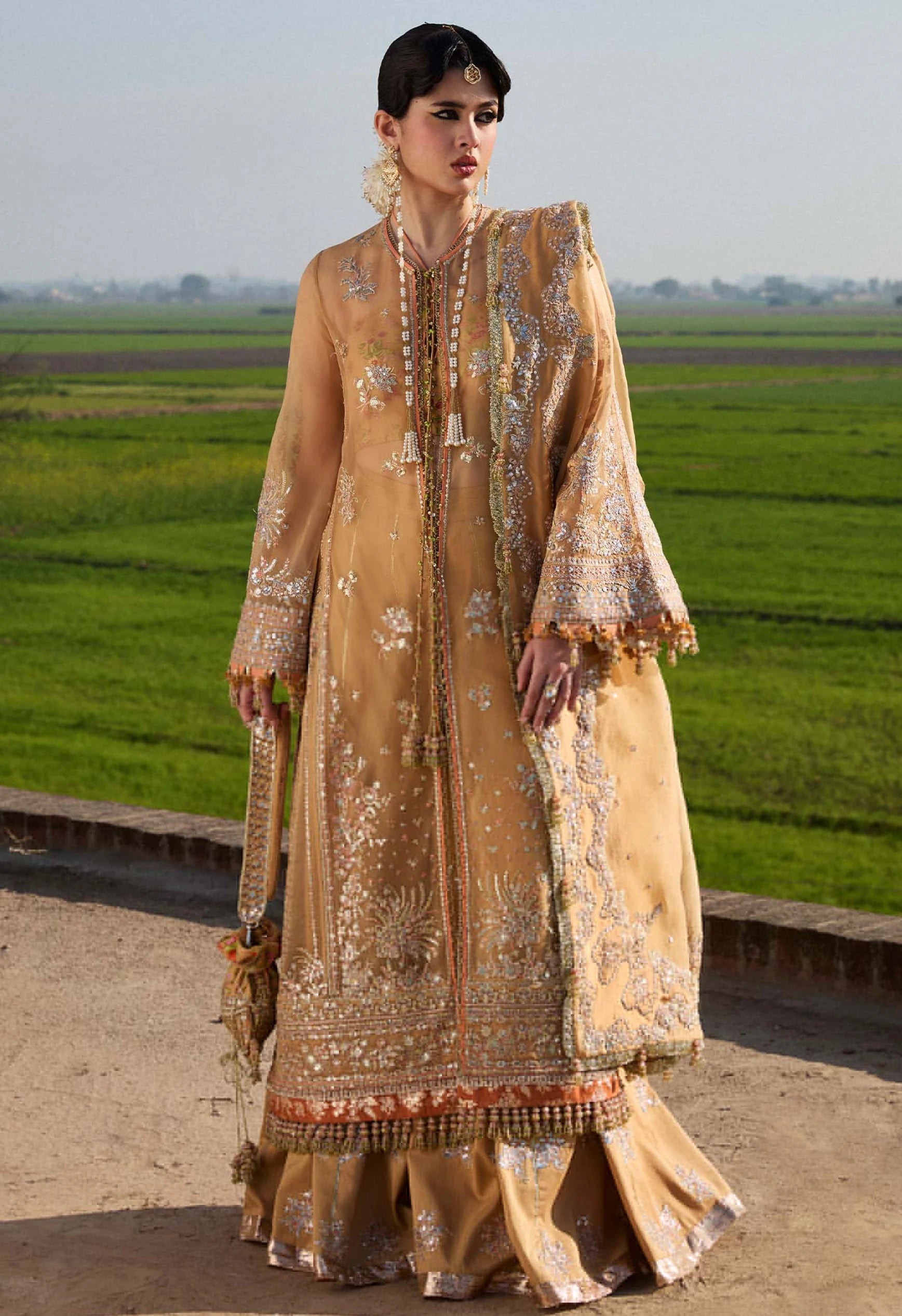 The organza jacket, composed of intricate sequin embroidery, is paired with a Korean raw-silk printed inner, creating a beautiful amalgamation of fabrics. The Korean raw-silk sharara, adorned with sequins embroidery, adds a touch of elegance. Heavy embroidered organza dupatta borders add a glamorous touch to the overall attire. This outfit is both elegant and beautiful, making you feel like a true fashion icon.