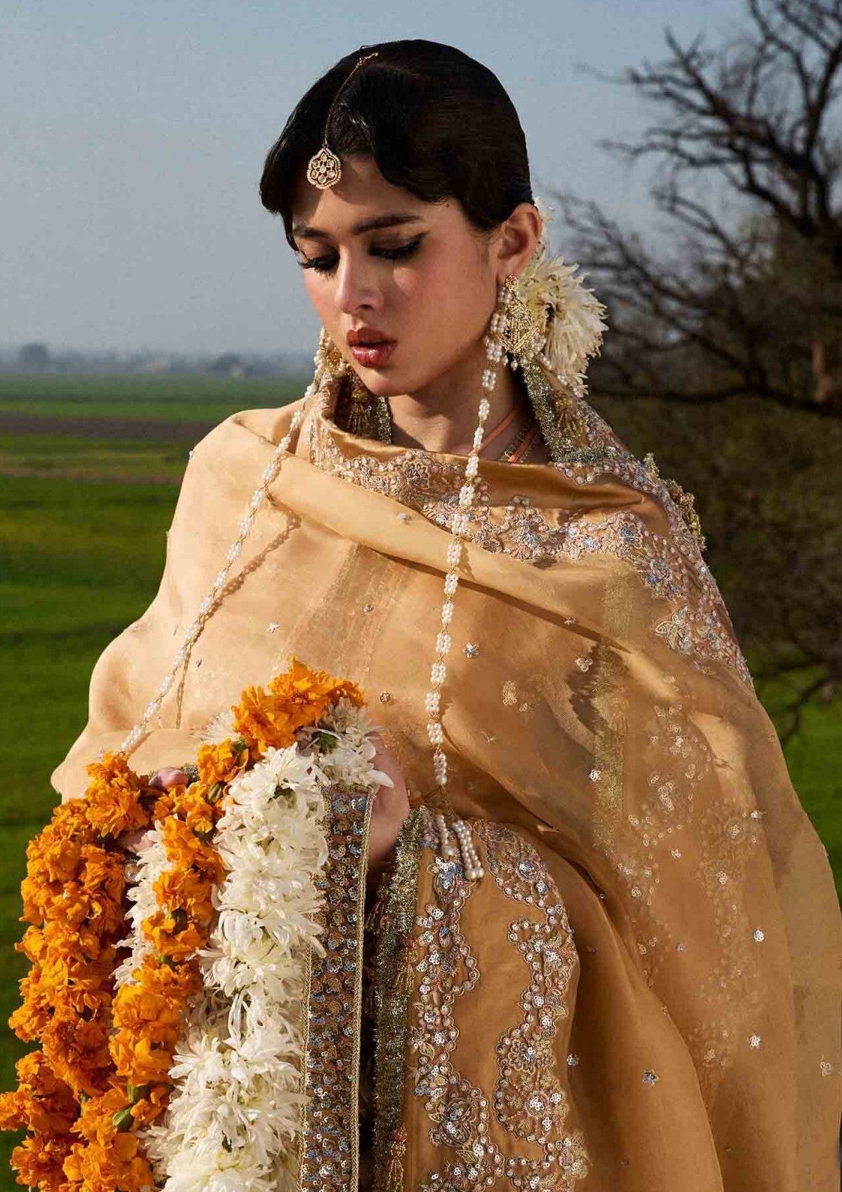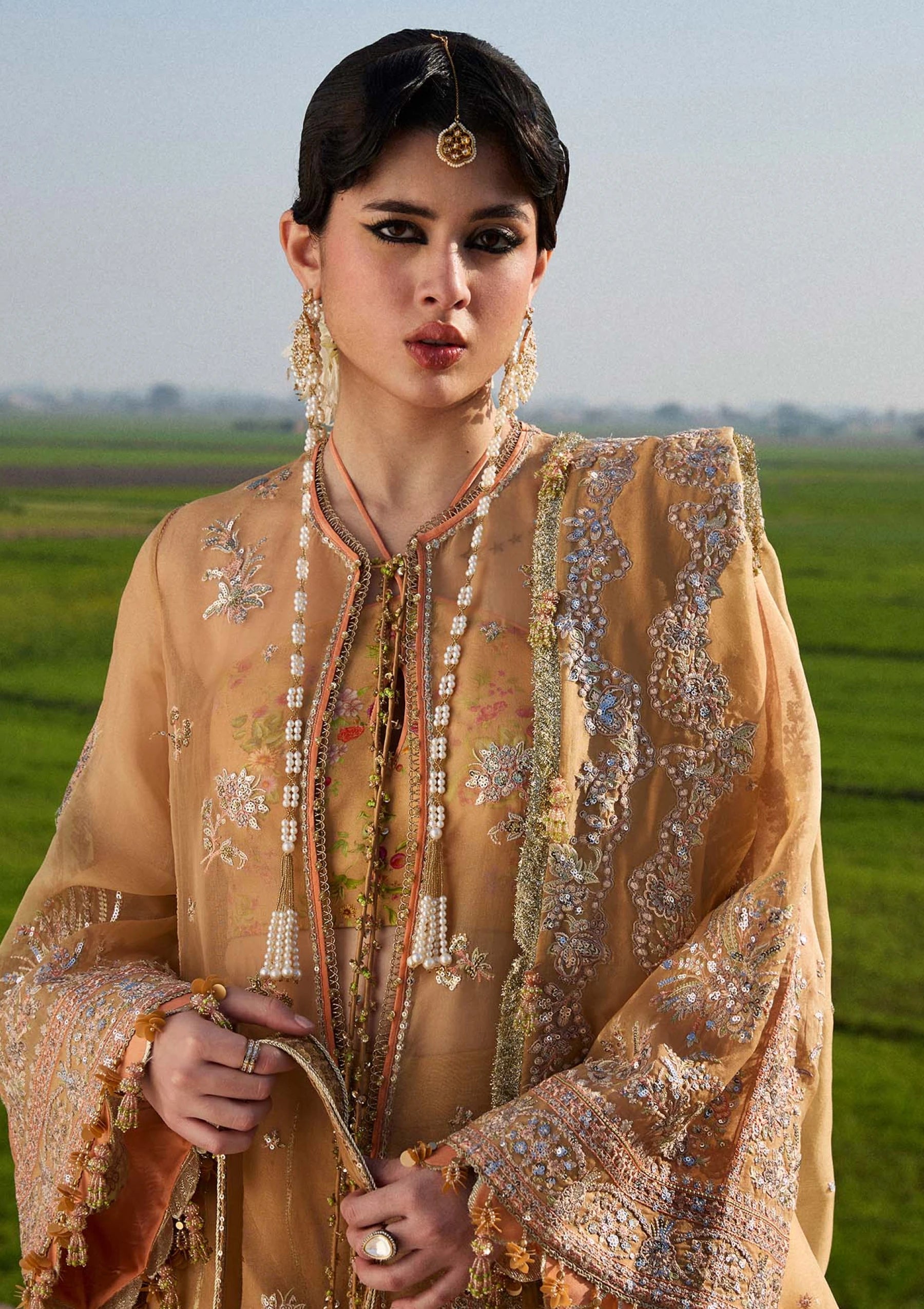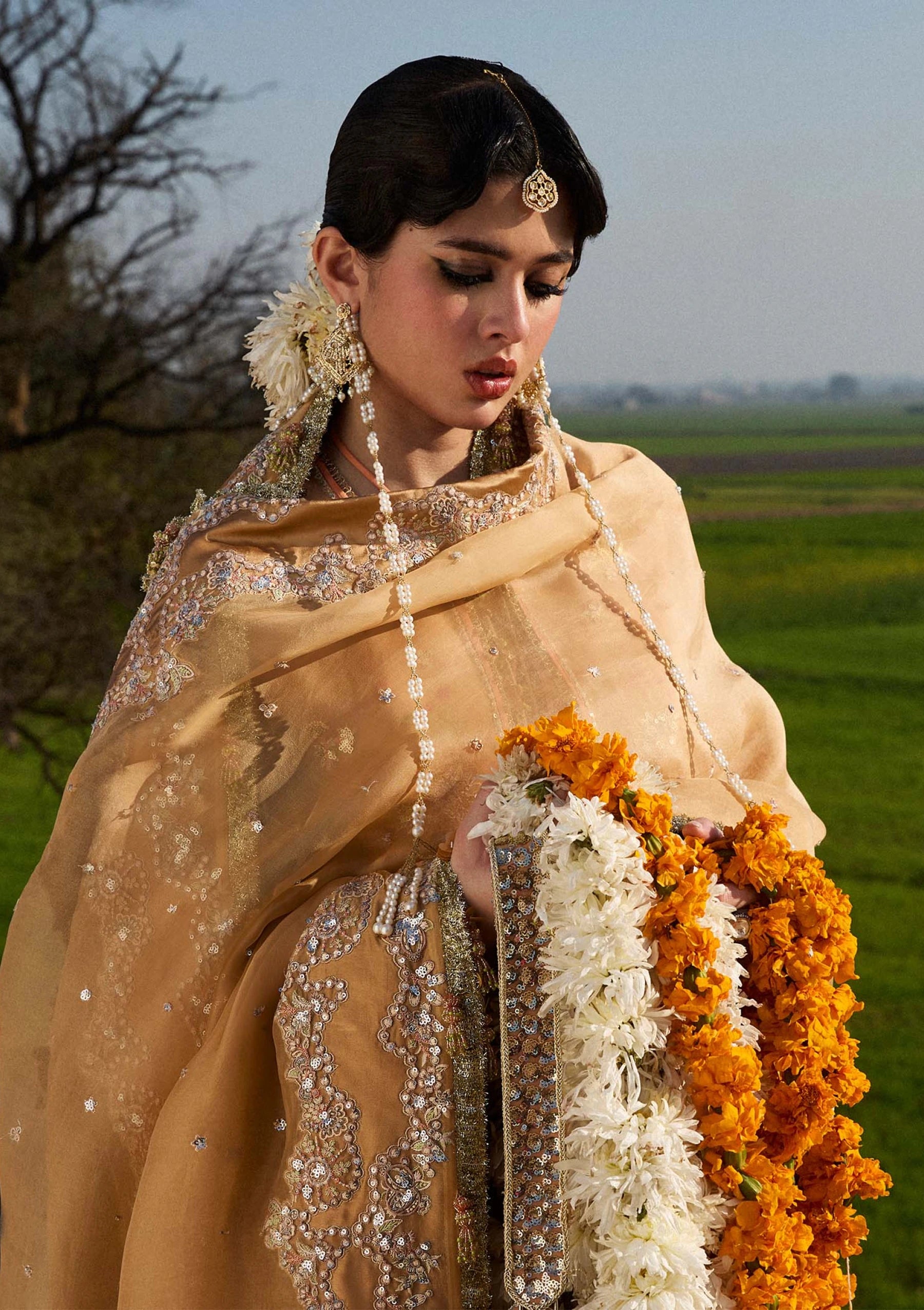 The organza jacket, composed of intricate sequin embroidery, is paired with a Korean raw-silk printed inner, creating a beautiful amalgamation of fabrics. The Korean raw-silk sharara, adorned with sequins embroidery, adds a touch of elegance. Heavy embroidered organza dupatta borders add a glamorous touch to the overall attire. This outfit is both elegant and beautiful, making you feel like a true fashion icon.