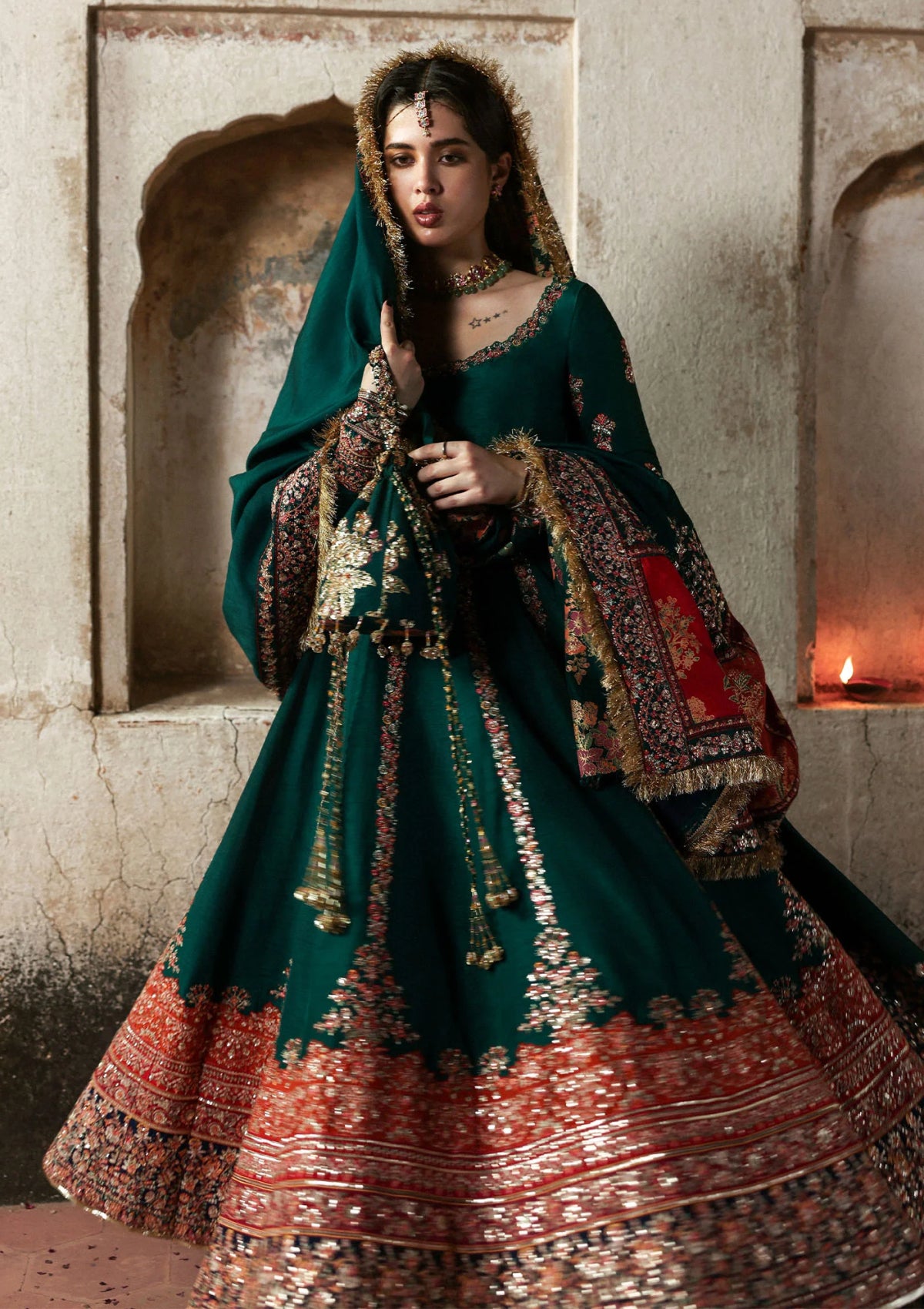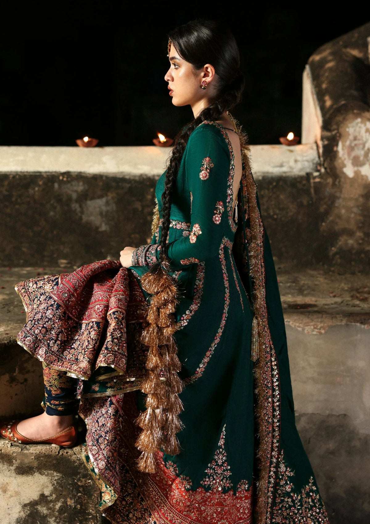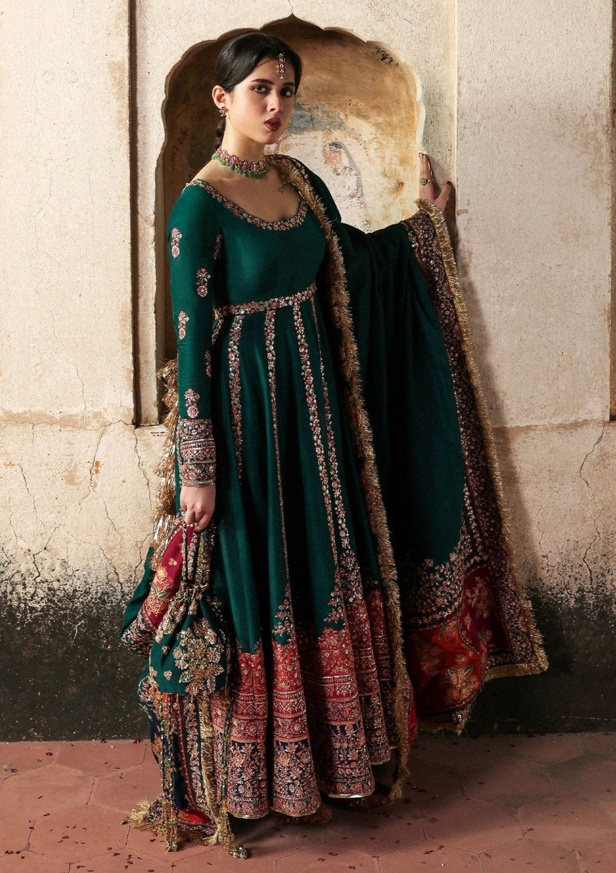 The resplendent emerald green Korean raw silk pishwas is heavily embroidered with multicolored borders and intricate detailing across front and back. It is paired with printed Korean raw silk churidar that brings vibrancy to the overall look. Completing the attire is an embroidered Korean raw silk shawl with four side embroidered borders and a multicolored printed pallu, adding a layer of grandeur. This outfit is a true statement piece for any event