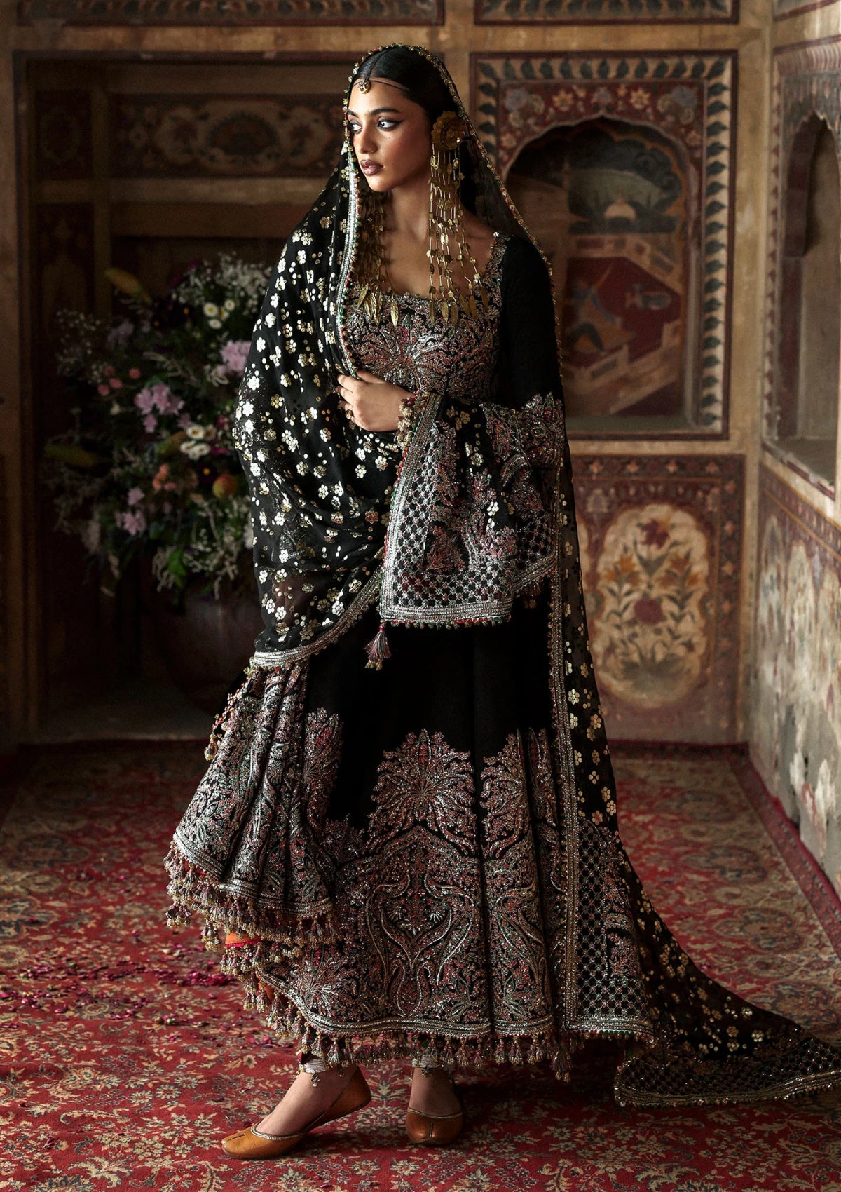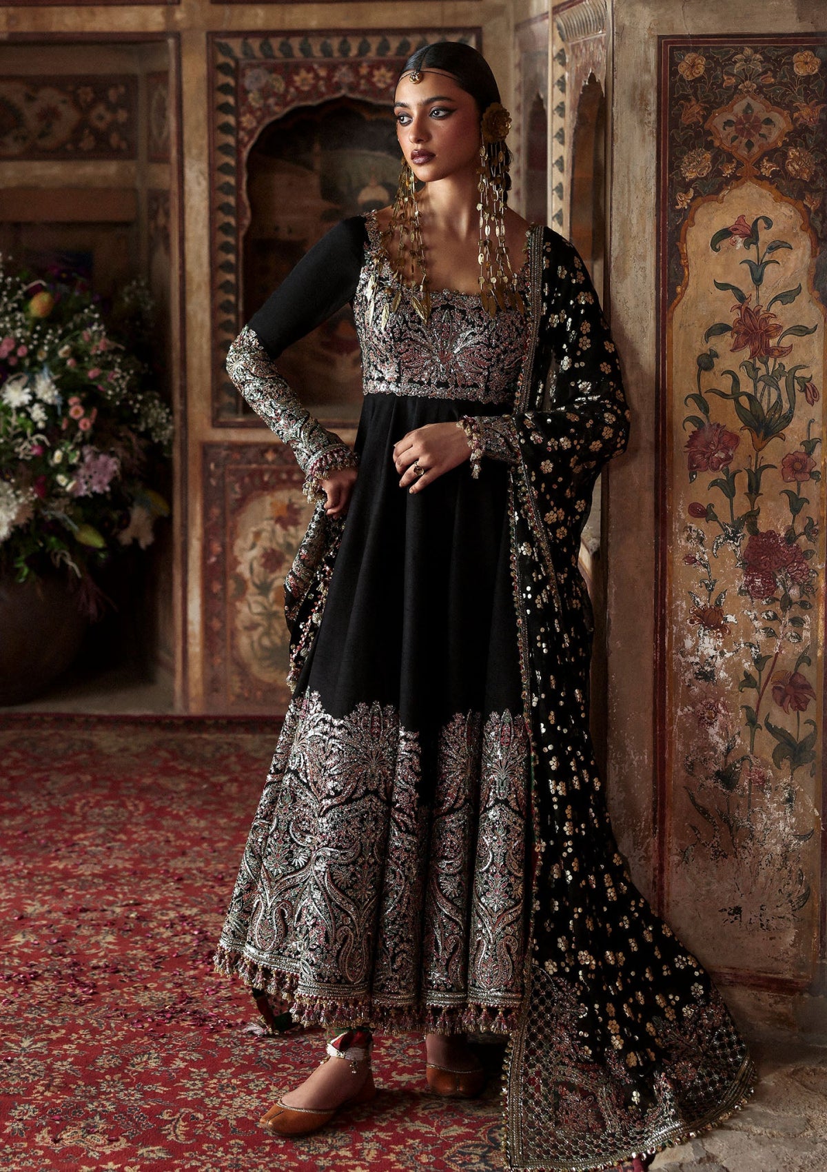 An intricate embroidered Korean raw silk peshwas features finely embroidered panels with heavy sequins across front and back, with embroidered sleeves. It comes with a digitally printed chatapatti Korean raw silk churidar that adds a touch to the traditional silhouette. The chiffon foil printed dupatta with four side borders and heavily embroidered pallu completes the regal ensemble. This outfit is a striking combination of sophistication and tradition, designed for special occasions