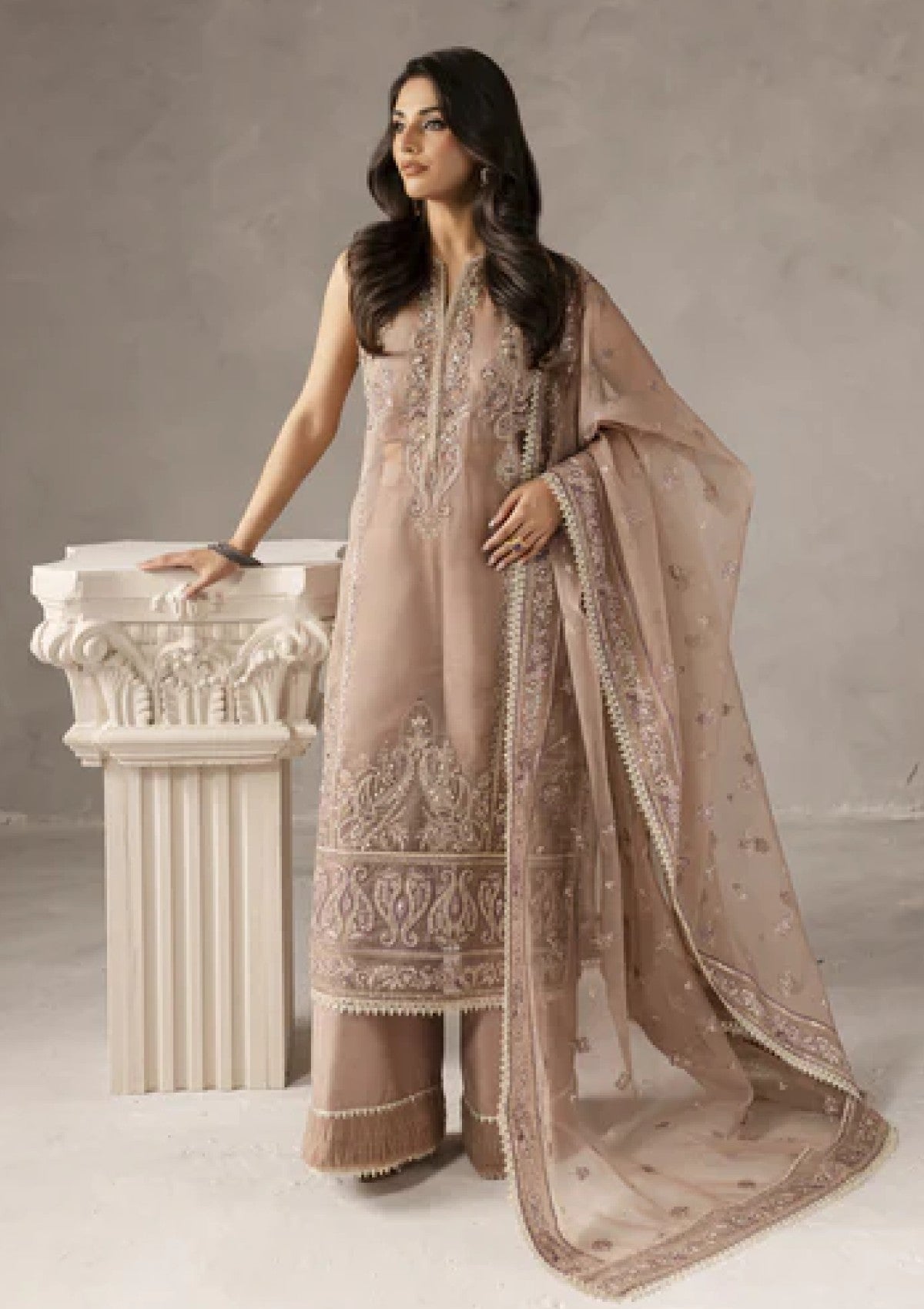Elegance meets craftsmanship in this pastel pink ensemble, featuring a sleeveless shirt, tailored trousers, and an organza dupatta. Adorned with hand embroidery and embellishments, it showcases Kulfi Drops, Bethki, Japanese Cutt Dana, Pearls, Crystals, Cup Sitara, and Surahi. A perfect blend of sophistication and grace for any special occasion
