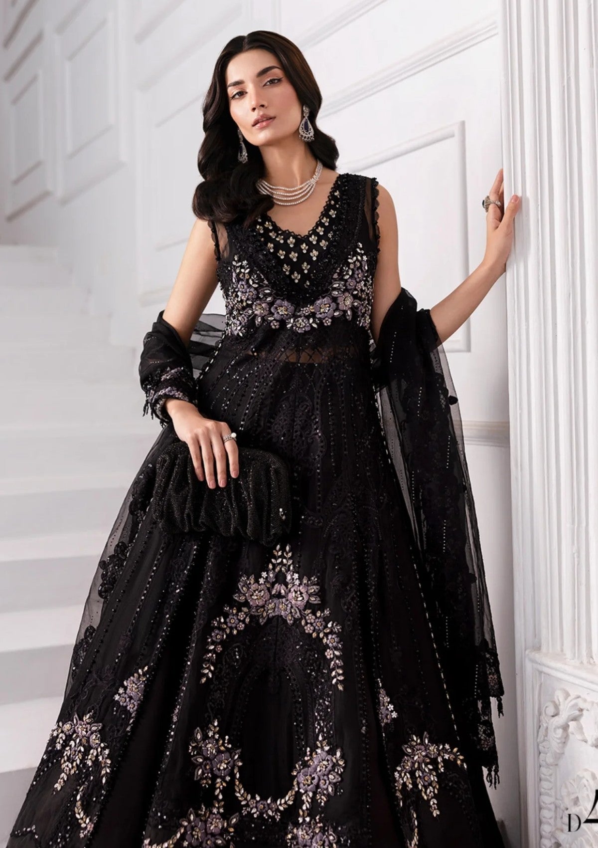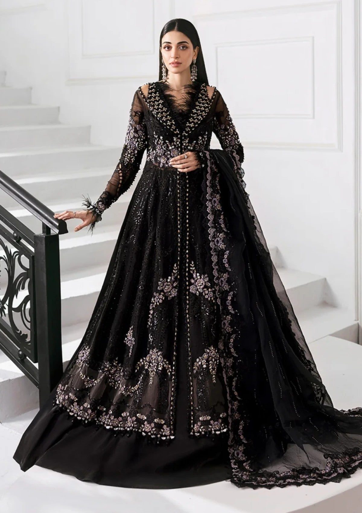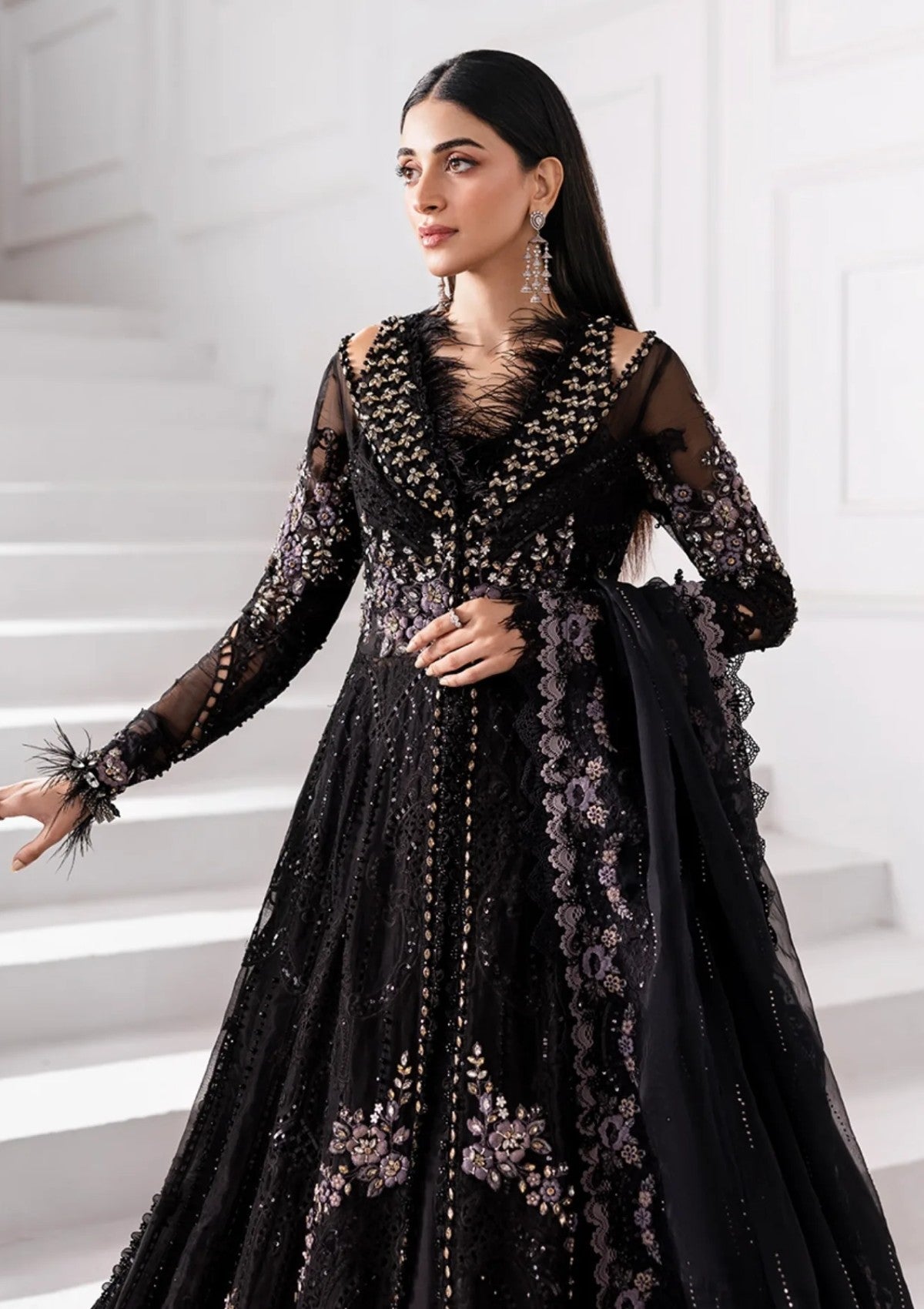 Embroidered Organza Sleeves Left With 3D Flowers & Luxury Hand Embellishment
