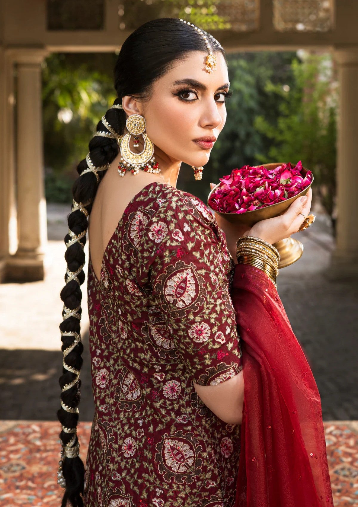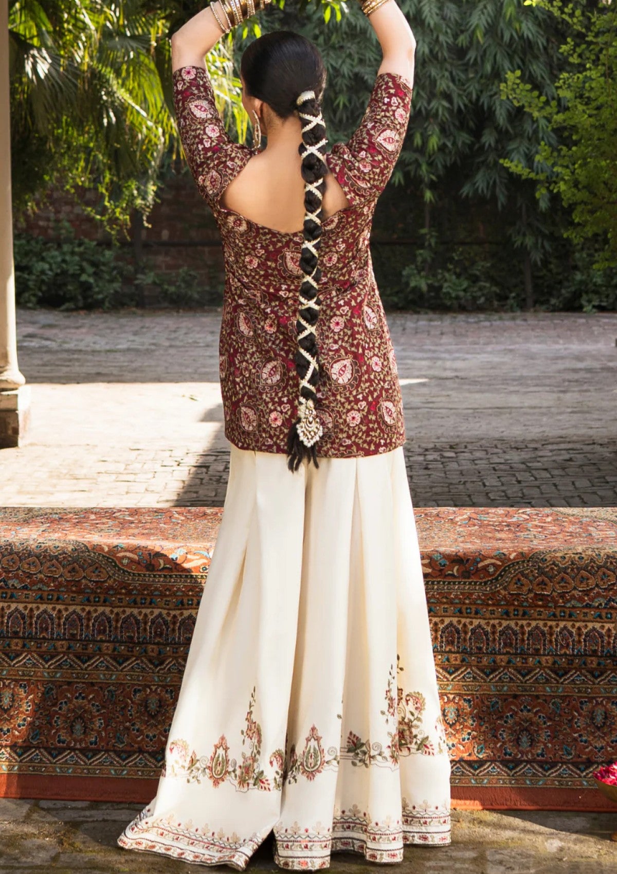 A majestic composition, Ruh-e-Noor unites maroon and cream — a fully embroidered shirt with tilla and sequin work, cream sharara with detailed border adorned with intricate embroidery, and a maroon dupatta with sequin spray that is draped in a whimsy of royal charm and twirl.