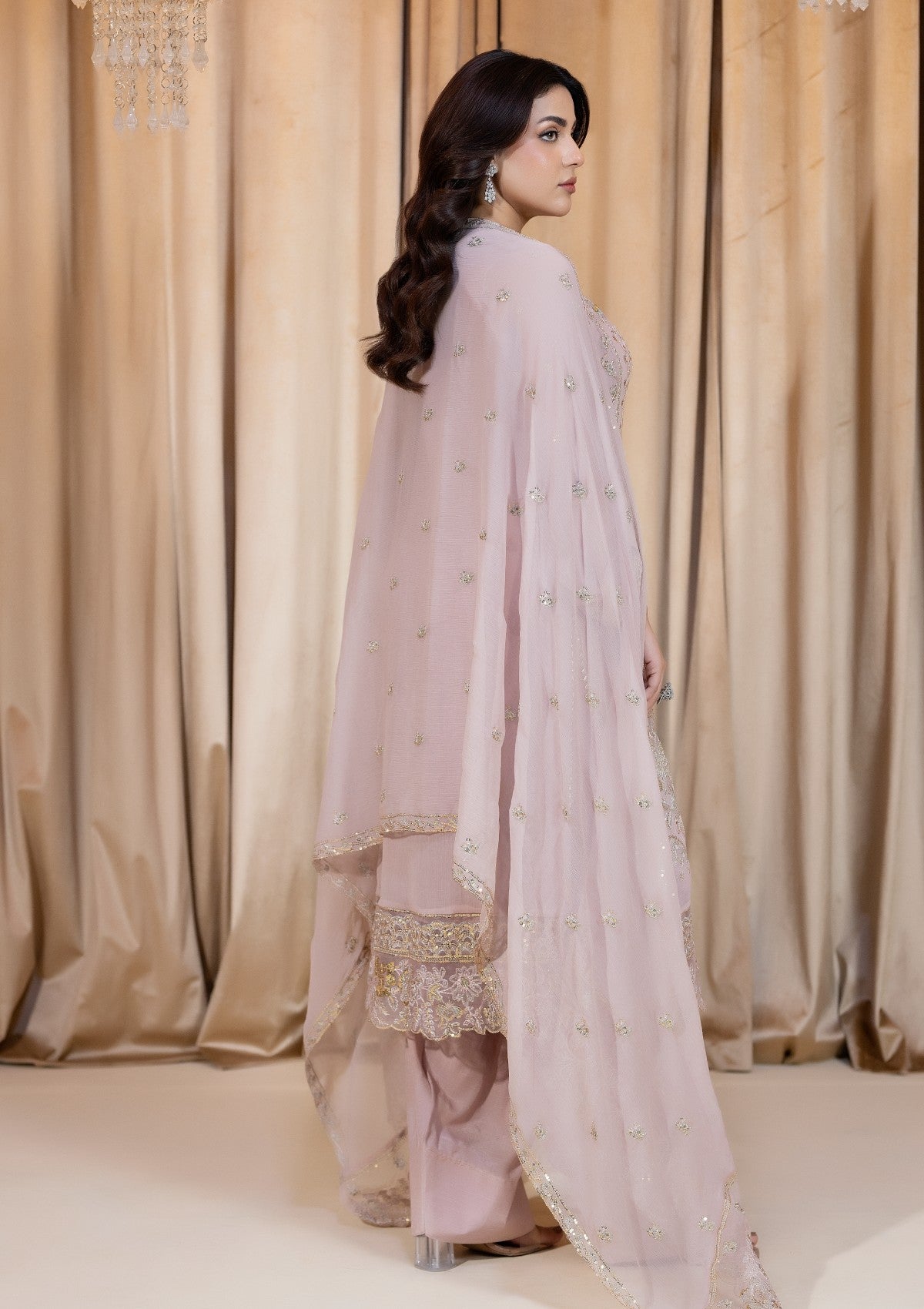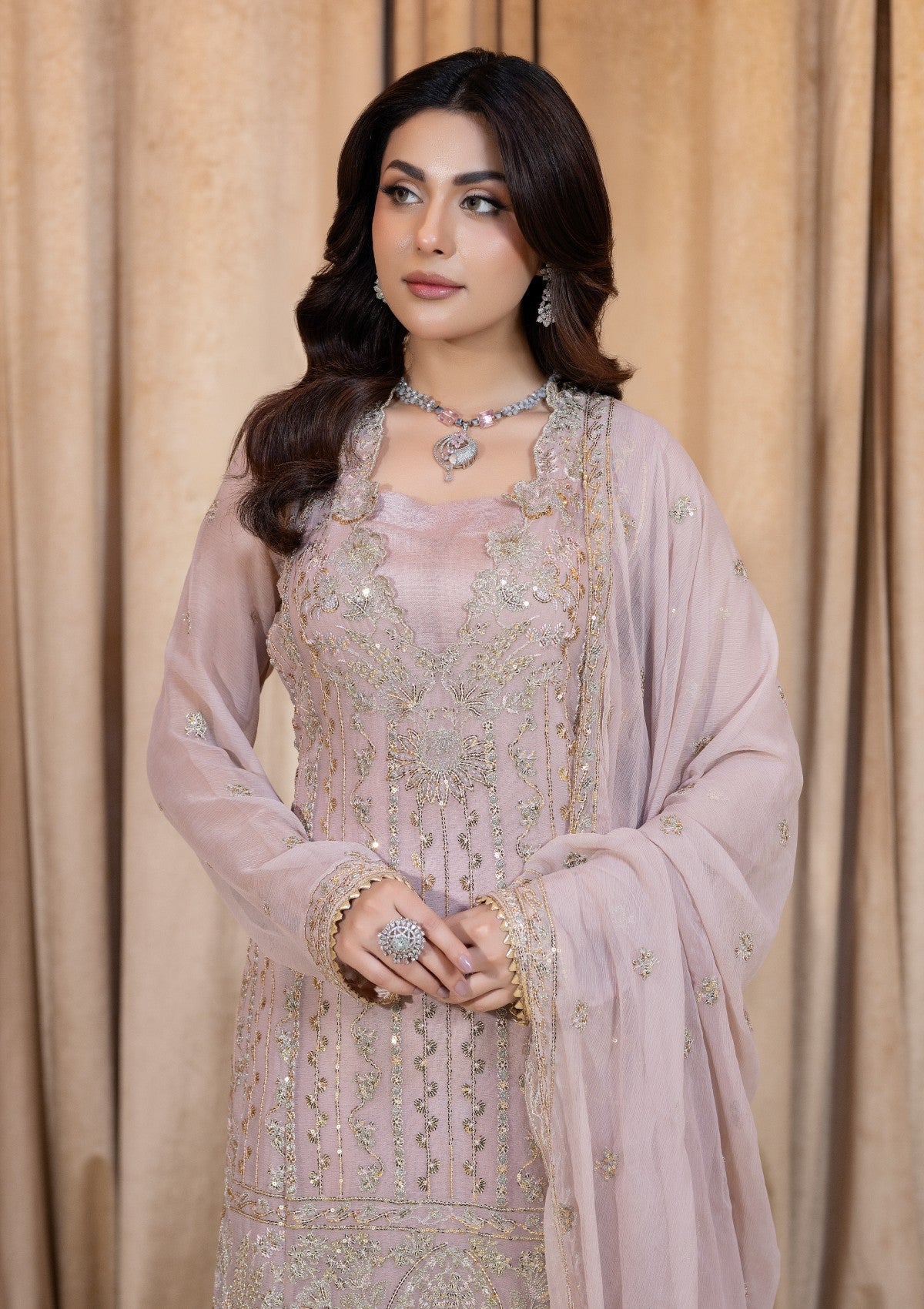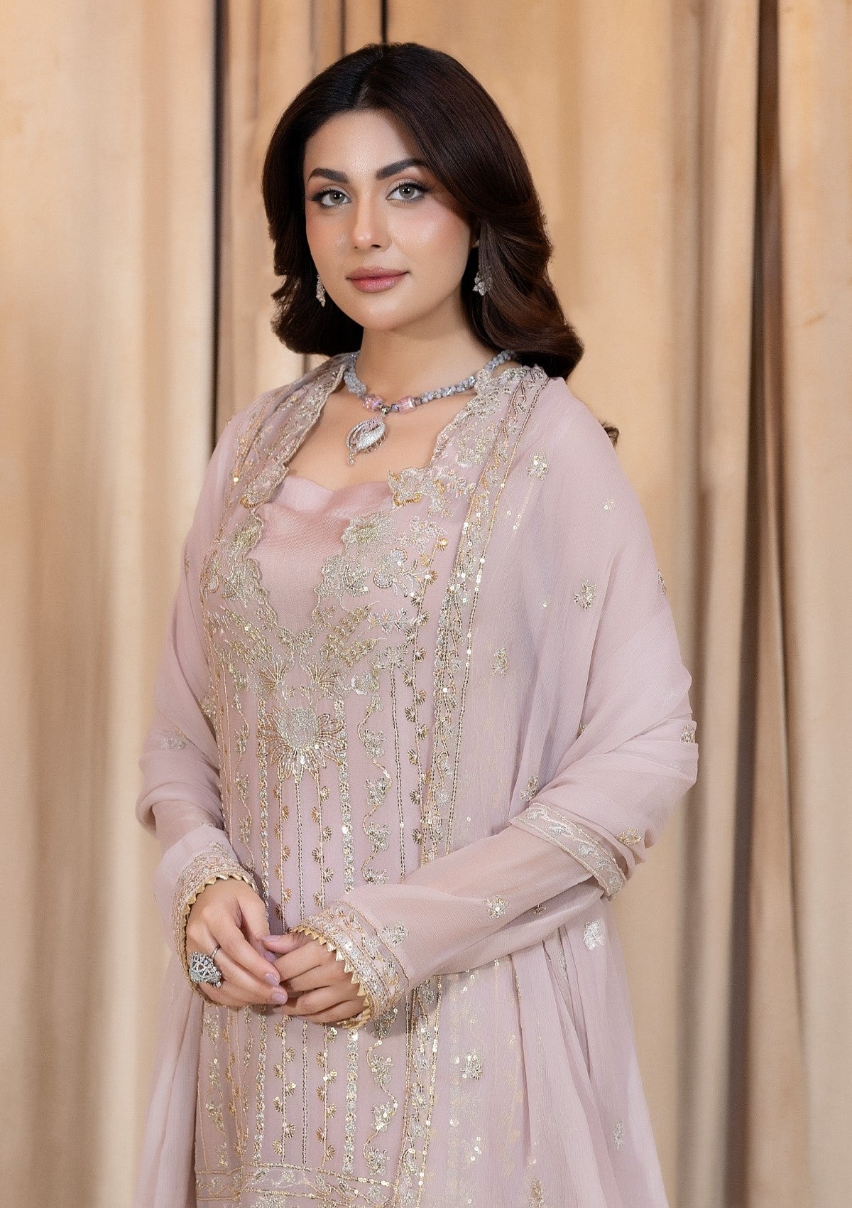 It's all about a light baby pink color Chiffon shirt with golden thread embroidery and sequins. This is a design that celebrates finesse and tradition. Finished with a beautiful Embroidered Chiffon Dupatta ensemble carries elegance that feels both classic and fresh.