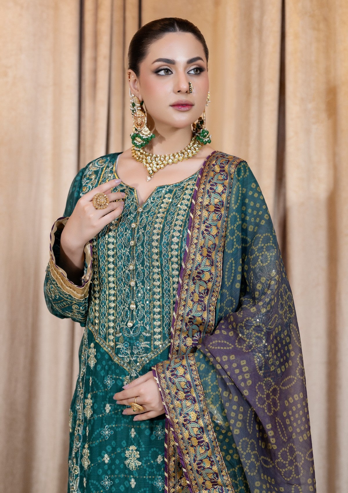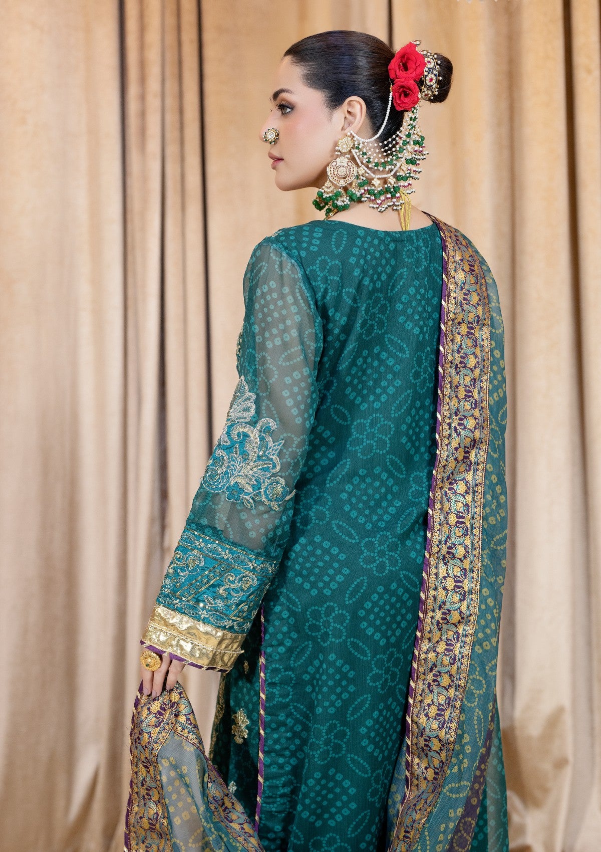Make a bold statement, DLC-04 in a Zinic Green from Dastan Luxury Chiffon. The graceful ensemble features an intricately golden embroidered printed Chunri Chiffon shirt, Center and Right Left Panels. While the printed Chiffon Sleeves with Silk Motifs and border. The look is completed with a 3-toned Chunri Dupatta with 4-sided hand-painted silk border. Perfect for this formal season.