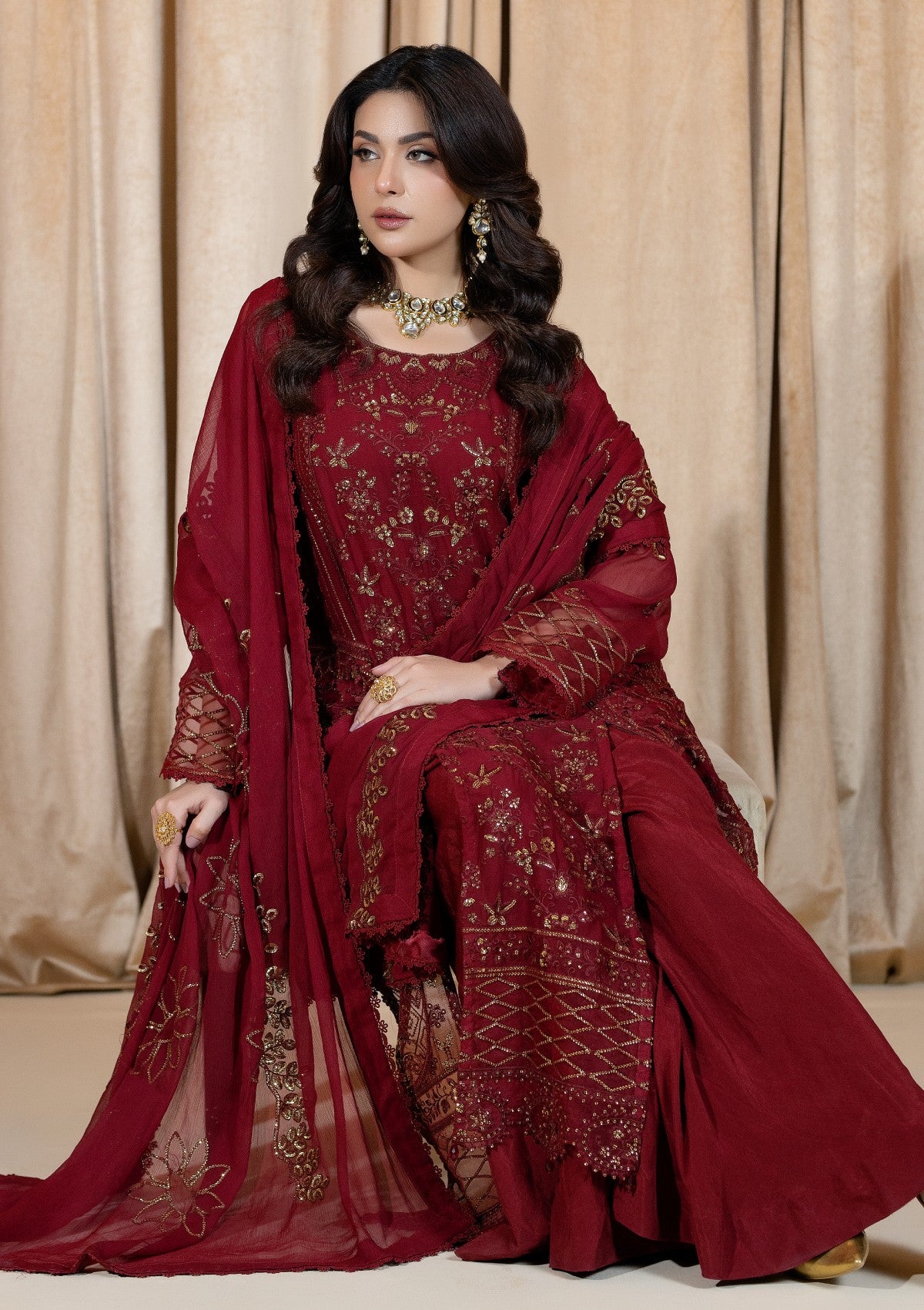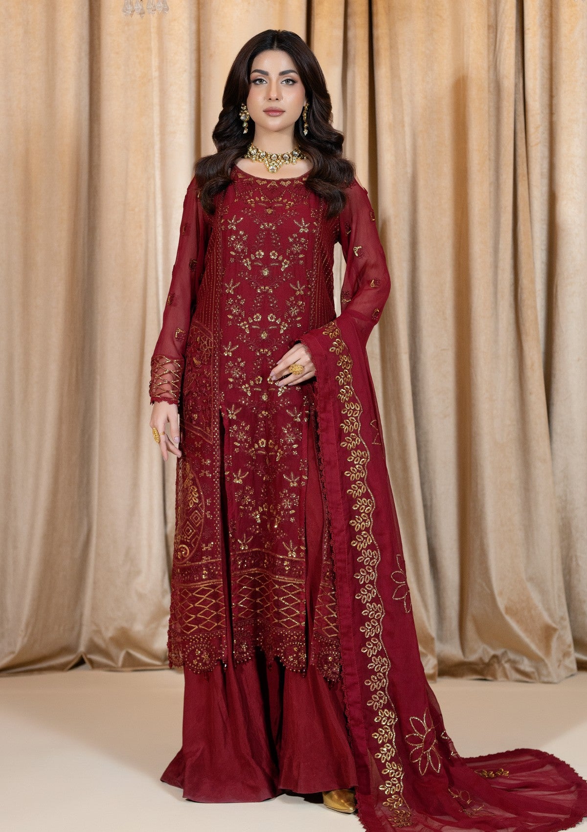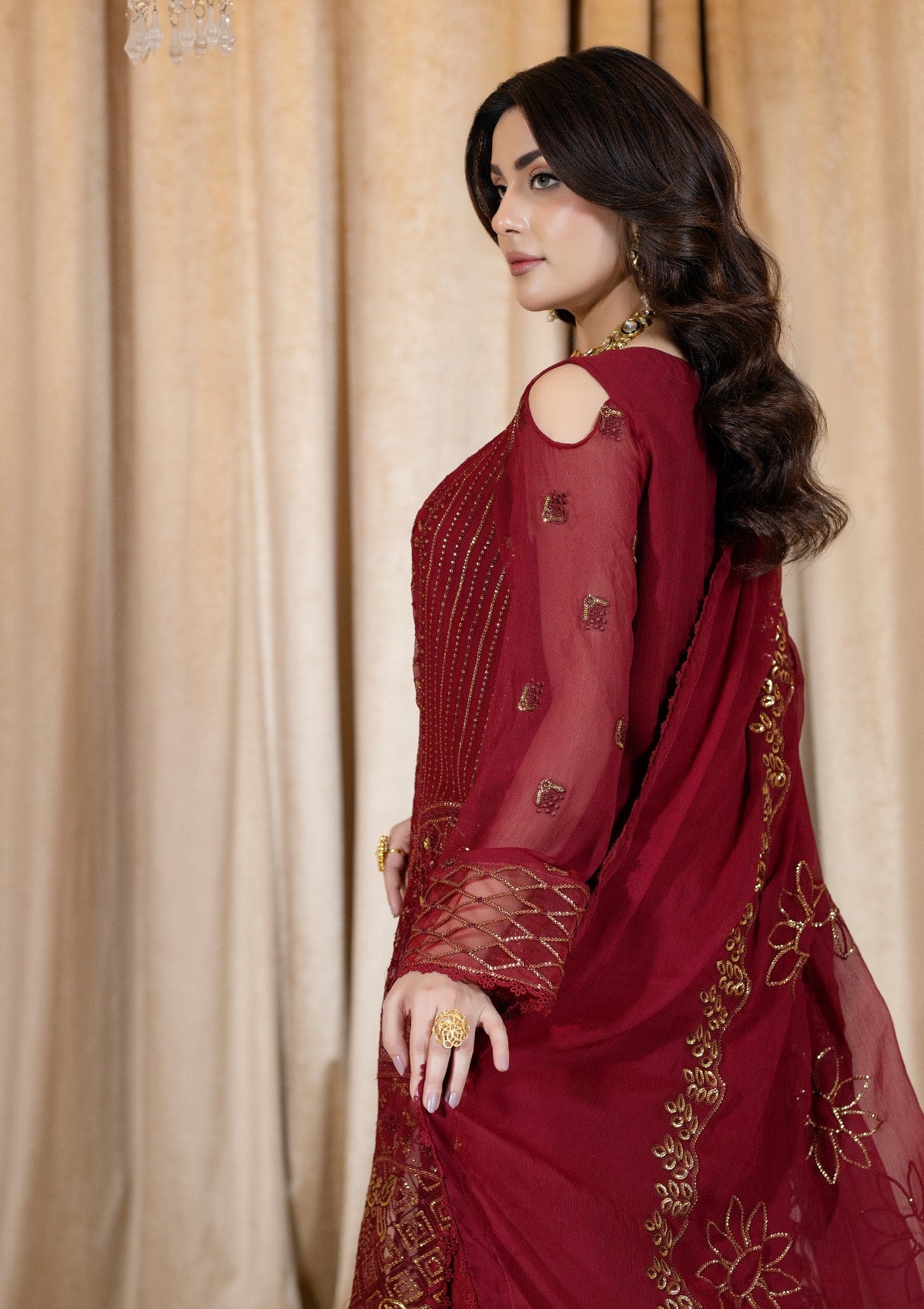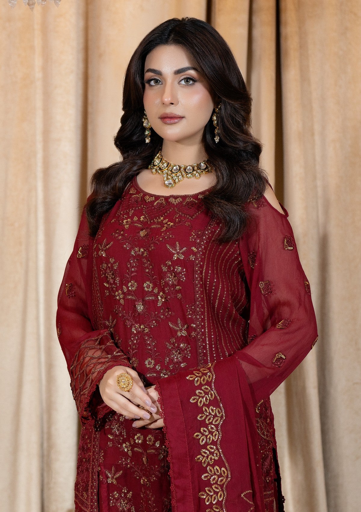 Bold and breathtaking Is a Classic Mahroon drenched in rich embroidered Chiffon creations, adorned with golden sequins, is the perfect balance of grace and glamour-timeless, graceful, and exquisite. Paired with a richly detailed embroidered Dupatta for timeless charm.
