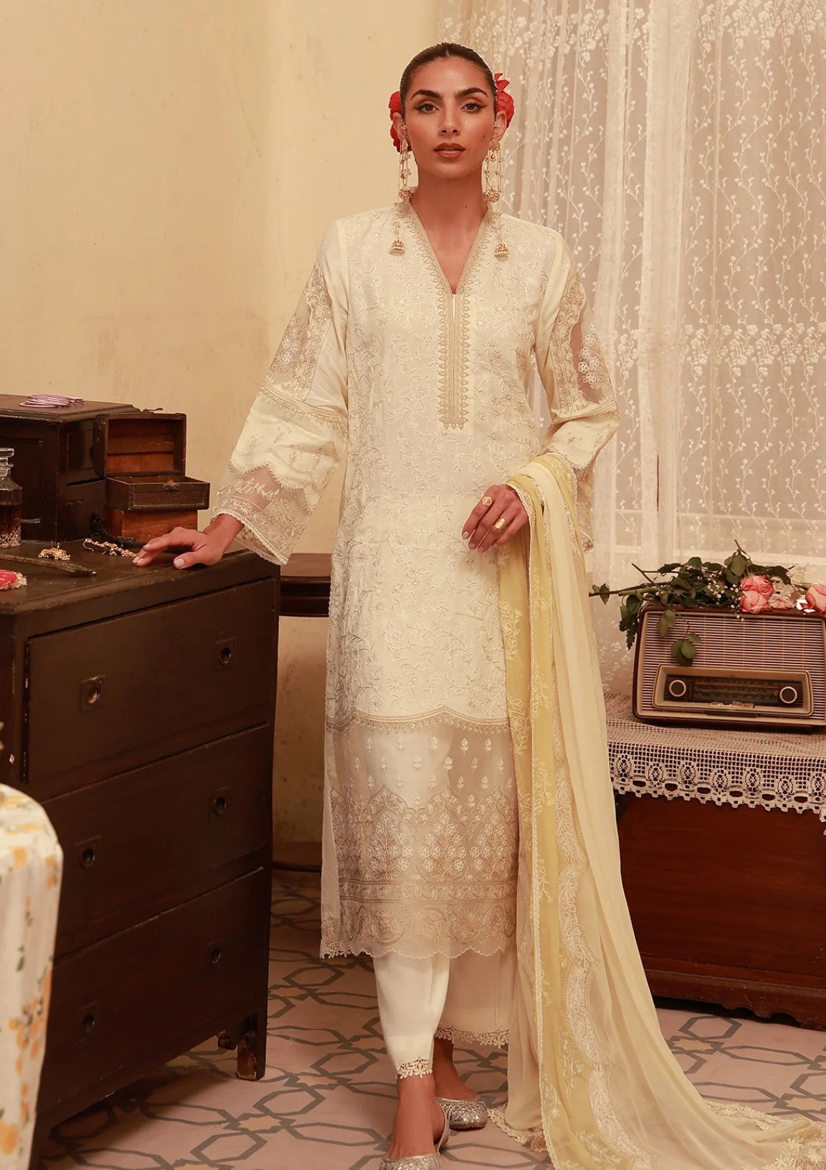 The outfit is a stunning example of contemporary ethnic wear, combining traditional craftsmanship with a modern, sophisticated silhouette. Crafted from a delicate butter yellow raw silk, this 4-piece set offers both elegance and comfort. The outfit features detailed and intricate Aari embroidery, providing a rich, artisanal finish with embroidered organza borders and patches. Paired with matching trousers, silk inner, and chiffon dupatta with contrasting embroidered borders for a seamless and polished look. ideal for sophisticated evening gatherings.