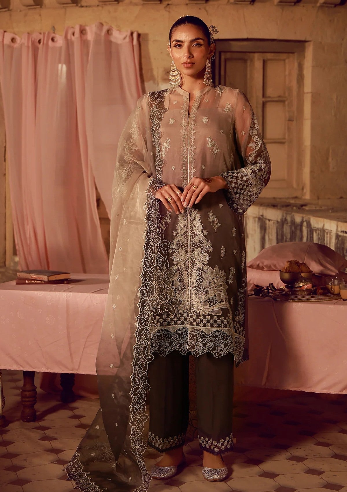 Discover timeless elegance with this captivating 4-piece formal suit meticulously crafted from delicate organza fabric. This exquisite ensemble showcases a beautiful ombre transition from a soft beige hue to a dramatic rich grey hem, ensuring a truly unique and eye-catching appeal. The front-open style shirt is a masterpiece of intricate craftsmanship, heavily adorned with opulent dull copper zari and resham embroidery. It is perfectly complemented by a matching ombre organza dupatta, featuring elegant cutwork embroidered borders on all four sides. The matching ombré silk slip and grey rawsilk trousers finished with embroidered organza border provide a luxurious touch.