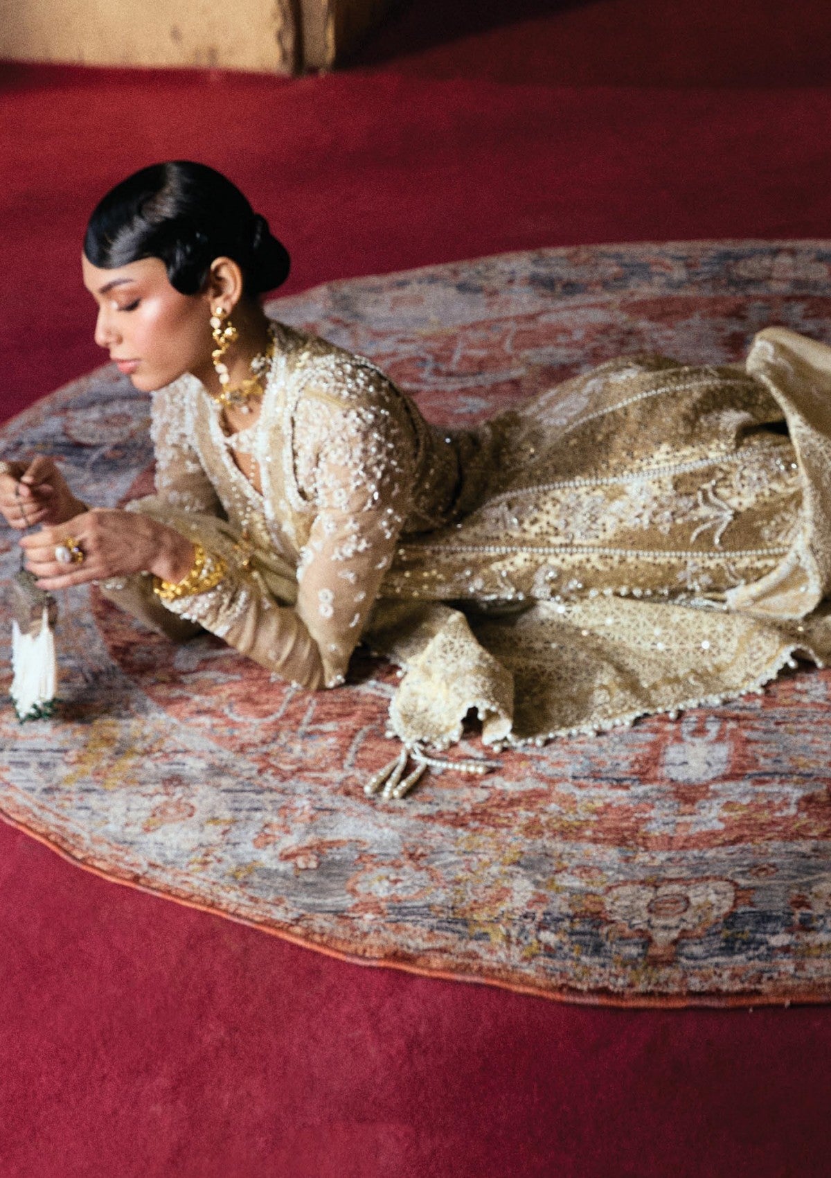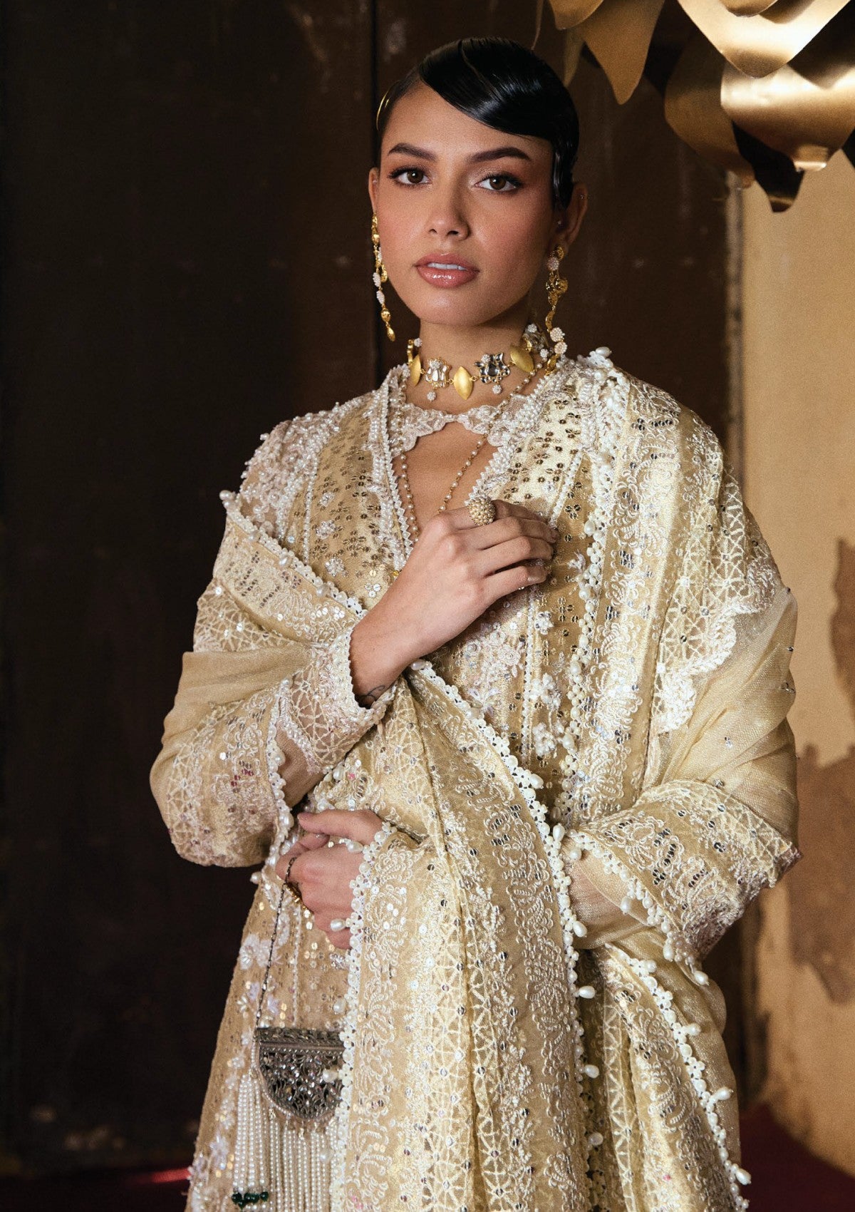 This 3-piece Gold ensemble offers true luxury The centerpiece is a five-paneled. tissue Silk gold pishwas with a V-neckline, fitted Sleeves, and contrasting embroideries in off-whites and golds. featuring variations in border detail. Paired with Sharara silk pants in gold, also adorned with various border details, and by a tissue net gold dupatta with a four-sided border and a plethora Of renewal-themed embroideries on the pallu. Experience the variance of timeless elegance,