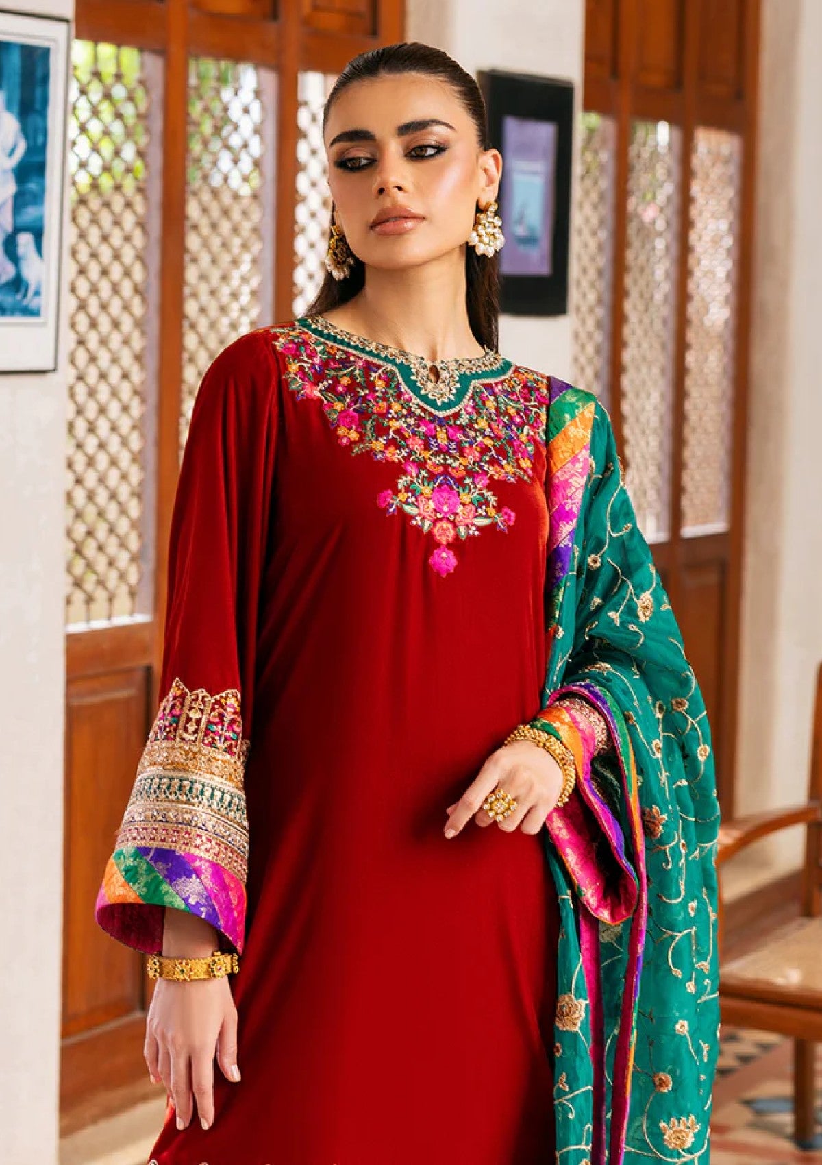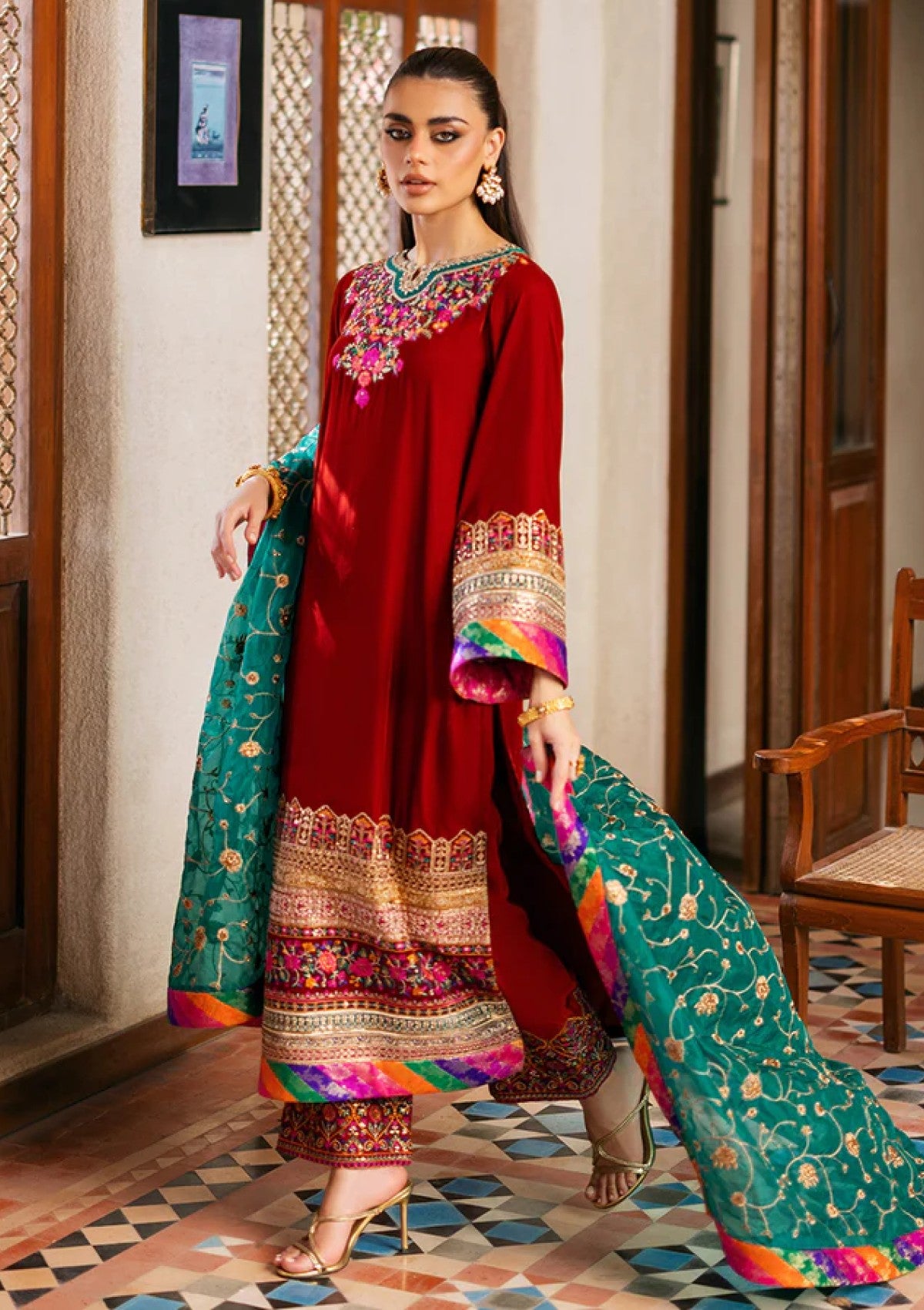 A luxurious three-piece in warm Rust Red Velvet. The shirt features a richly detailed multicolored embroidery on the neckline and a broad, intricate hem border in a medley of traditional colors. Paired with coordinating raw silk trousers and a breathtaking Turquoise Organza Dupatta with embroidered motifs and a lively border.