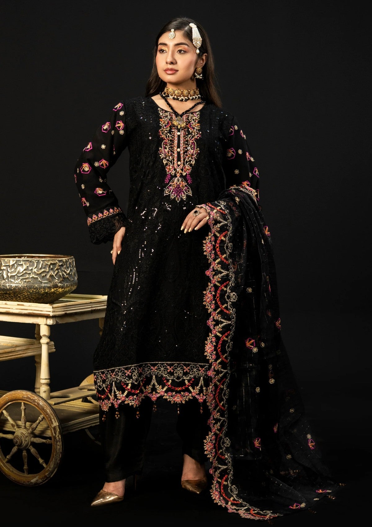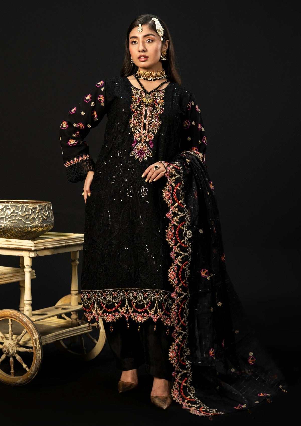 Noir Éclat embodies timeless elegance through its deep black crinkle chiffon shirt, richly embroidered with delicate threadwork and sparkling sequins that evoke the magic of midnight. The lavish neckline and sleeves feature exquisite hand embellishments in adda takai technique, paired with a scalloped organza dupatta enhanced by elegant embroidery and embellishments. Completed with comfortable viscose staple fabric pants, this semi-stitched formal ensemble is crafted for sophisticated soirées where refined artistry meets graceful style.