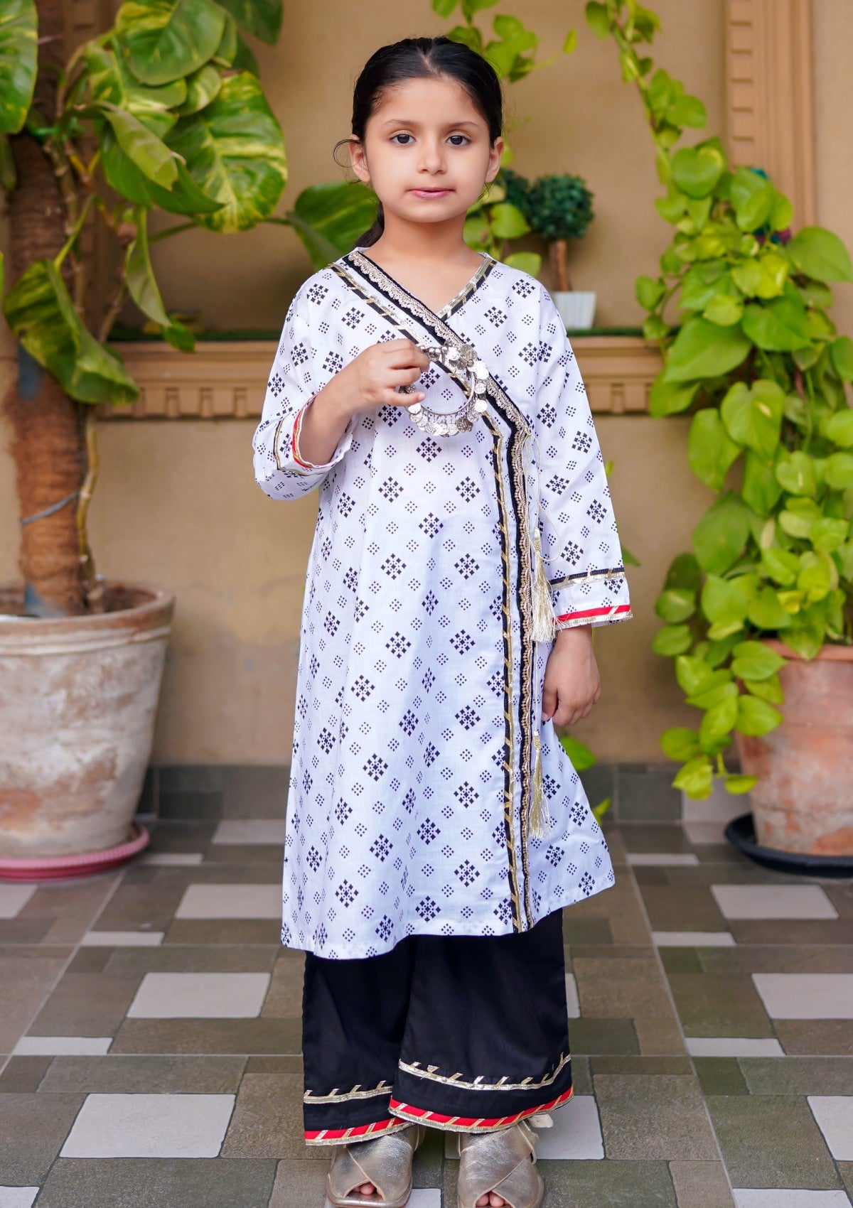 This stunning white angrakha features intricate golden tilla lace embellishments, beautifully complemented by a striking black and red chatapati. Perfect for festive occasions, it exudes elegance and traditional charm.