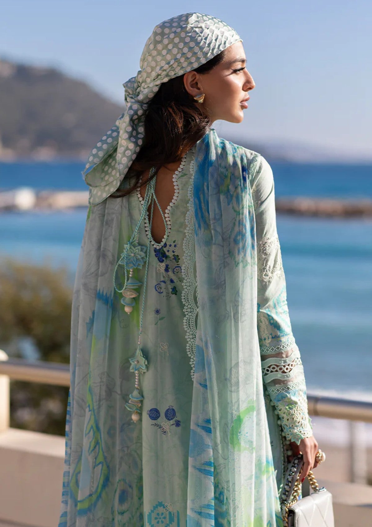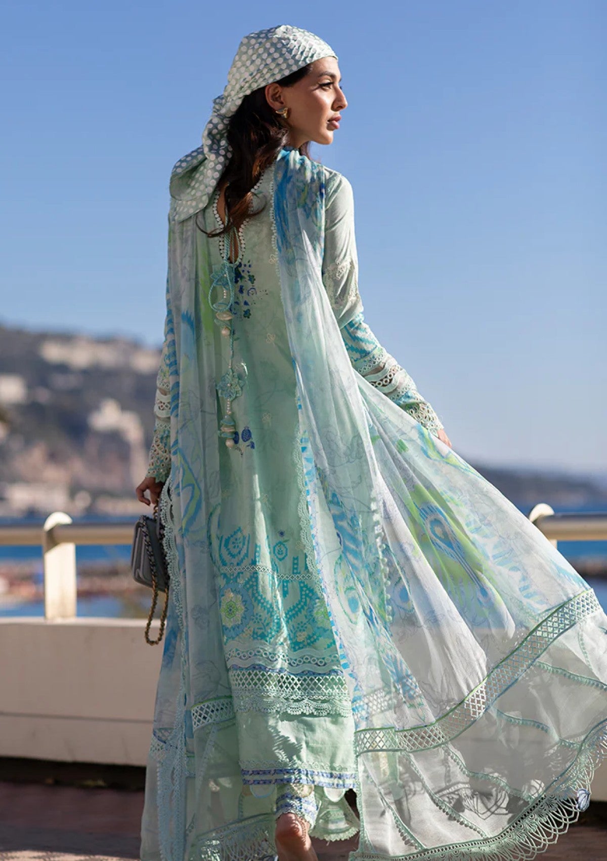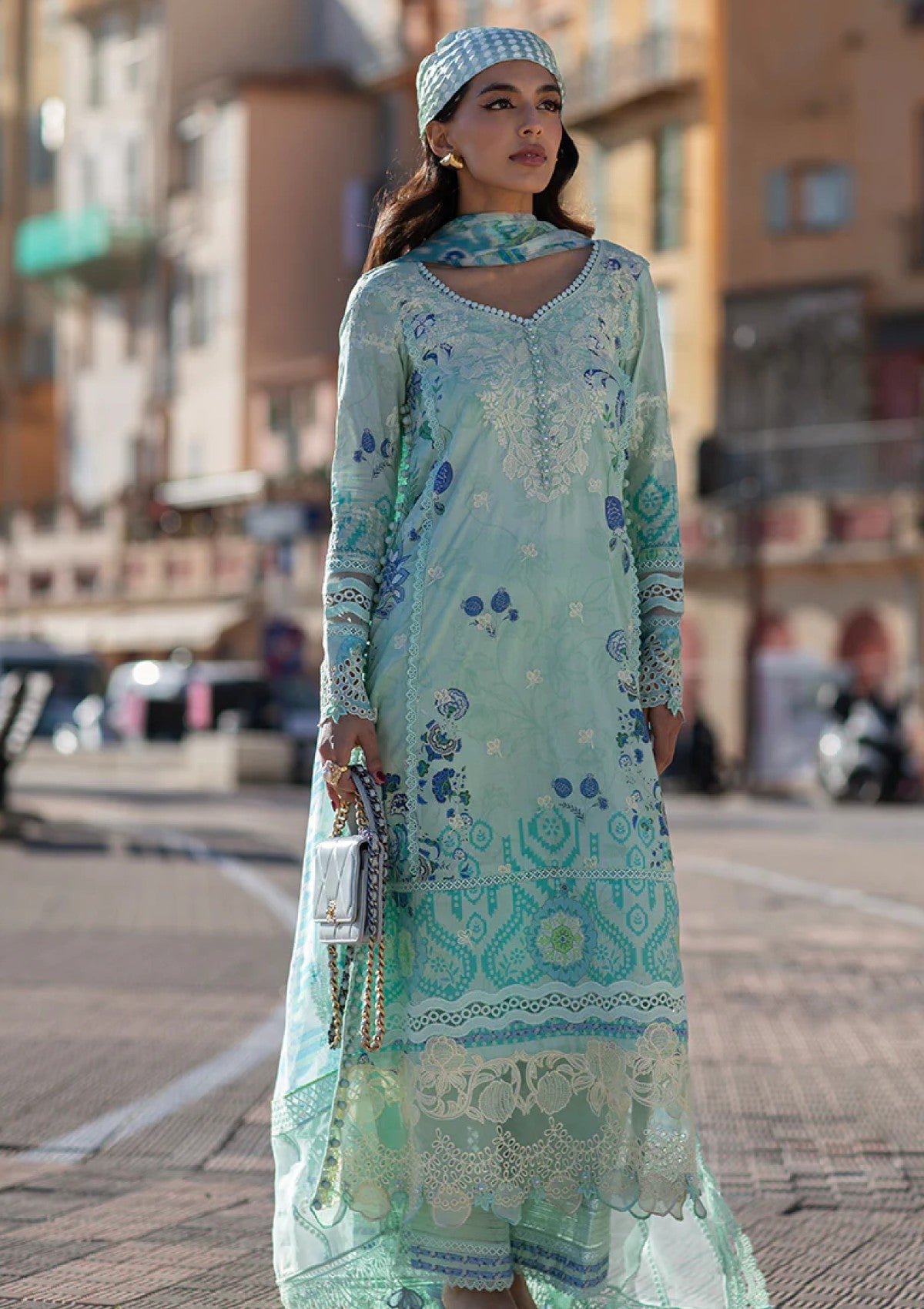 A three piece printed set in hues of aqua and mint. Making the perfect color to wear this season. Cobalt blue highlighted elements in the print to create the perfect balance. With off-white aari embroidery inspired neckline and organza borders to finish the look effortlessly.