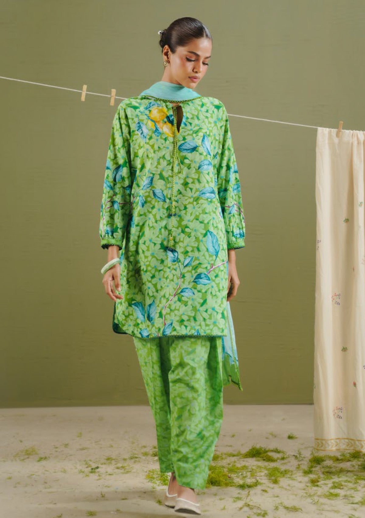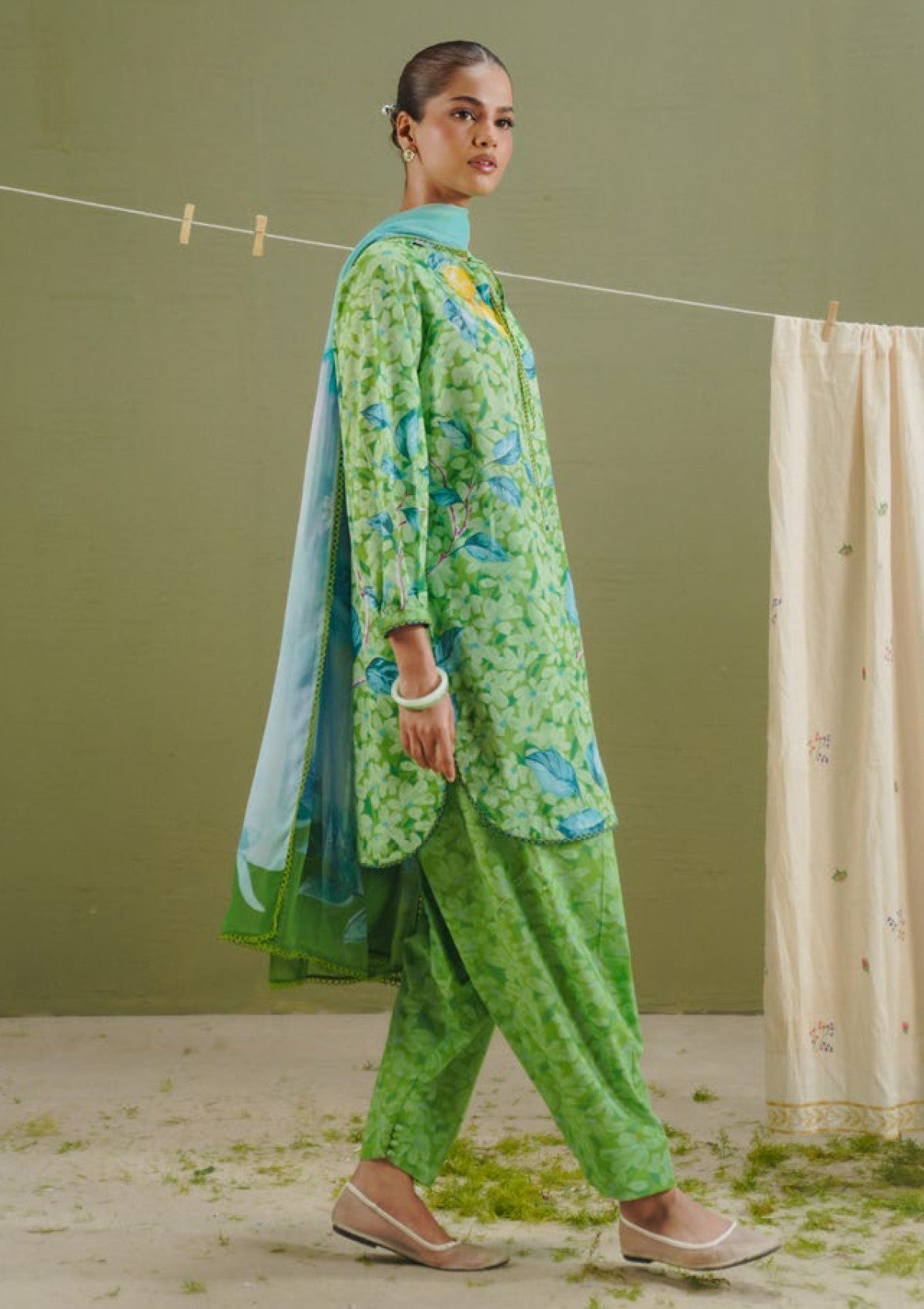 The dupatta presents daisy florals with a watercolor-textured effect in aqua marine tones. The shirt and trouser are printed with daisy meadow inspired motifs on a pear green base.