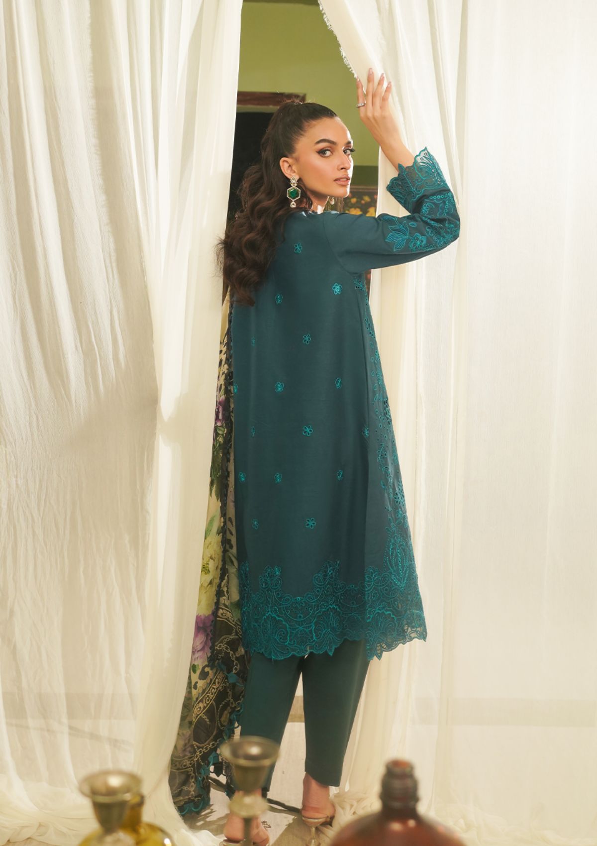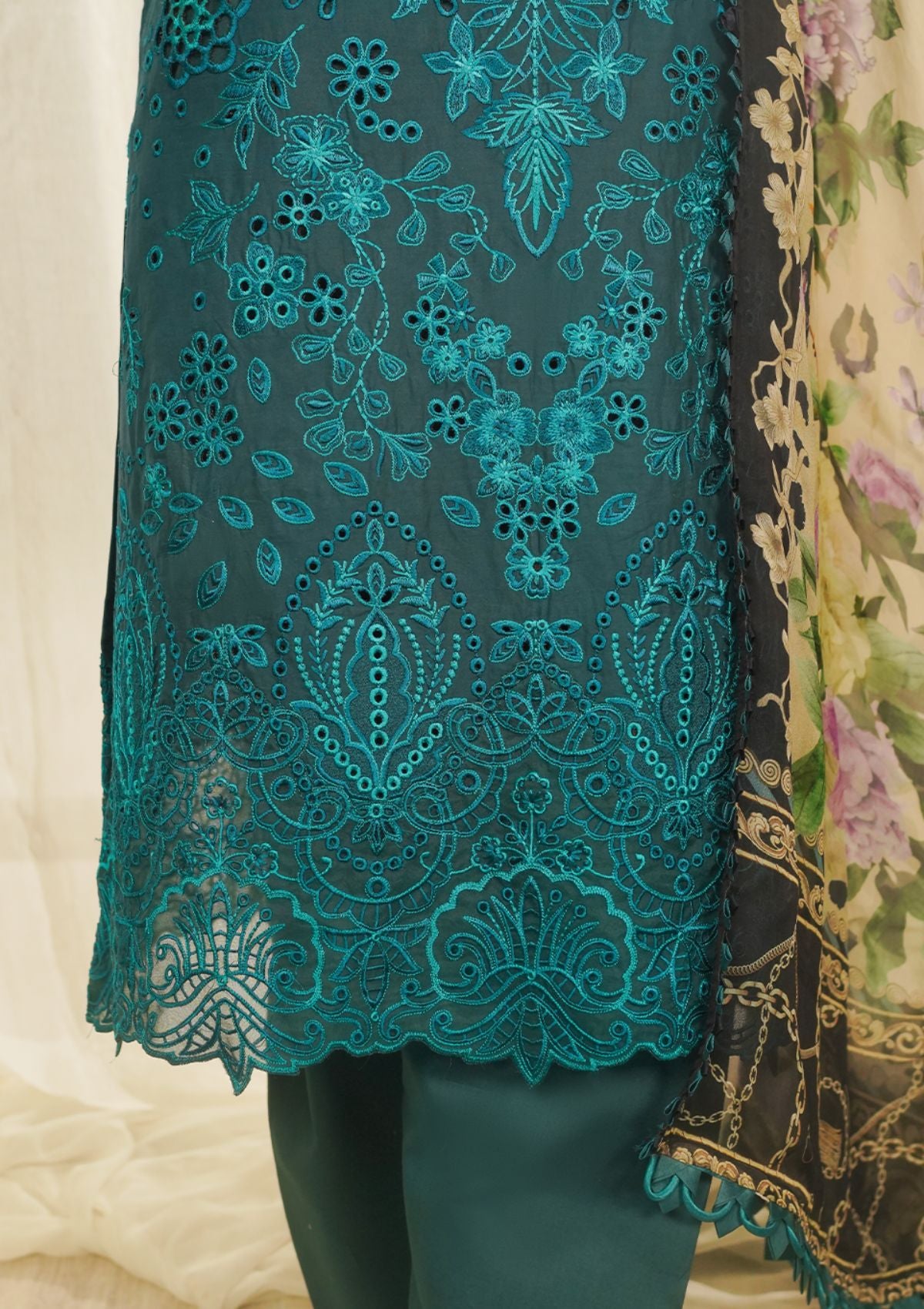 “Dina ” embodies timeless elegance with its elaborate floral pattern in deep azure blue, enriched by cutwork detailing and vibrant thread work in jade and aqua green. The painstakingly embroidered border exudes opulence, elevating the ensemble to regal heights. The sumptuously printed silk dupatta adds a playful charm, infusing the look with dynamic energy. This meticulously crafted masterpiece captivates with its harmonious blend of sophistication and vivacity, enticing the beholder with its intricate beauty and luxurious allure. In “DINA,” every stitch tells a story of refined artistry and enchanting grace, making it a true symbol of sartorial excellence.