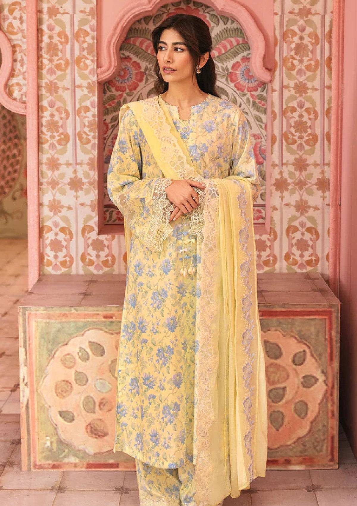 Looking for a stylish yet comfortable lawn suit? The SUNSHINE DREAM-3PC PRINTED LAWN SUIT may be your perfect match. This set features a beautifully printed shirt with a 60" embroidered patti for the sleeves, a cambric printed trouser with a matching 60" embroidered patti, and a luxurious silk embroidered applique dupatta. Enjoy the perfect blend of comfort and elegance with this lawn suit.