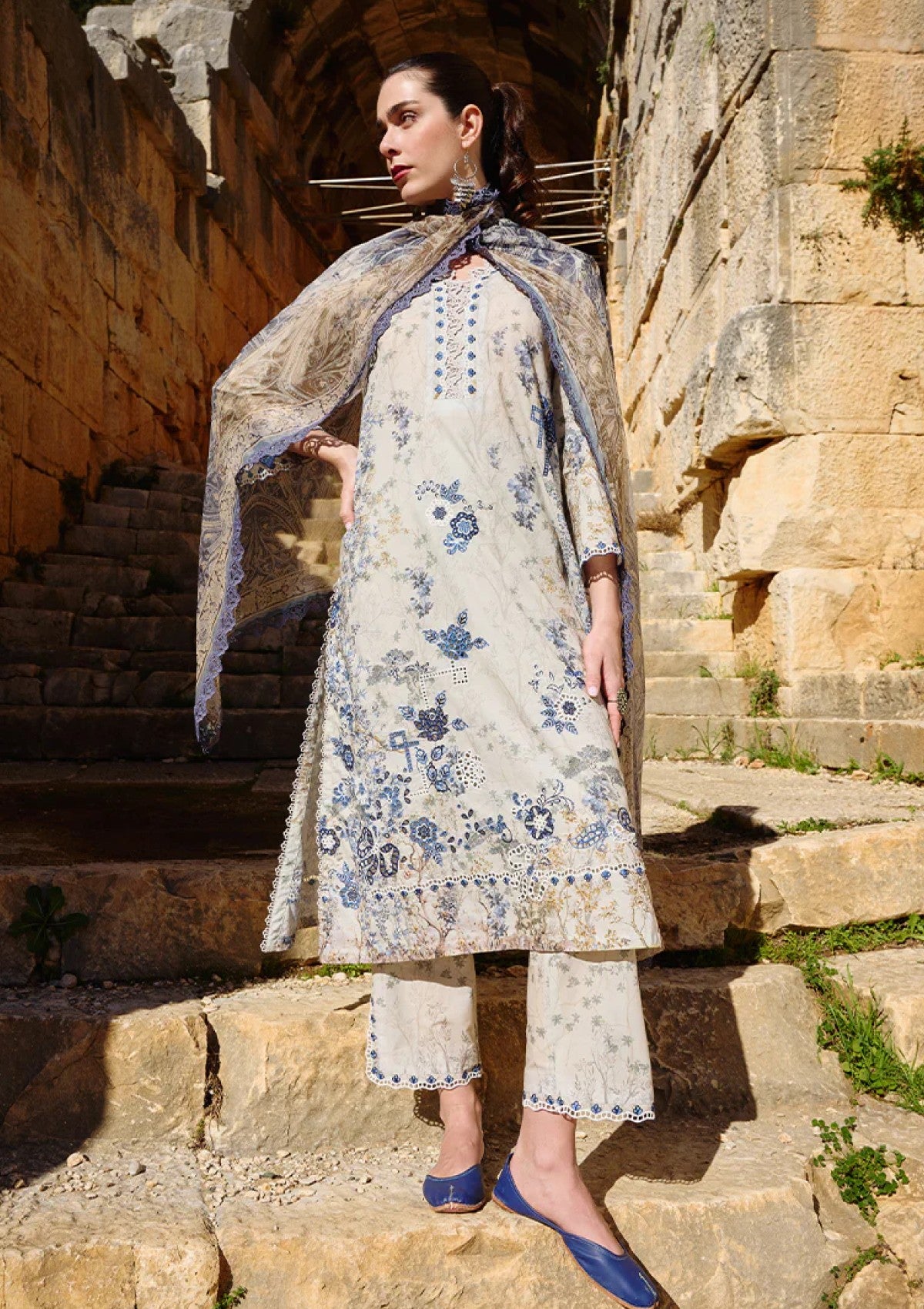 Selina in Ivory from our Spring Printkari '25 Collection. A printed cutwork embroidered cotton 3-piece outfit paired with digital printed chiffon dupatta.