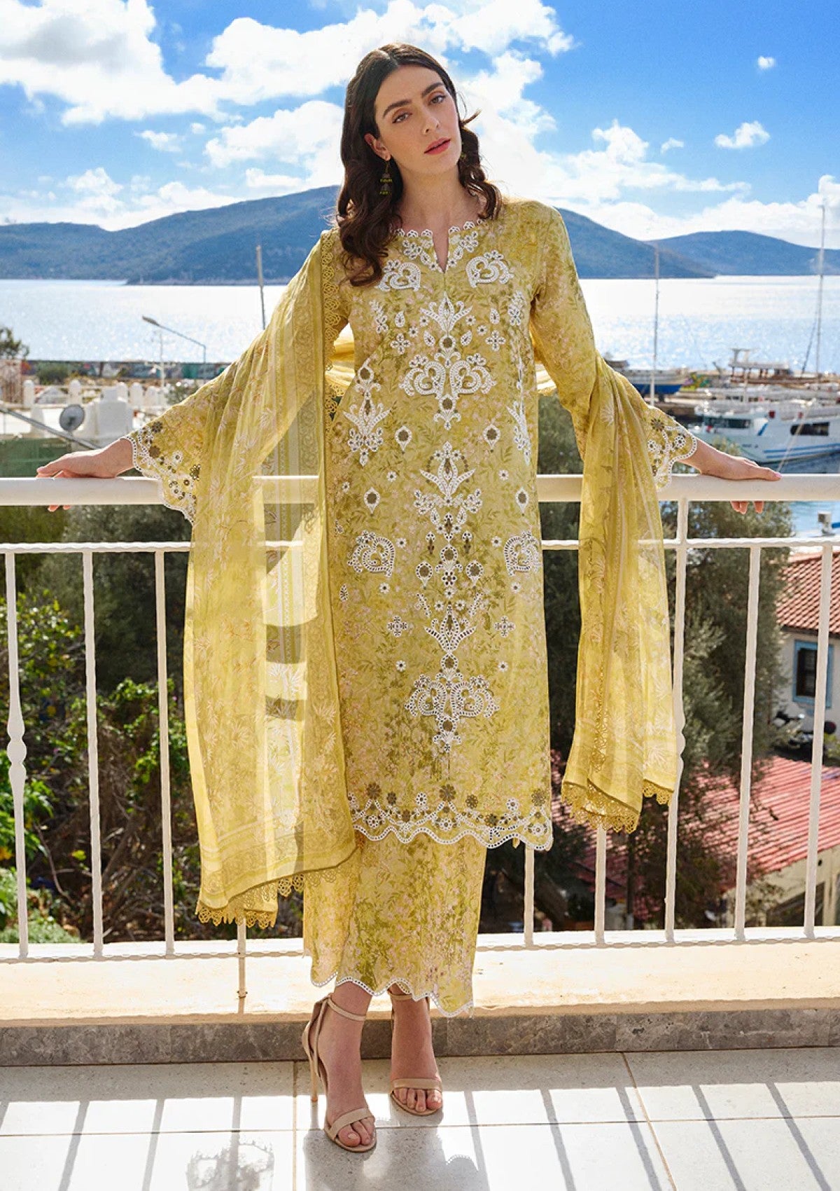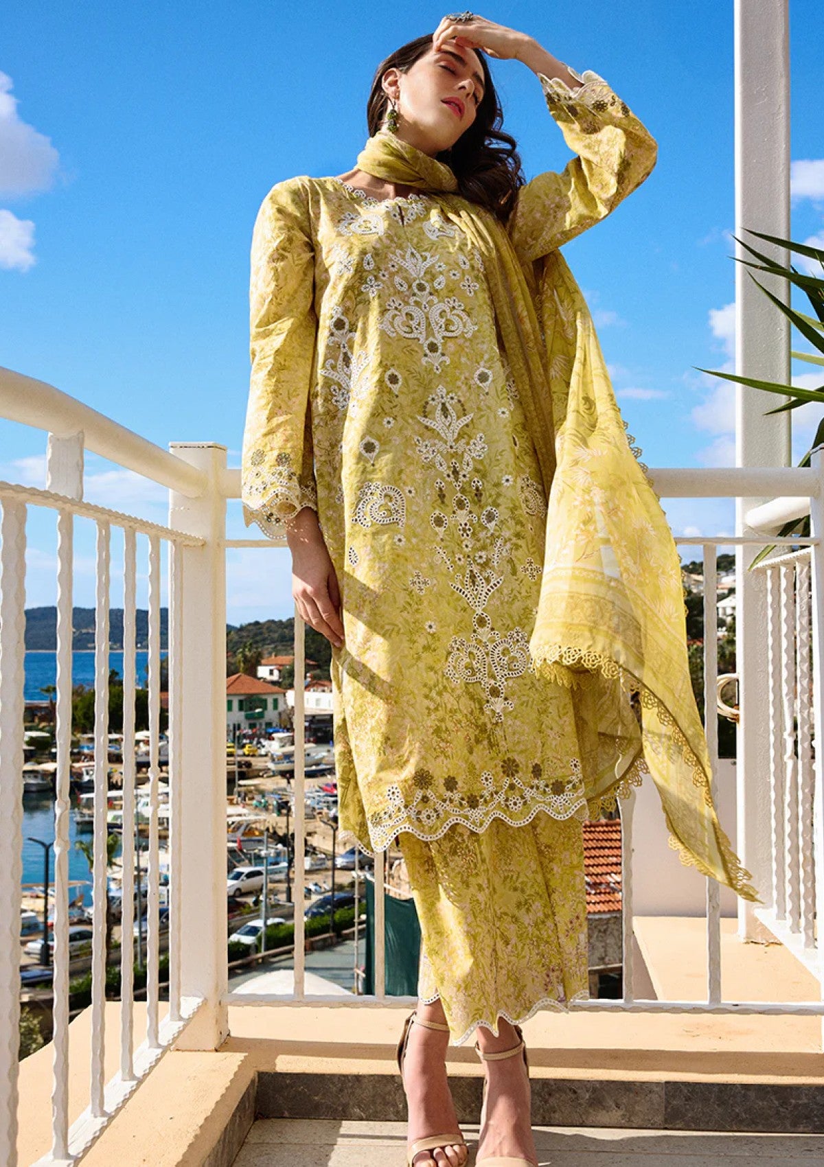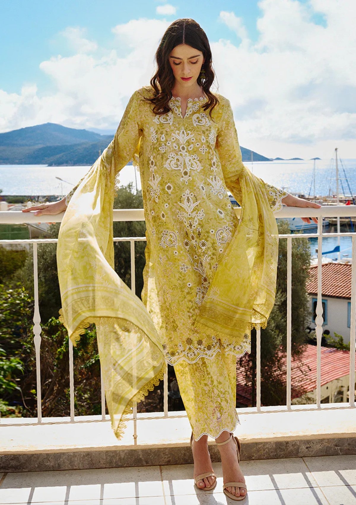 Leora in Yellow from our Spring Printkari '25 Collection. A printed cutwork embroidered cotton 3-piece outfit paired with digital printed chiffon dupatta.