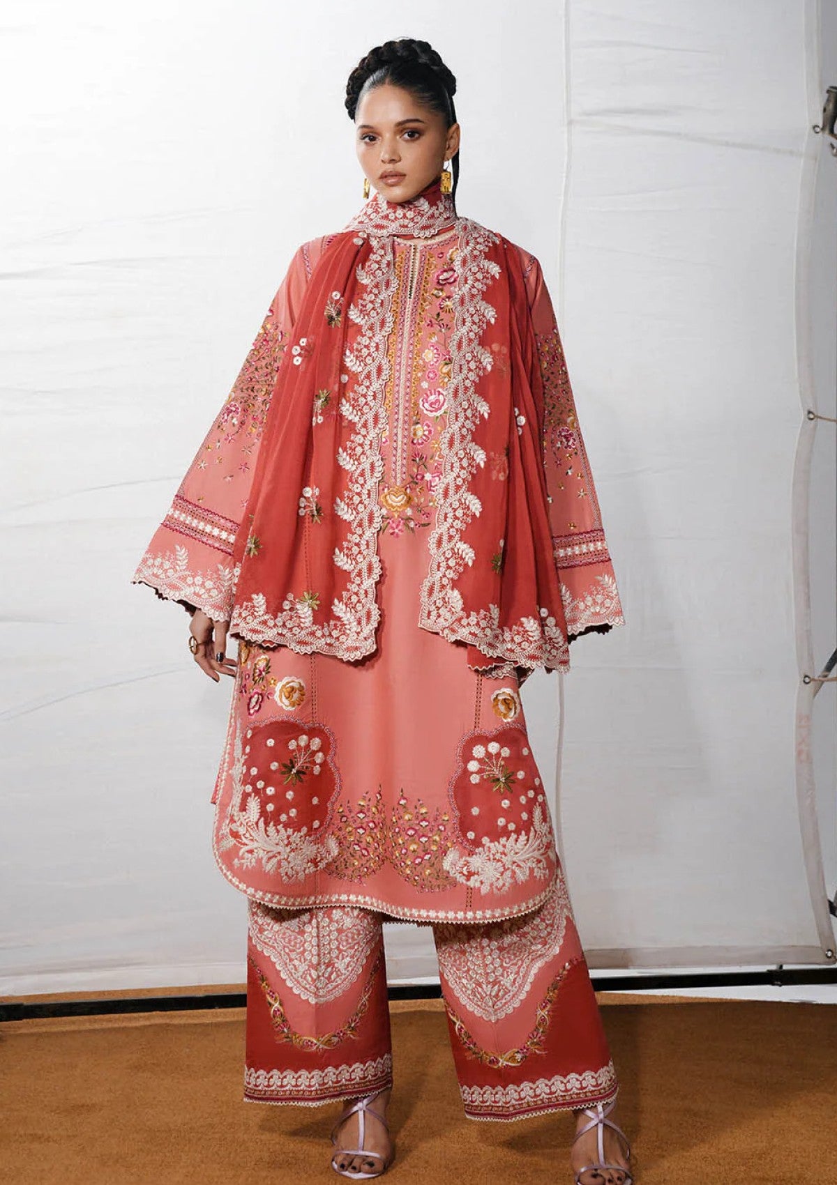 A long pink shirt adorned with multicolor floral ghara embroidery is elegantly enhanced with organza patches on the daaman, while the bell sleeves feature matching embroidered borders, creating a refined and graceful silhouette. The ensemble is paired with matching embroidered trousers accented with organza borders, and a monochrome embroidered chiffon dupatta completes the look with a delicate, sophisticated finish.