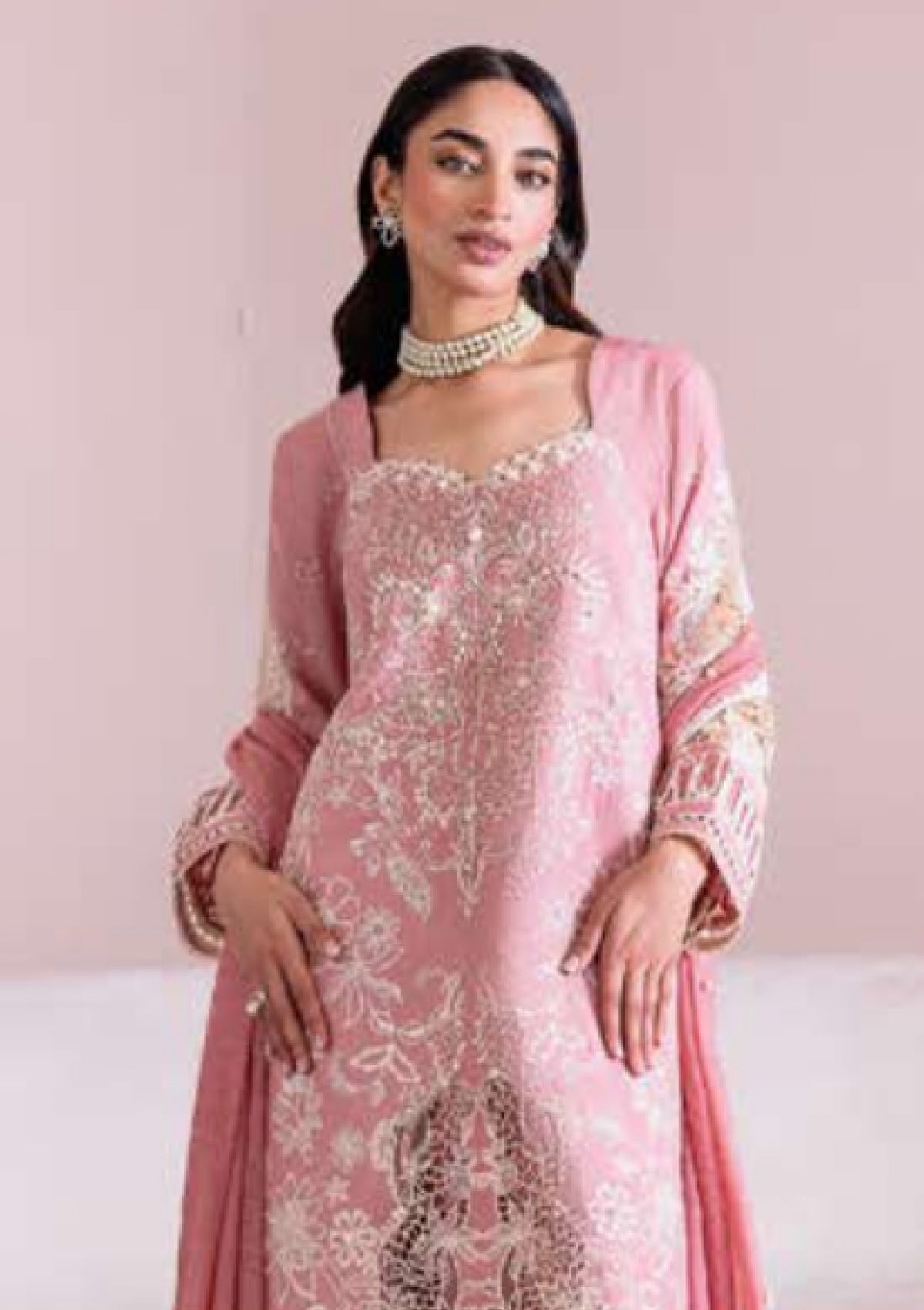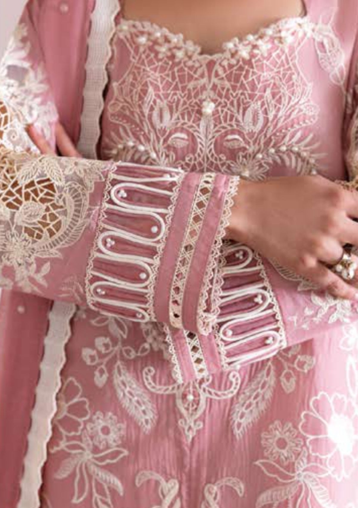 TEAROSE carries the gentle charm of a spring garden, blending with timeless appeal. A soft blush base is adorned with dainty floral embroidery in a classic ivory complimented with cutwork patches on the hemline and sleeves. Paired with solid cambric trousers, the ensemble moves with effortless ease. The faint cotton net dupatta sprinkled with a pearl spray, adding a delicate feminine touch.
