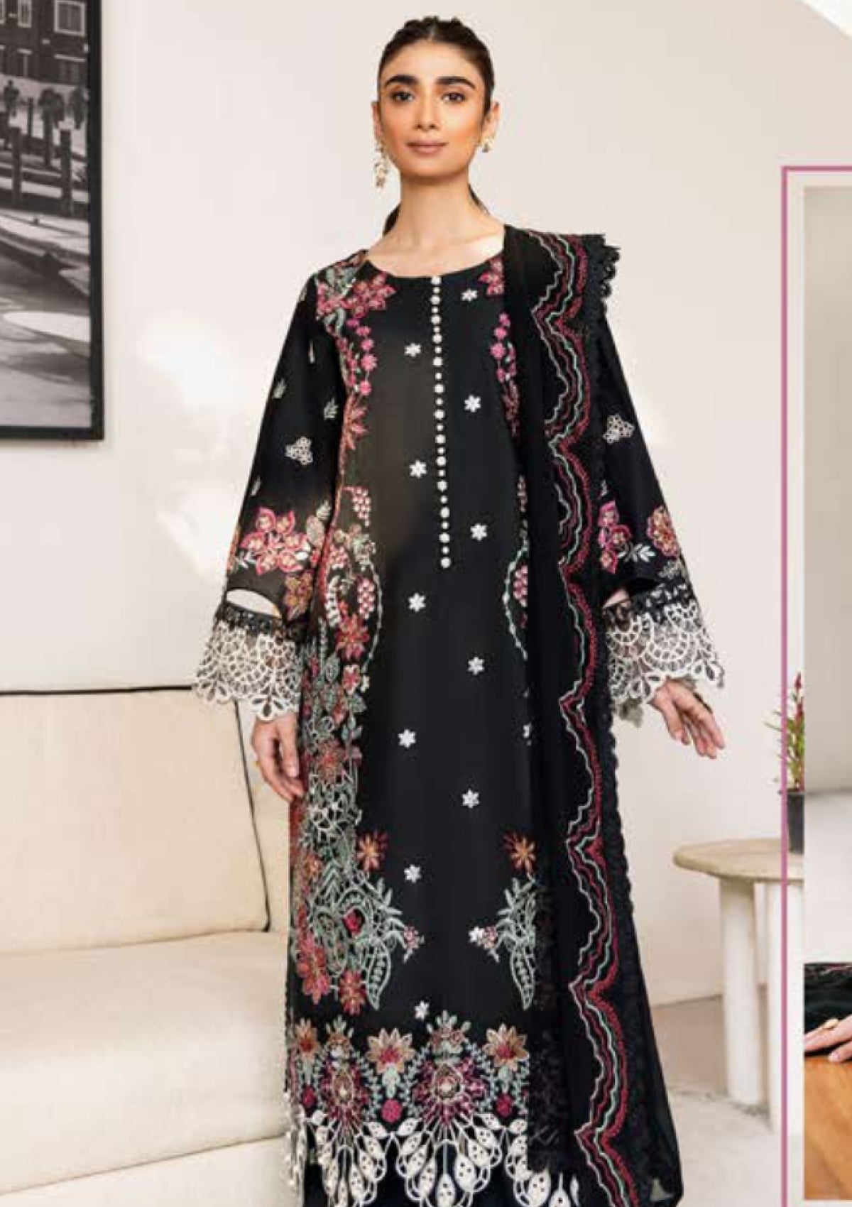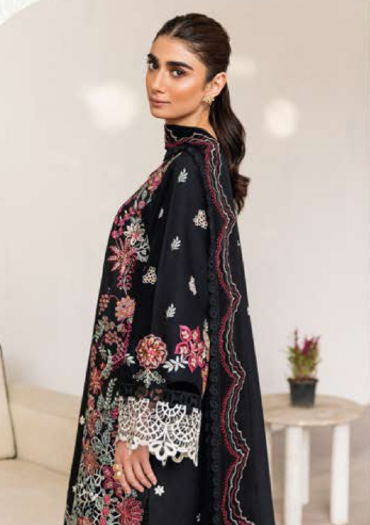 Midsummer Night is a botanically inspired black outfit, beautifully adorned with multi-hued floral embroideries that bloom across the shirt. Detailed stitch variations and cutwork on the borders, hem, and sleeves add texture and charm. A complimenting embroidered chiffon dupatta and a solid trouser complete a quintessential feminine silhouette.
