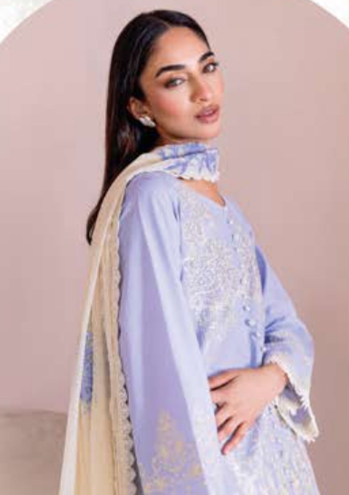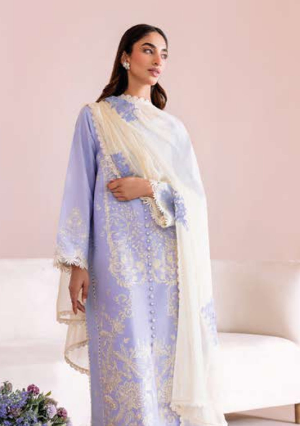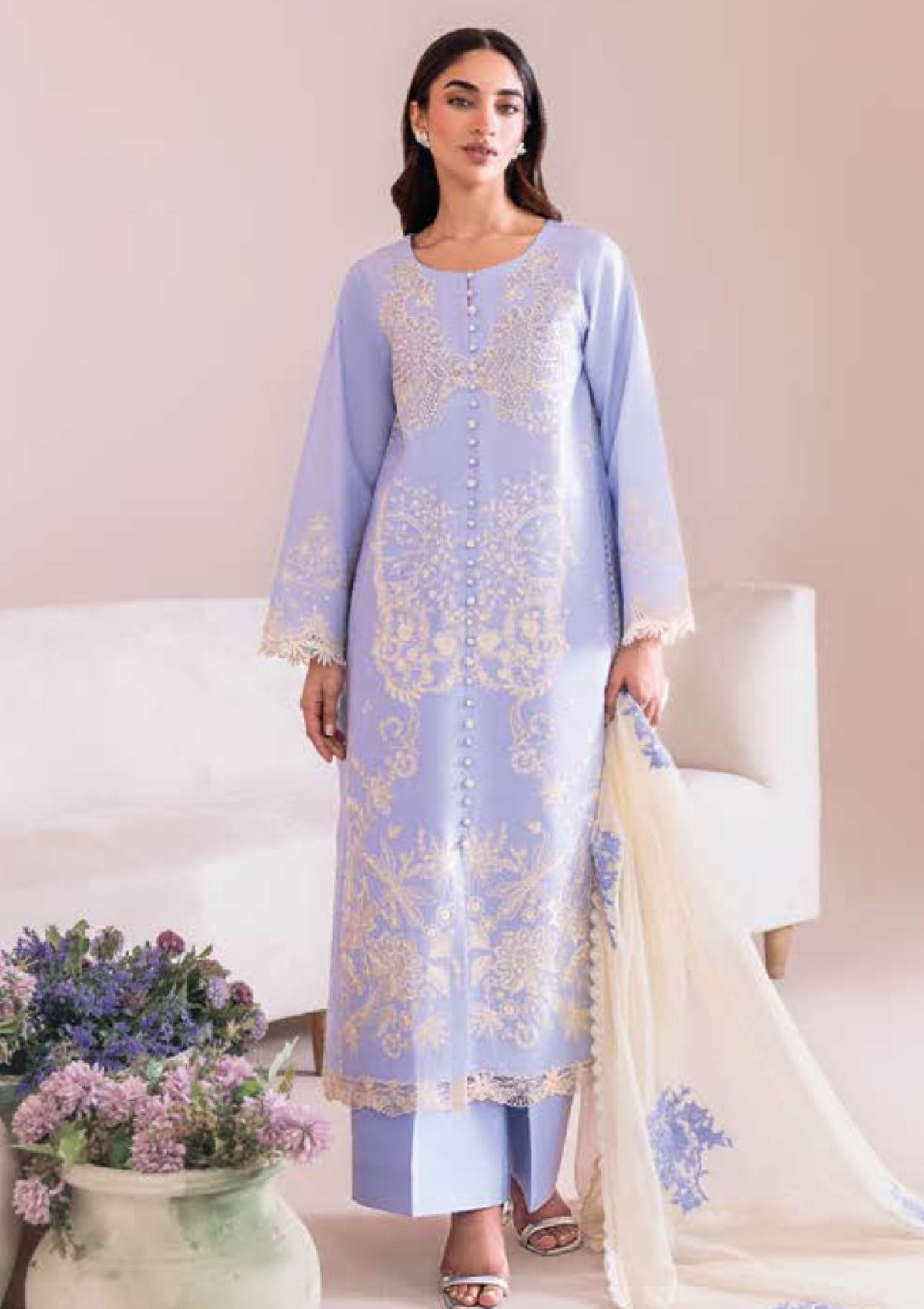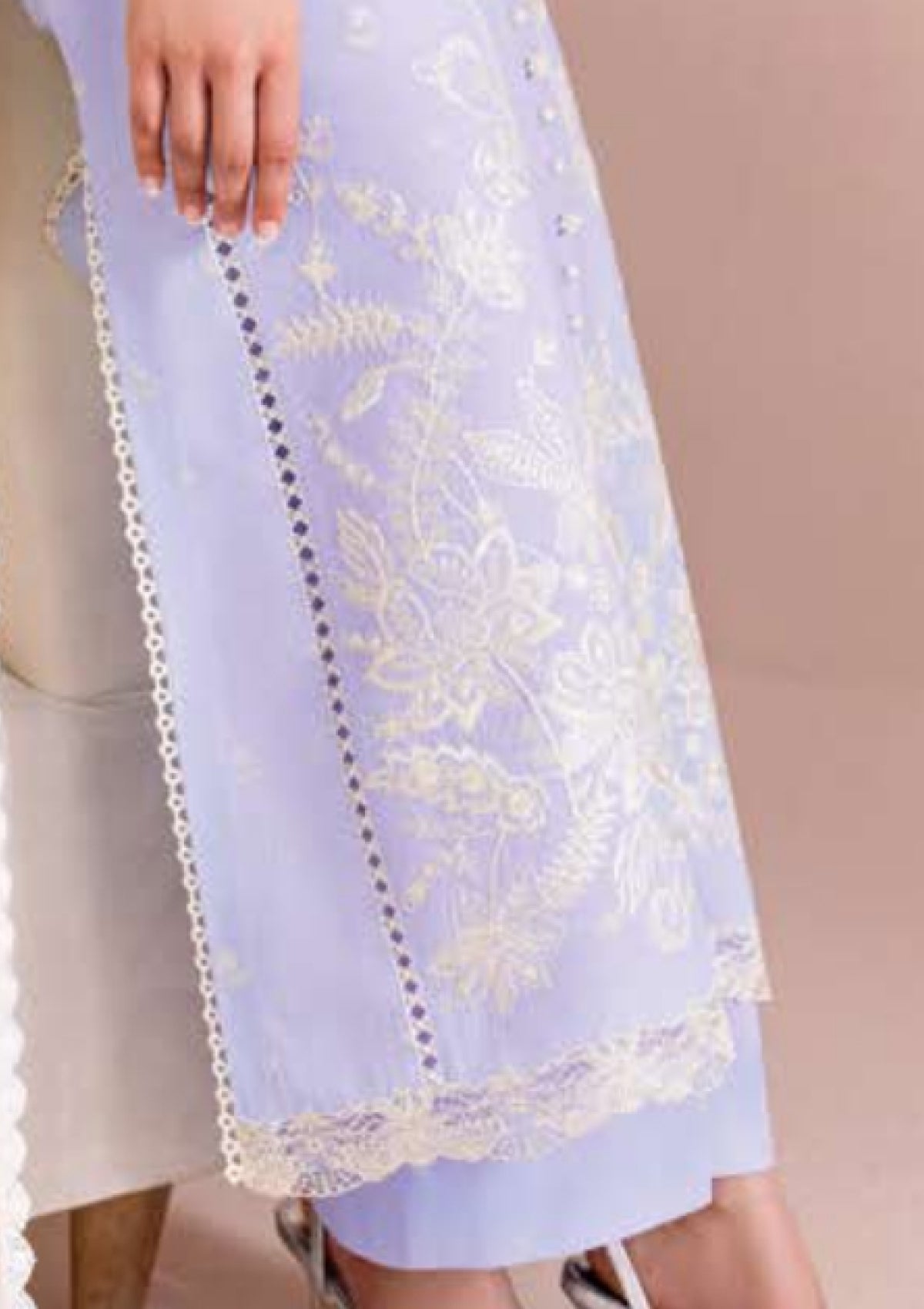 Iris is a thoughtfully designed silhouette based on the lawn base in an appealing periwinkle hue. The shirt is fashioned with cream embroidered panels further elaborated with cutwork embroidered organza patches & borders for neckline & hem. A classic cambric trouser and a beautiful chiffon dupatta embellished with floral embroidered organza motives makes it a quintessential number for your summer closet.