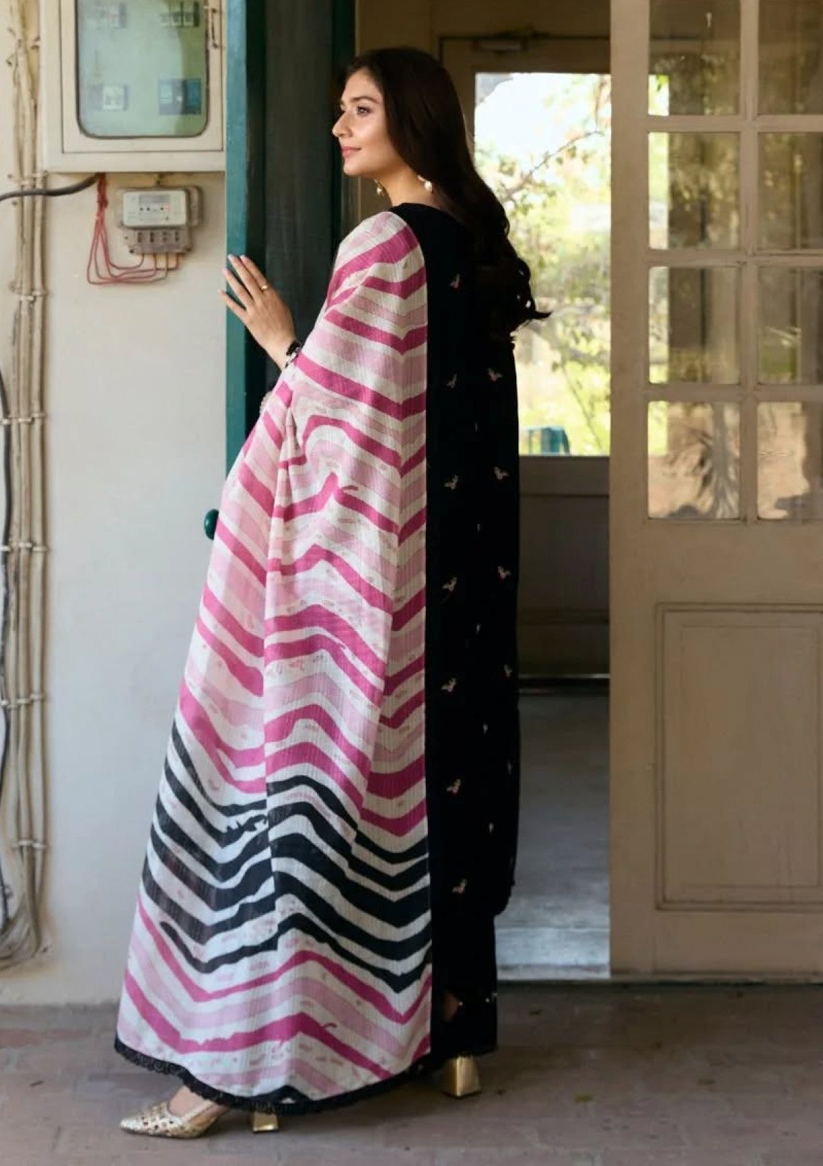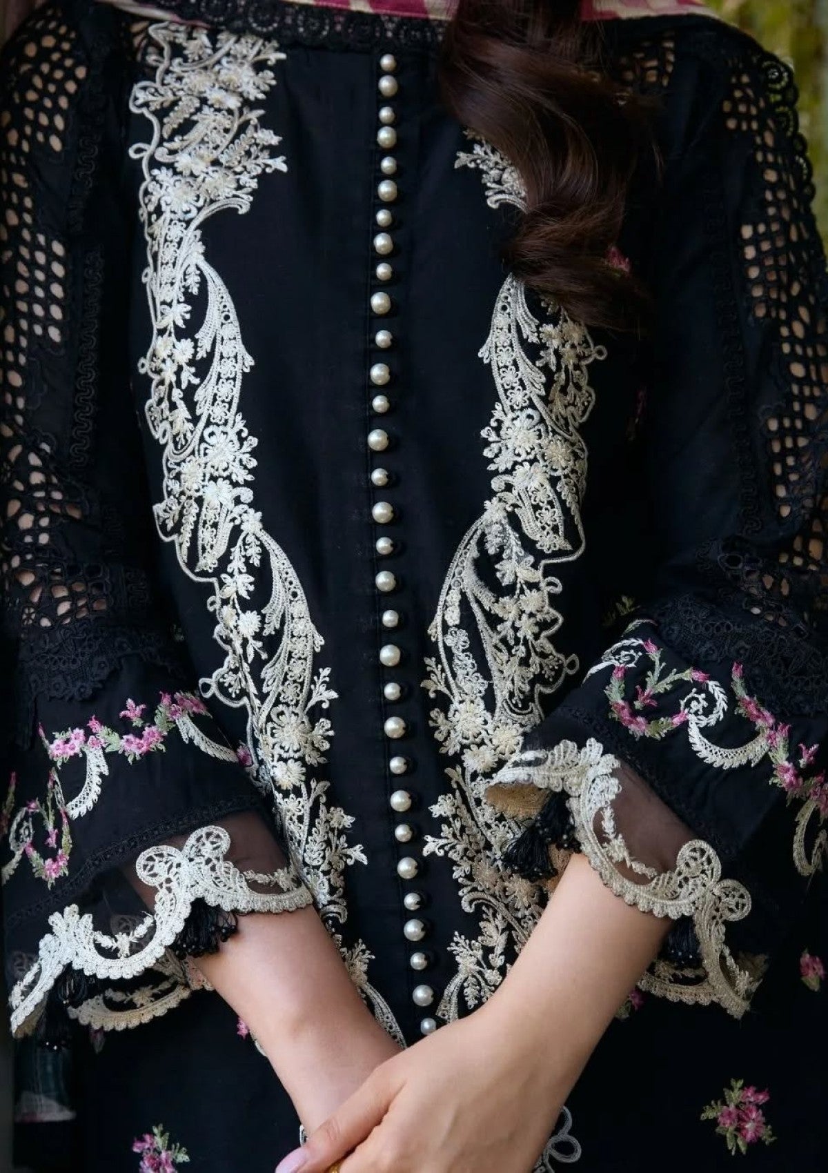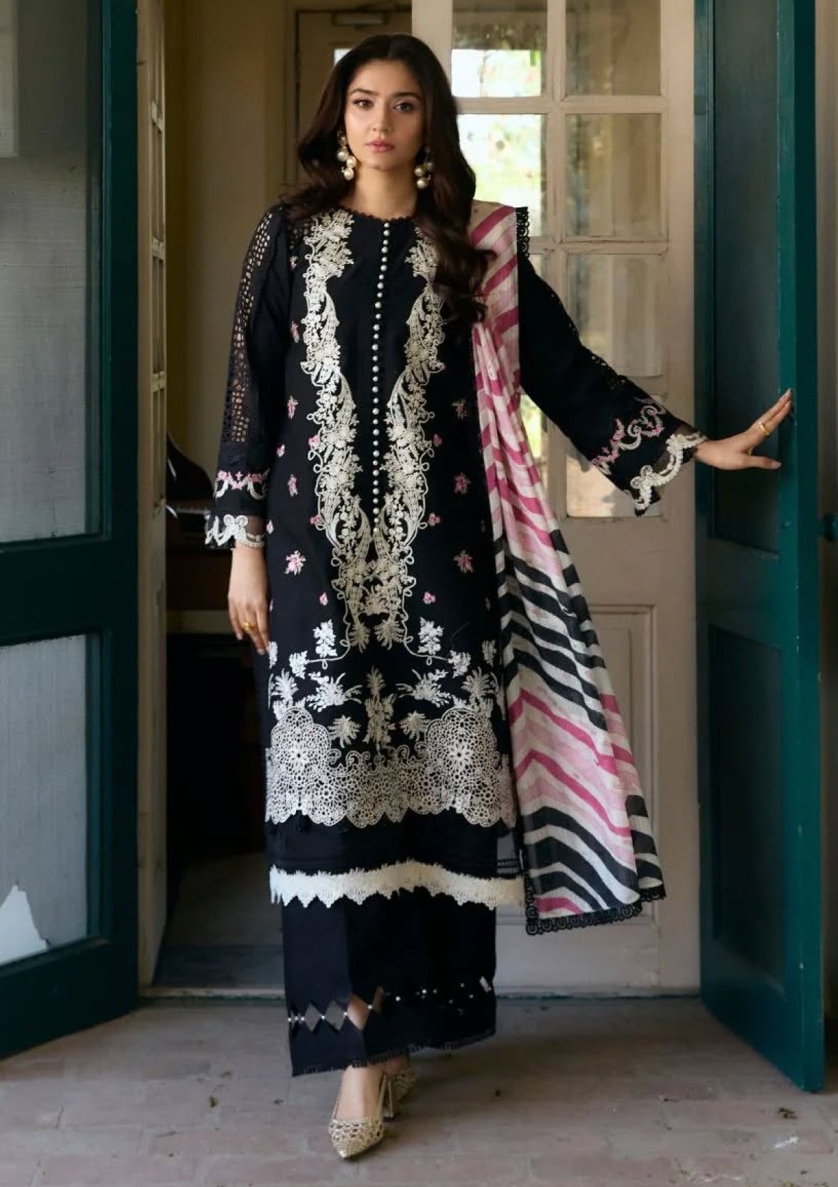 A classic black 3-piece unstitched lawn number, adorned with cream embroideries across the canvas and highlighted with cutwork schiffli on the sleeves. The delicate floral bunches in shades of white, pink, and mint green adds a vintage feminine vibe to the shirt. Paired with a solid black cambric trouser and a bold chevron-printed, self-embossed voile dupatta, this outfit is a staple for summer soirees.