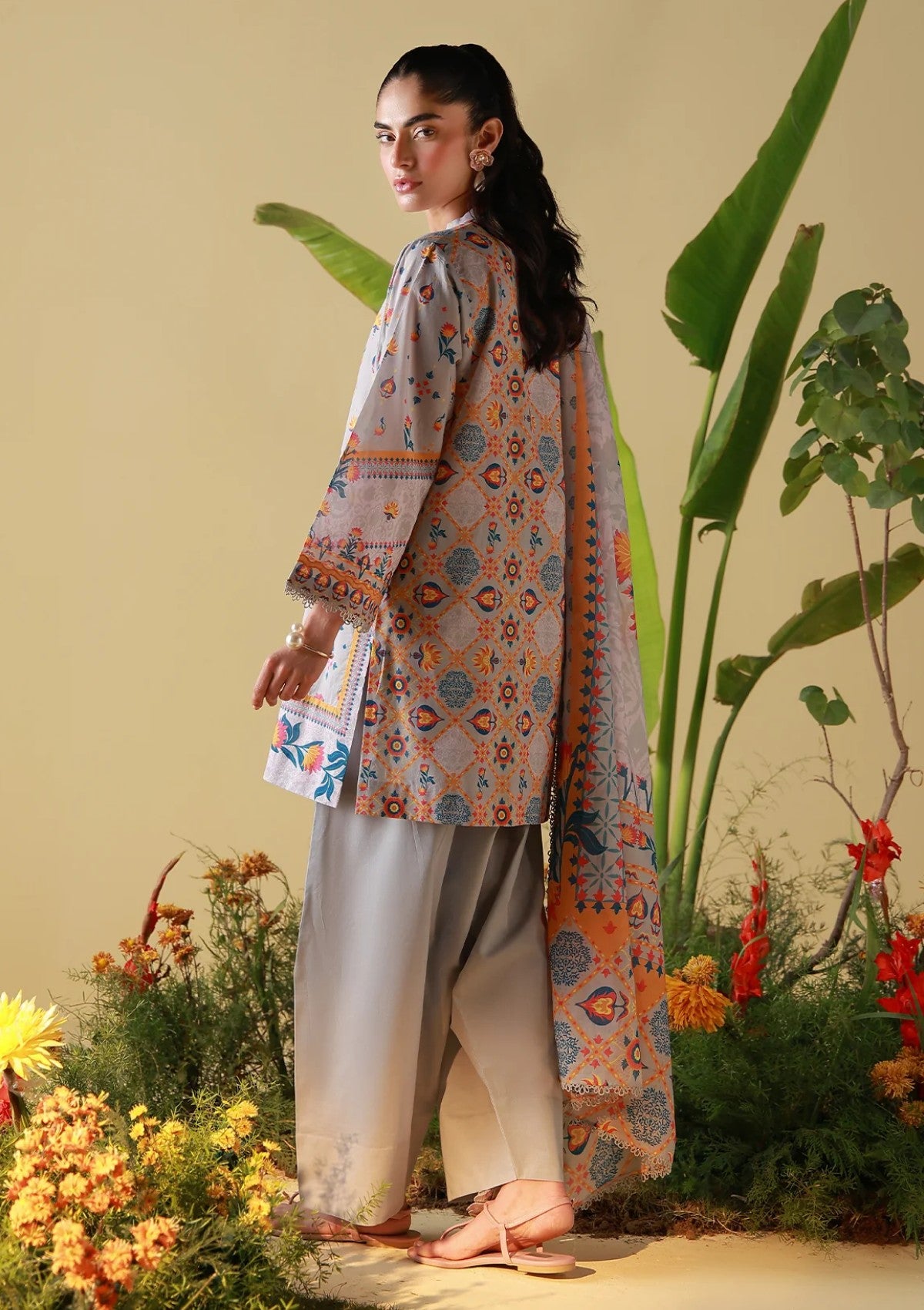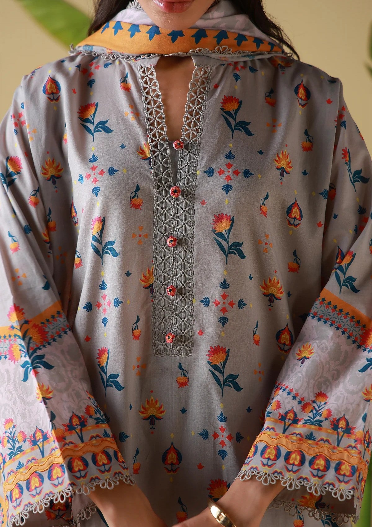 A cool grey base animated with intricate folkloric motifs in warm and cool tones. Balanced with neutral pants and a statement dupatta for visual interest. Artistic, versatile, and quietly distinctive.
