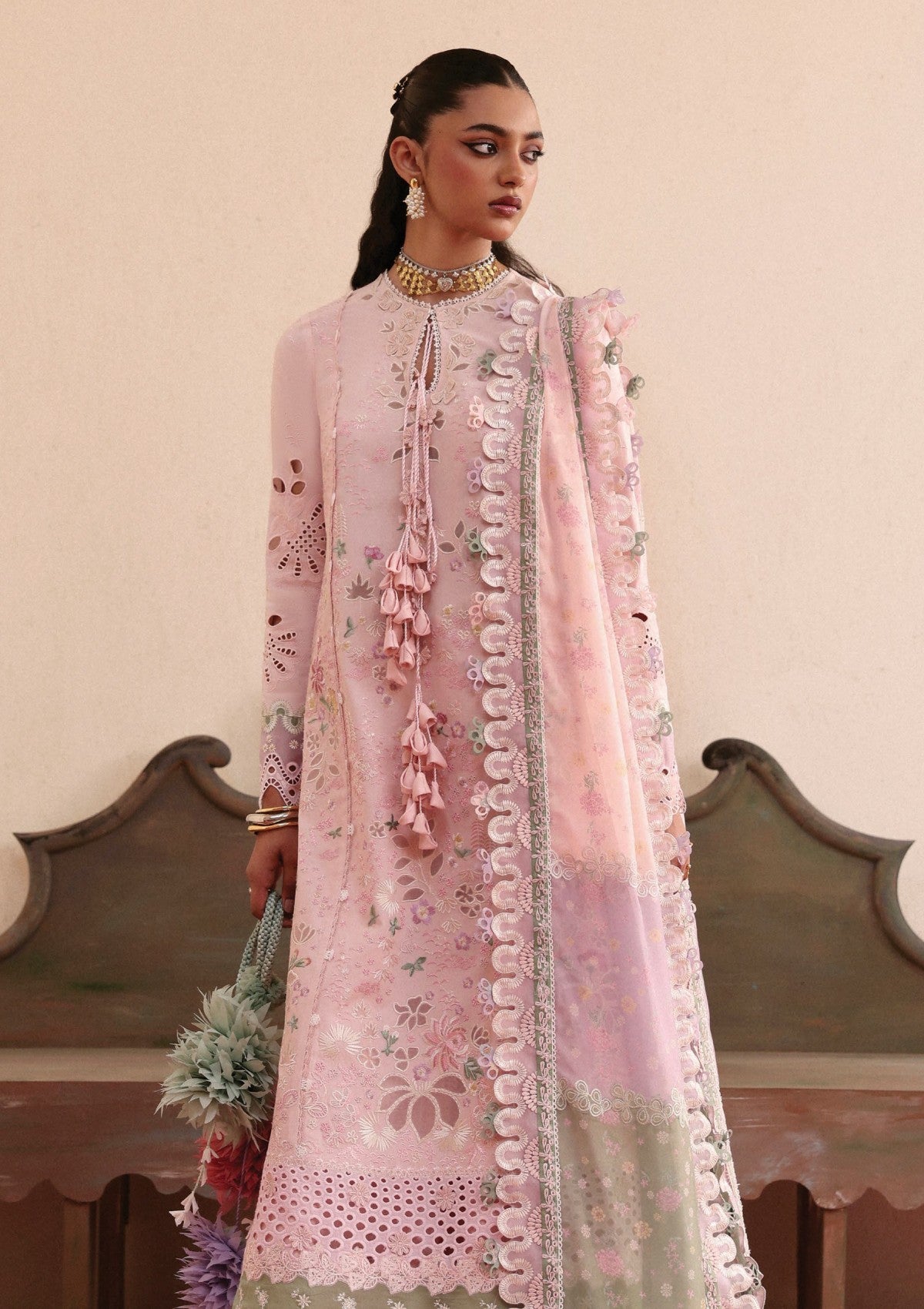 Embrace the essence of renewal this season with our upcoming collection, where tradition meets elegance. Leena is exquisite in three-panel lawn, in soft powder pink with delicate pastel floral motifs, embodying the spirit of summer and the fresh blooms of spring. The finely crafted embroidered organza patch and bordered dupatta add a touch of luxurious charm, making every moment feel like a celebration of class and heritage. Pair it with our classic plain cambric trousers to complete your chic look.