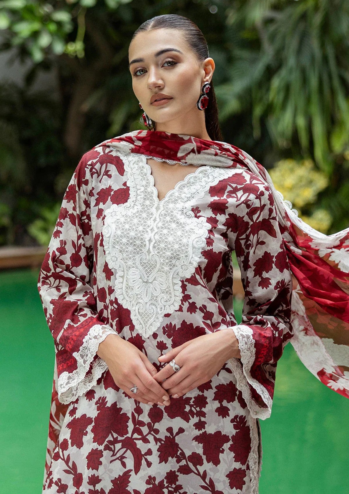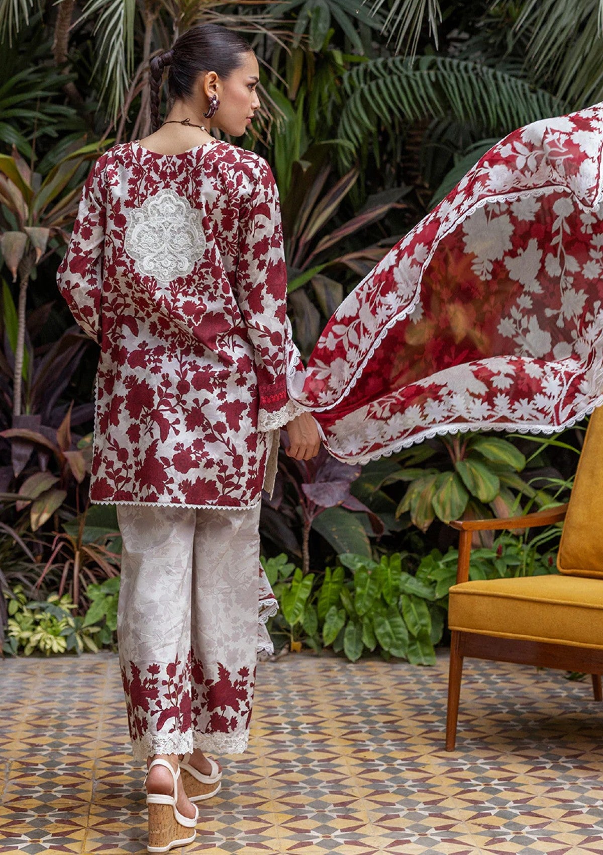 Discover Ruhi, an unstitched design from Zainab Chottani's new Lawn Collection, Volume 2, that embodies classic radiance. This beautiful piece features a rich, deep red and white floral print on soft, premium lawn fabric, creating a timeless appeal. The touch of luxury comes from the intricate white embroidery that gracefully highlights the neckline, adds elegance to the sleeves, and defines the borders, enhancing the striking print.