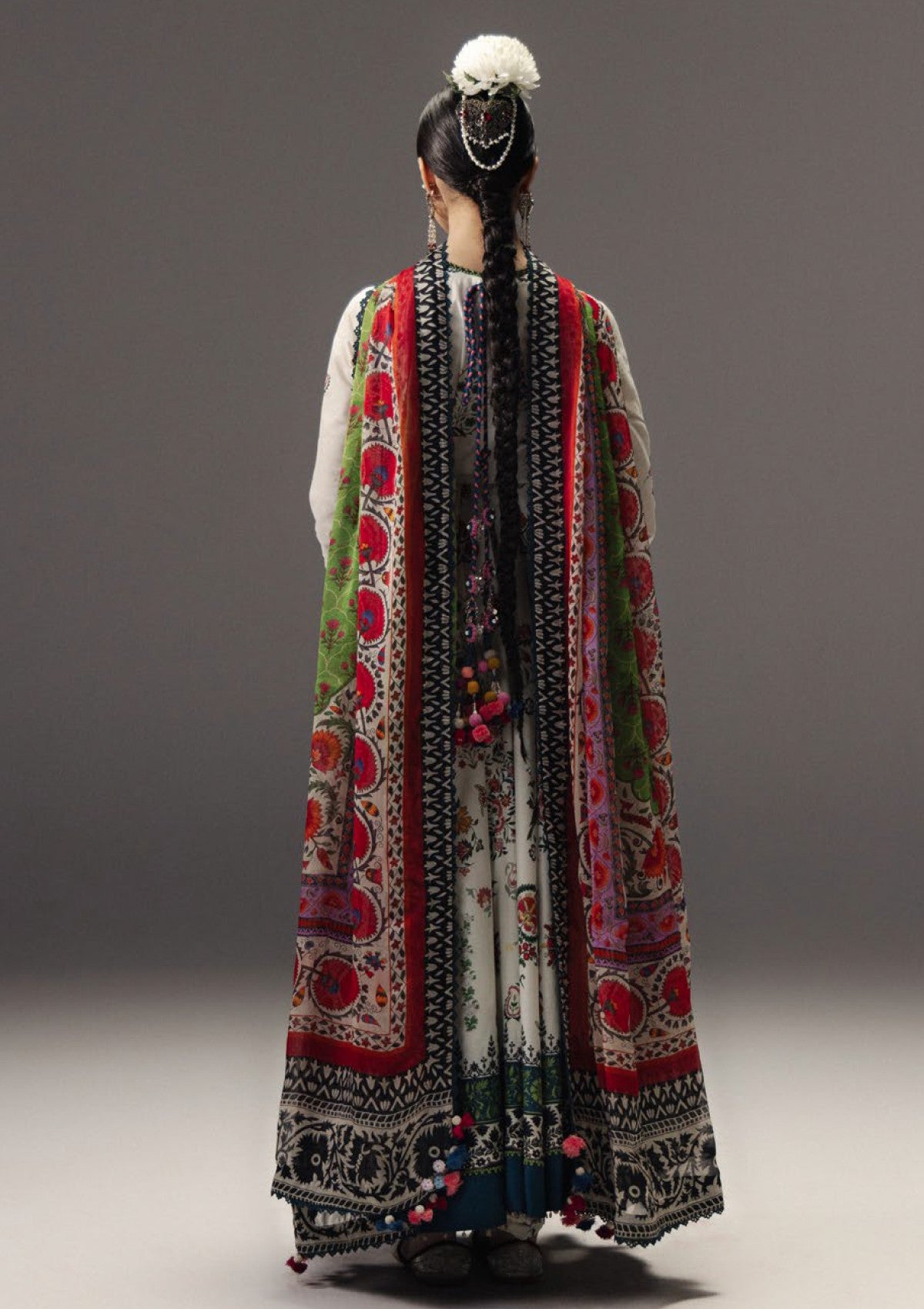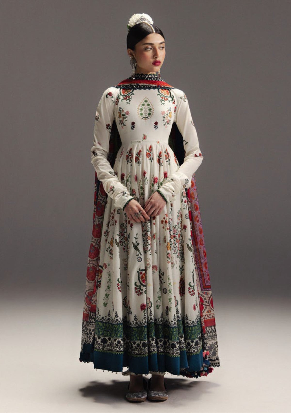 Mehruba is a sophisticated Anarkali crafted on a deep off-white base, featuring composed suzani floral sprays and hand-painted style paisleys that create a harmonious and artistic palette. The silhouette is enhanced by a wide-set hemline border with a unique blue-denim accent paired with traditional black-and-white ethnic scrolls, providing depth and visual intrigue. Coordinated ivory trousers with minimal floral detailing at the hem maintain a clean and balanced aesthetic, while a high-contrast moss green silk dupatta, bordered with a regal suzani-patterned frame and monochromatic outer edge, completes the ensemble. Mehruba exudes artisanal craftsmanship, timeless elegance, and contemporary heritage sophistication, making it a statement Anarkali for discerning wardrobes.