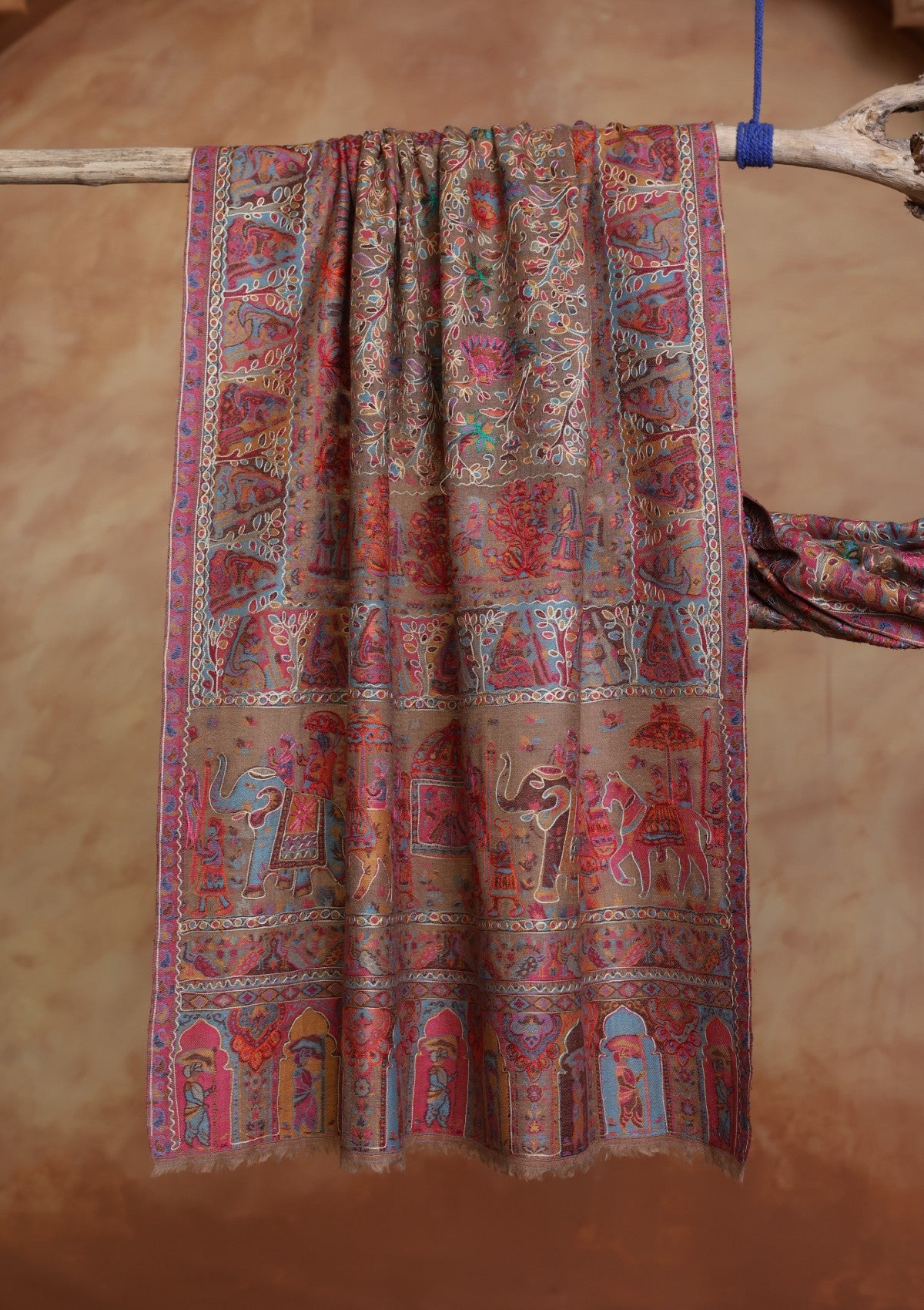 Pashmina Jamawar Ari Work Scarf D#01 - Brown