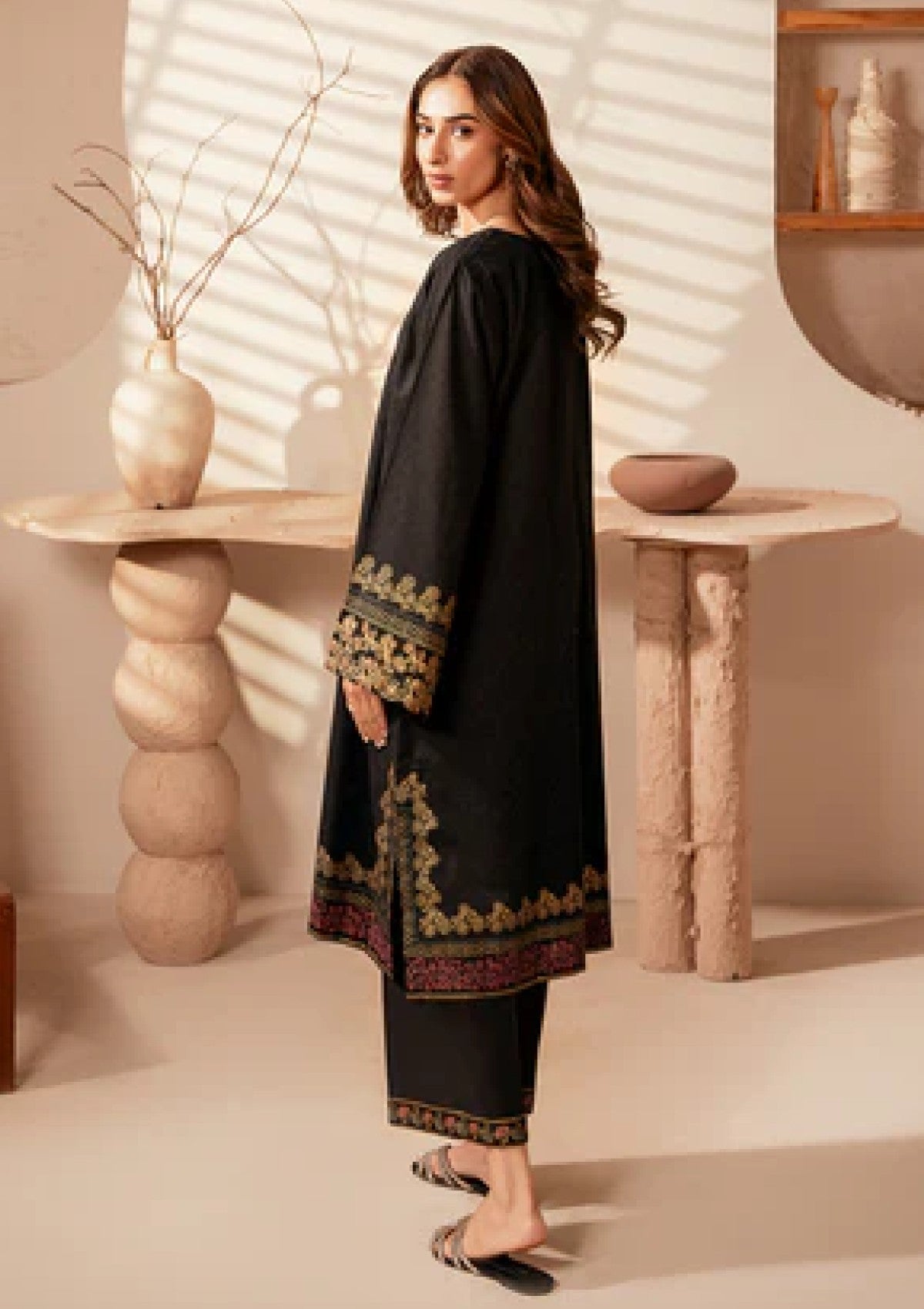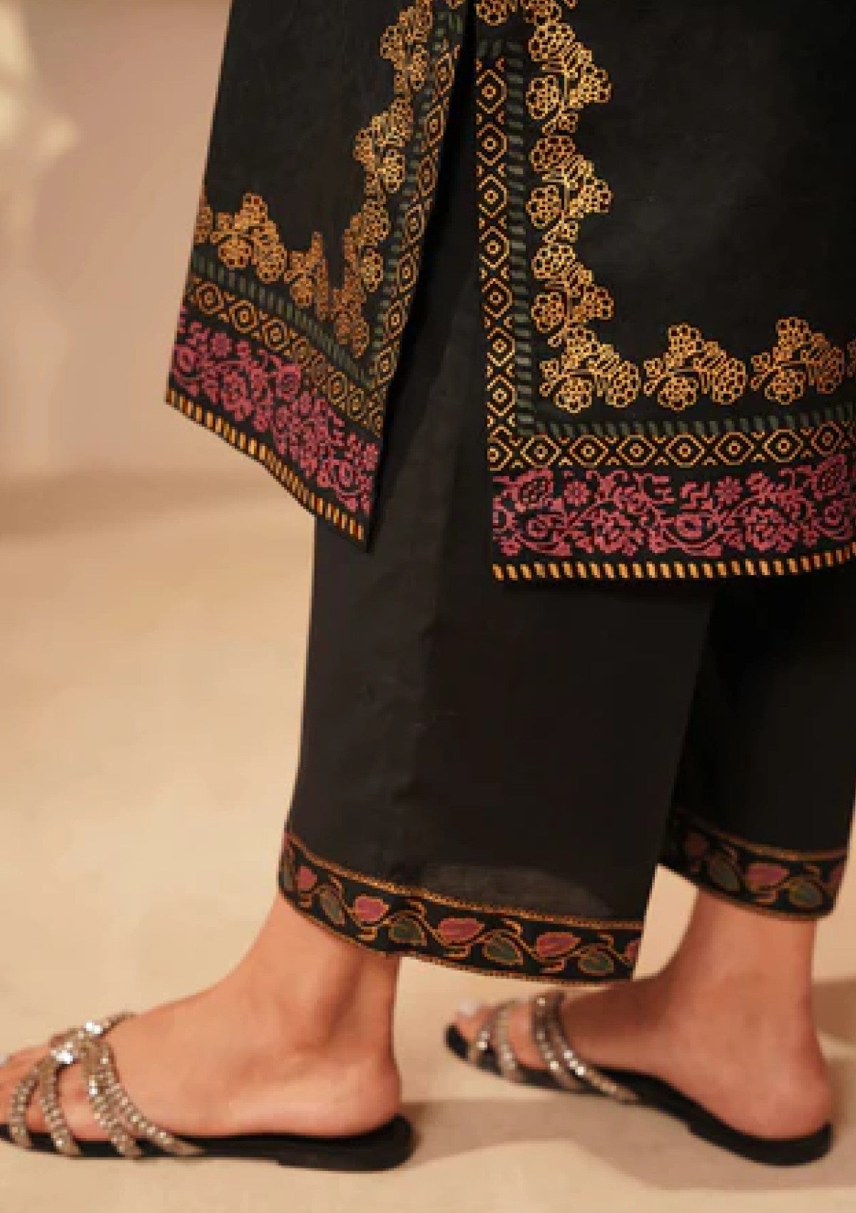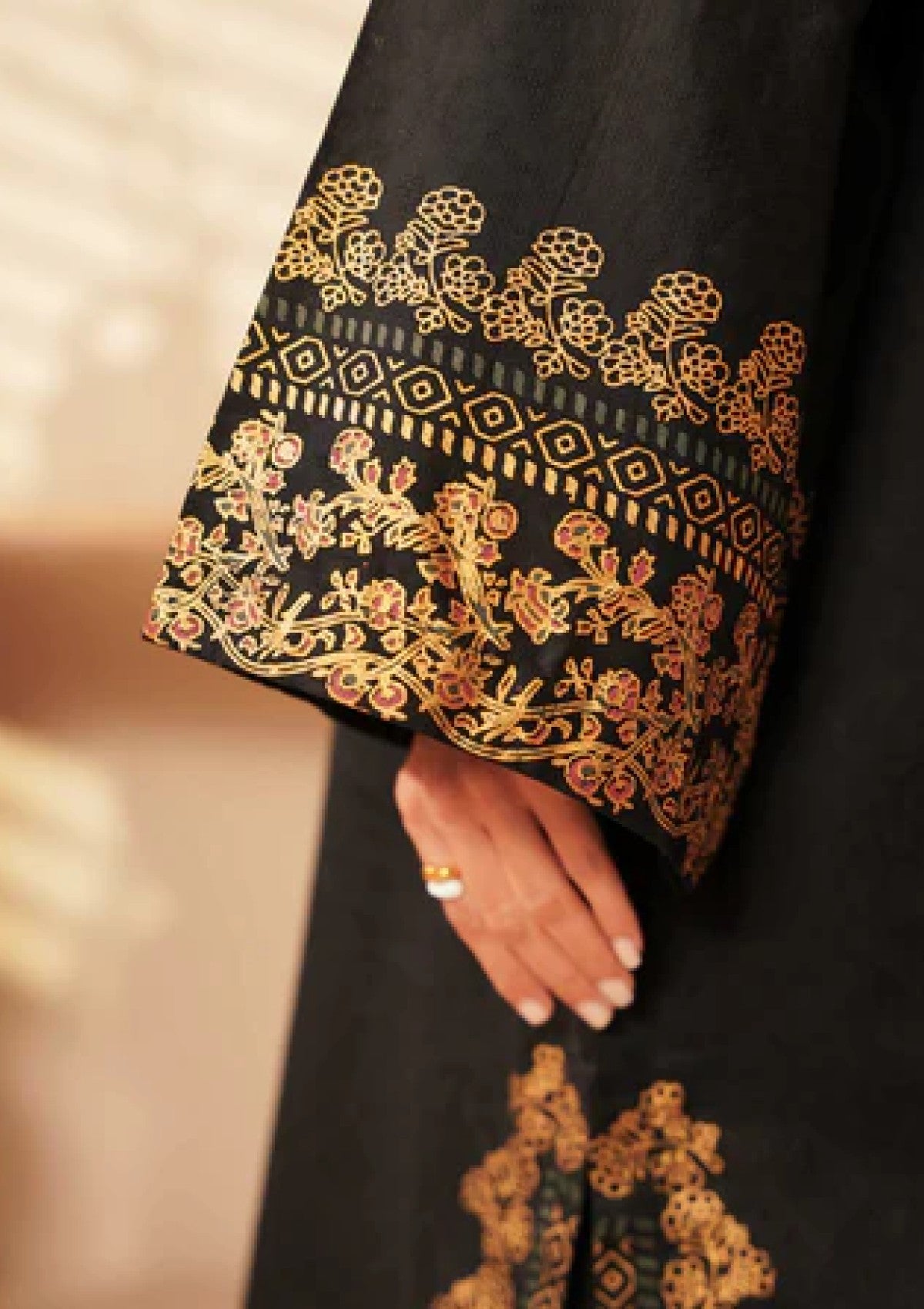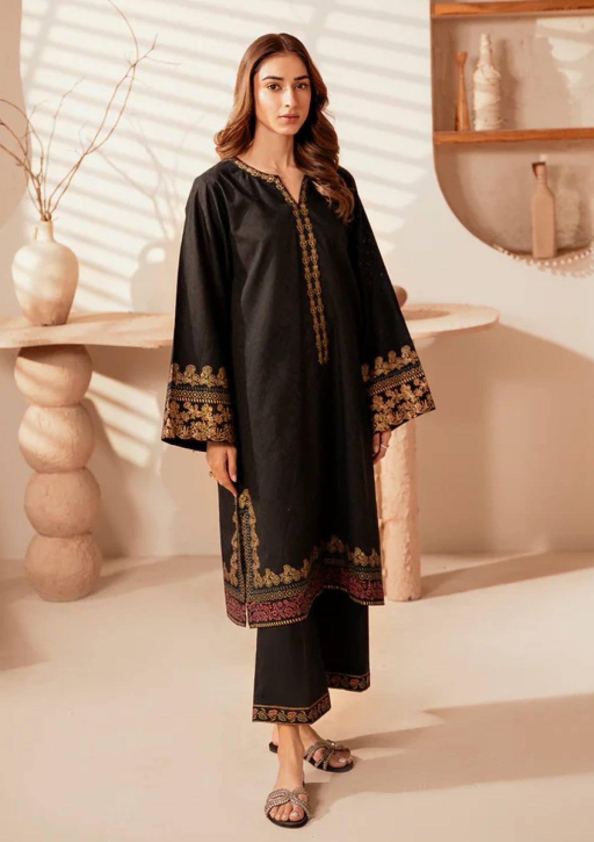 This outfit features a black shirt adorned with elegant gold block printing, creating a striking contrast that adds a touch of luxury and sophistication. The self-jacquard fabric gives the shirt a refined texture, while the gold print enhances its visual appeal, making it perfect for those who appreciate a bold yet classic style. Paired with comfortable cotton pants, this ensemble balances elegance with all-day comfort. The breathable cotton fabric ensures ease of movement, making this outfit ideal for both semi-formal and casual occasions. This combination of black and gold exudes timeless style and modern flair.