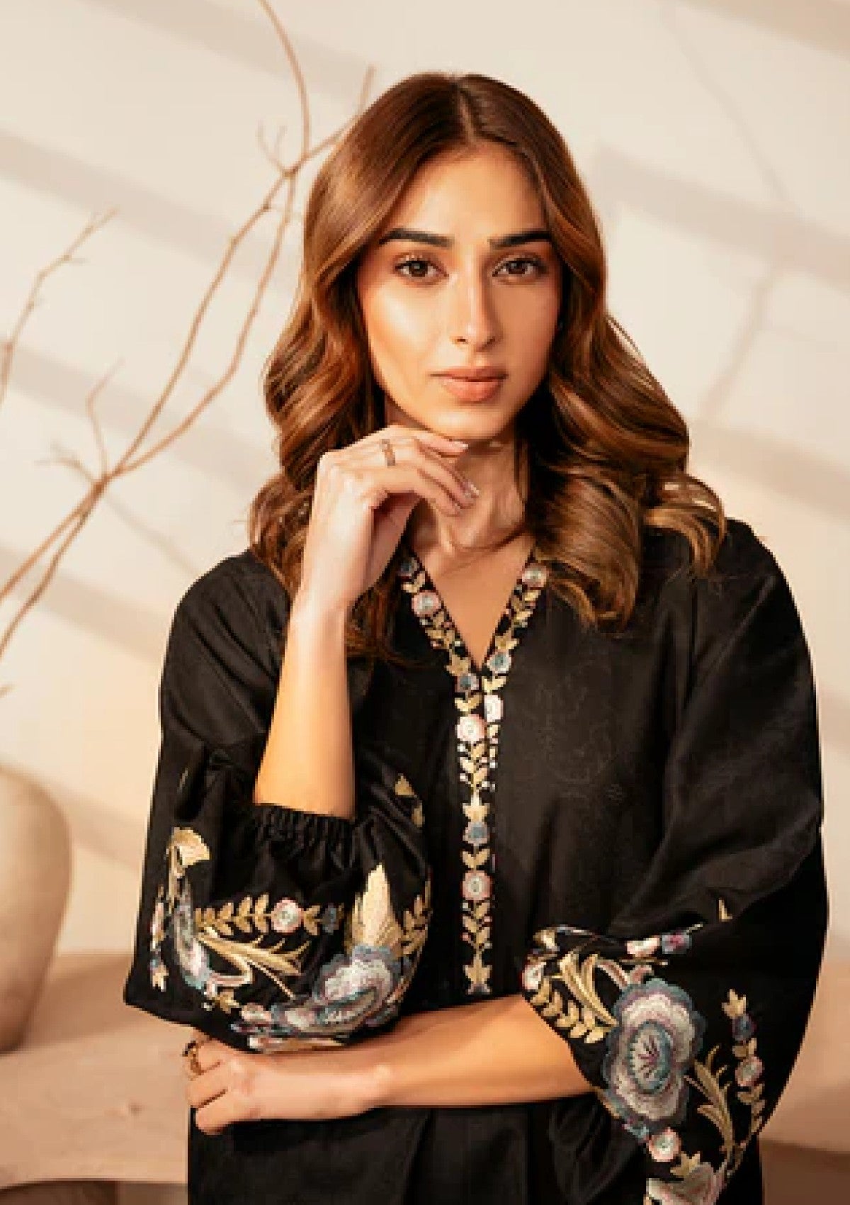 This outfit features a classic black shirt made from self-jacquard fabric, offering a smooth texture with a subtle, refined pattern that adds depth to its sleek design. The shirt's black color provides a versatile, timeless look, making it easy to pair with various styles. It is complemented by breathable cotton pants, known for their softness and relaxed fit. The cotton material ensures comfort throughout the day, while the self-jacquard shirt elevates the overall look. This ensemble is perfect for those seeking a stylish yet comfortable option for both casual and semi-formal occasions.