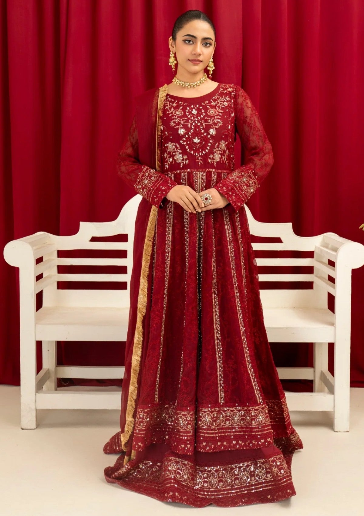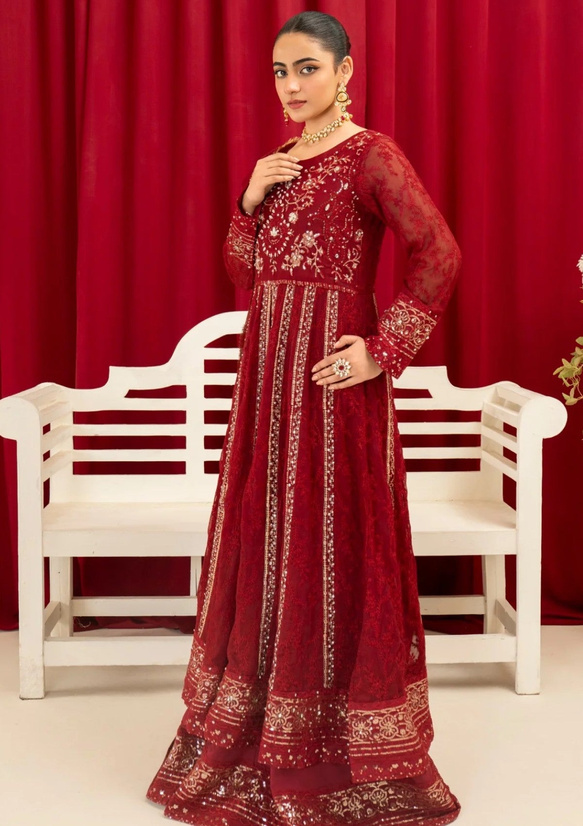 There is exquisite embroidery work in vertical patterns, which exudes grace and elegance, is a marvel of craftsmanship and design. The designer's exquisite use of the zari, Sitara, stone work , and sequin embroidery technique enhances this lovely dress. A gorgeous chiffon dupatta with a kiran lace border completes the ensemble. Make use of Mona Embroidery to showcase your individual style and embrace it.