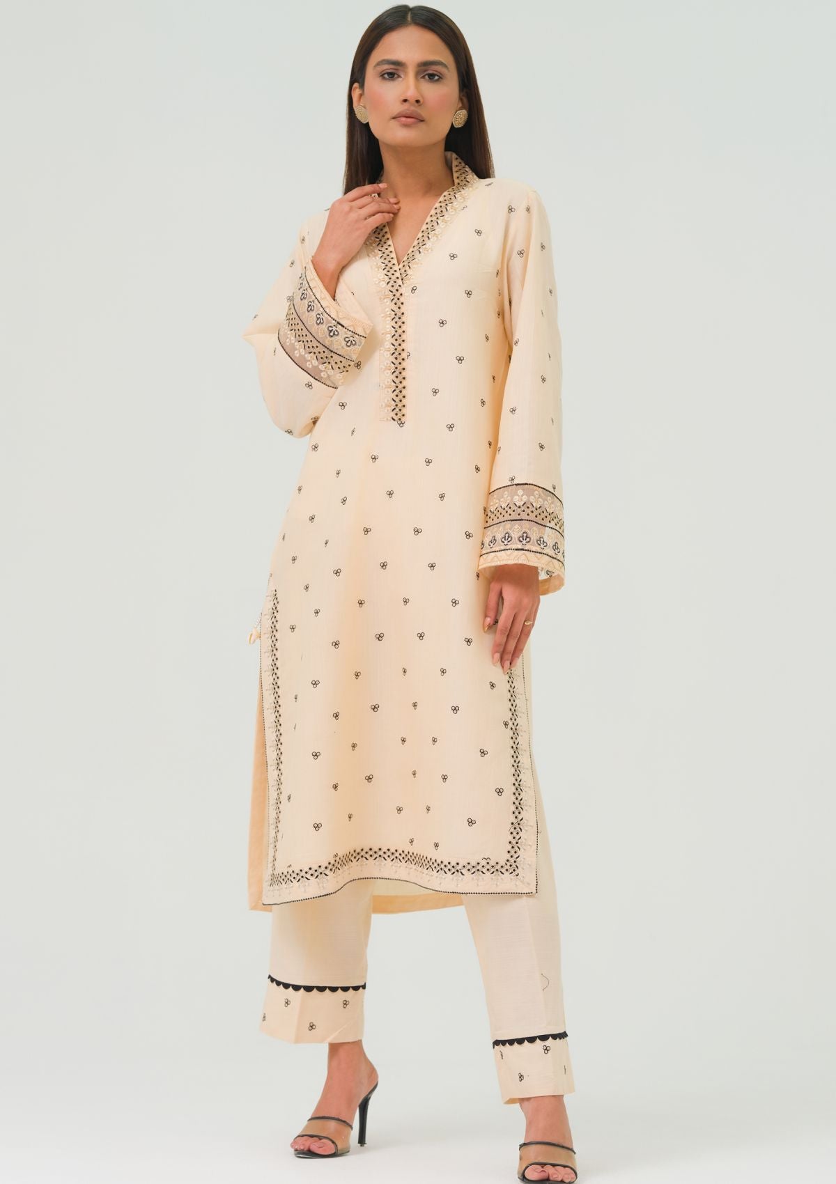 The dress is off-white with a soft, creamy hue that provides a classic and understated base. It features intricate black embroidery that adds striking contrast and detailed patterns to the fabric. This mirror work catches and reflects light, creating a subtle sparkle and adding a touch of glamour to the dress. The combination of the off-white color, black embroidery, and mirror accents results in a refined and elegant piece that balances simplicity with a hint of dazzling detail.