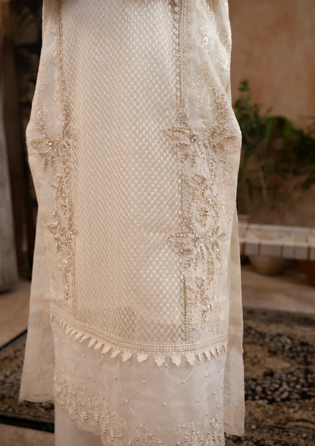 This exquisite Festive/Party Wear 3 piece Kurta Set in Off-White features a short Kurta top with embellished detailing, paired with Plazzo bottom in luxurious Raw Silk fabrics. The set includes a matching Dupatta for added elegance. Perfect for all seasons, this ensemble exudes grace and sophistication. Brand: Manahils.