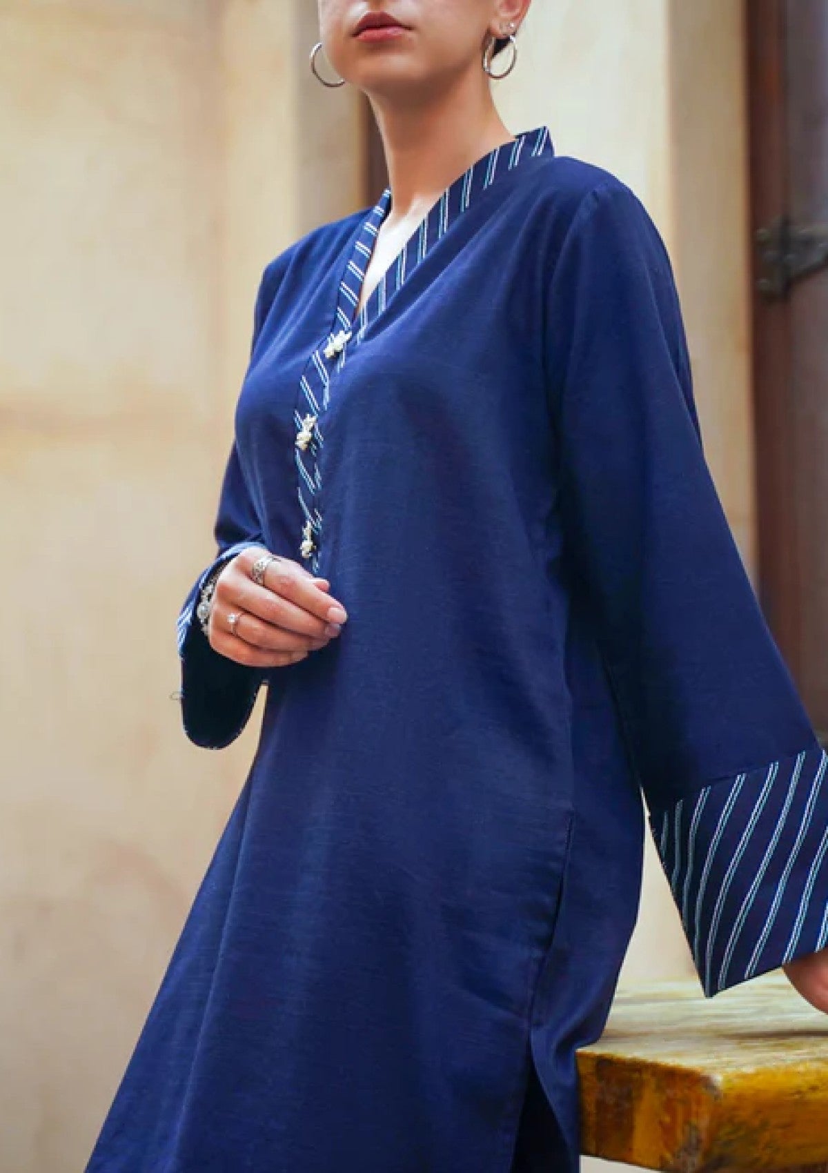 Gracefully combining classic Khaddar navy with exquisite embroidery along the sleeves and neckline, this piece is finished with a soft lace trim for a touch of timeless elegance and refined femininity.