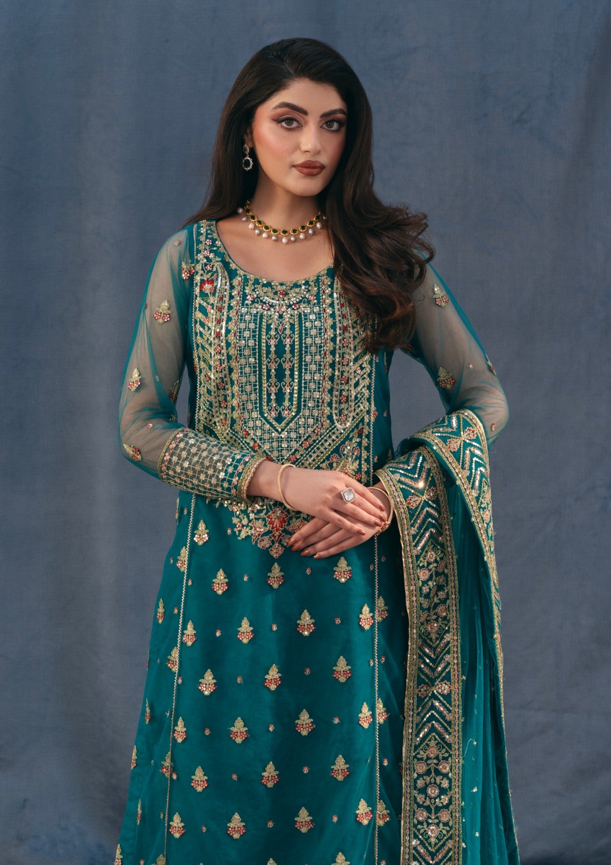• Shirt: Made of net fabric, the shirt is adorned with intricate embroidery in gold and subtle embellishments, giving it a regal and luxurious look.