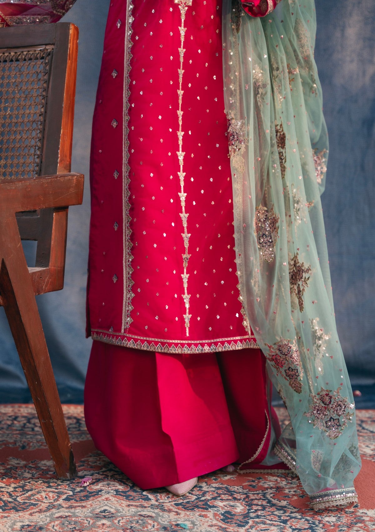 • Dupatta: A sheer mint-green dupatta decorated with floral motifs and embellished borders, adding contrast and sophistication to the outfit.